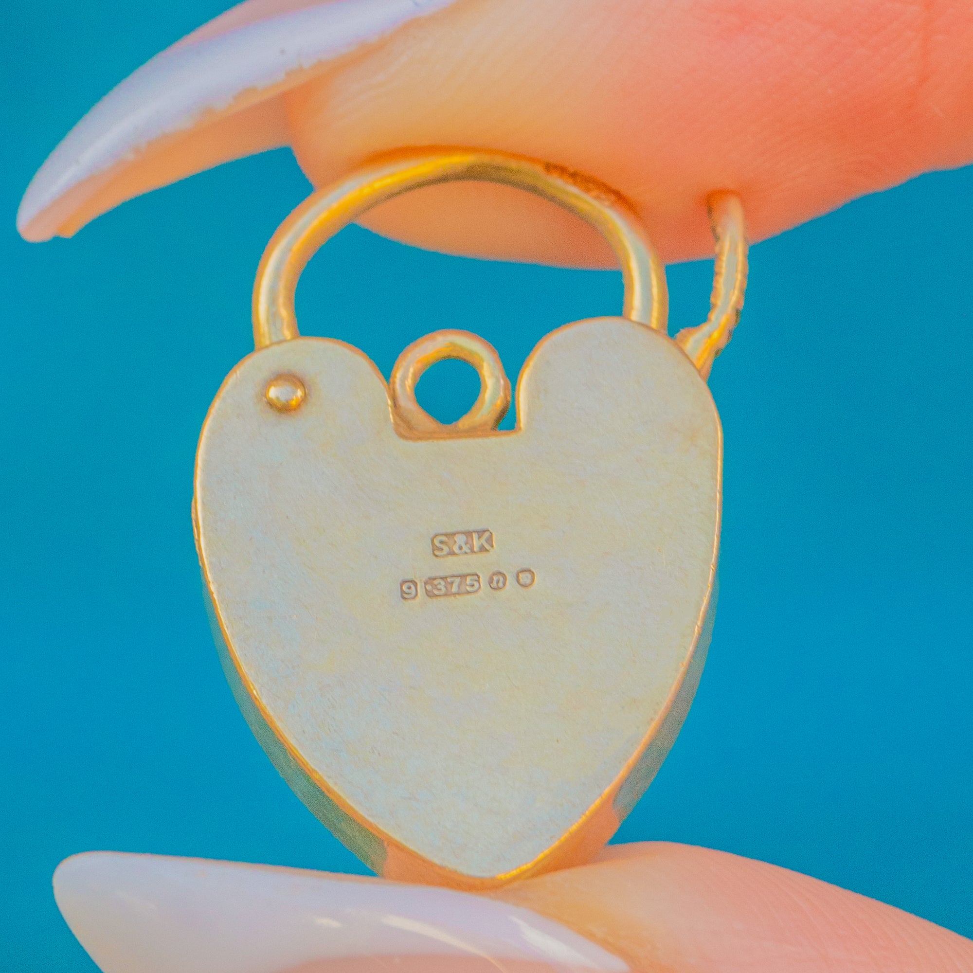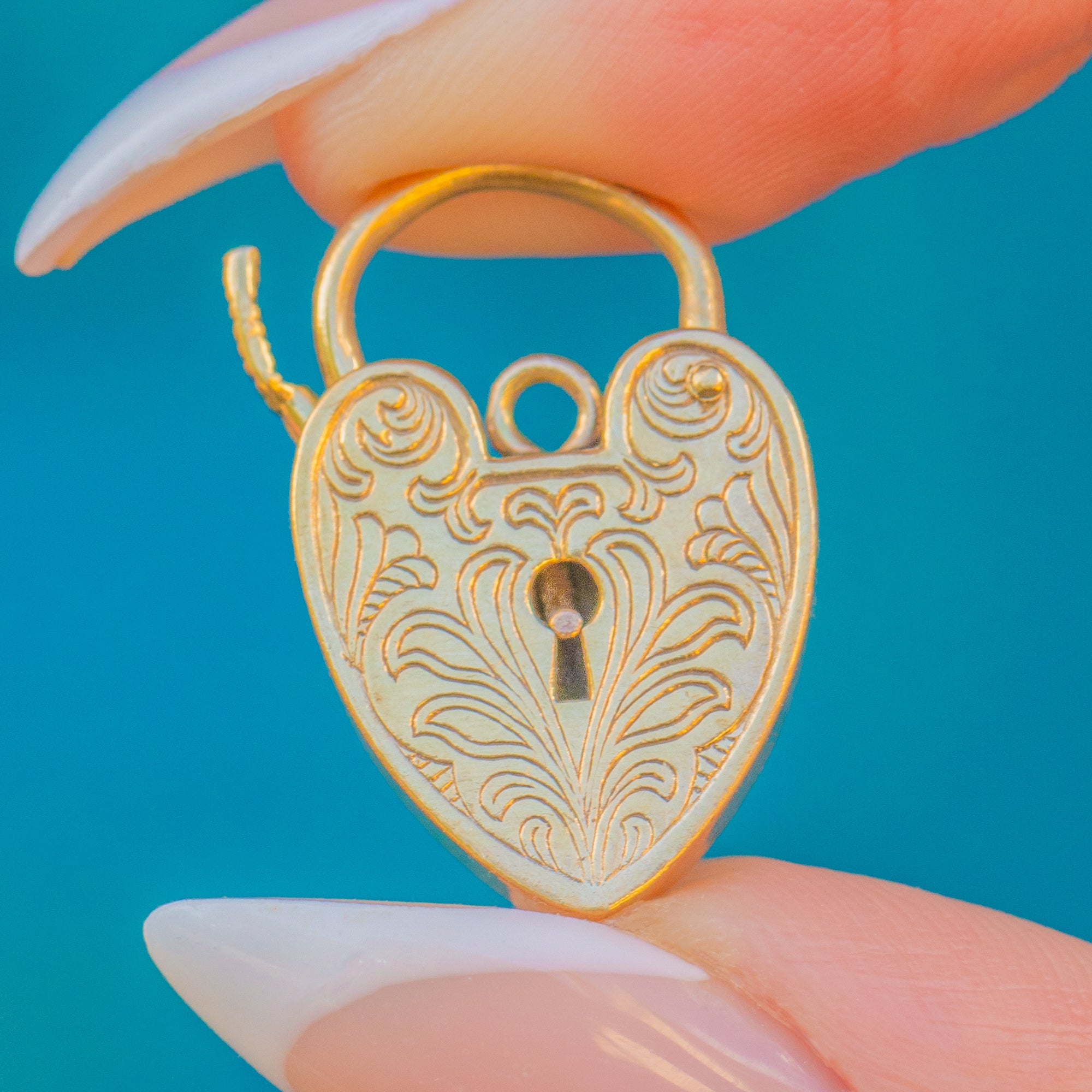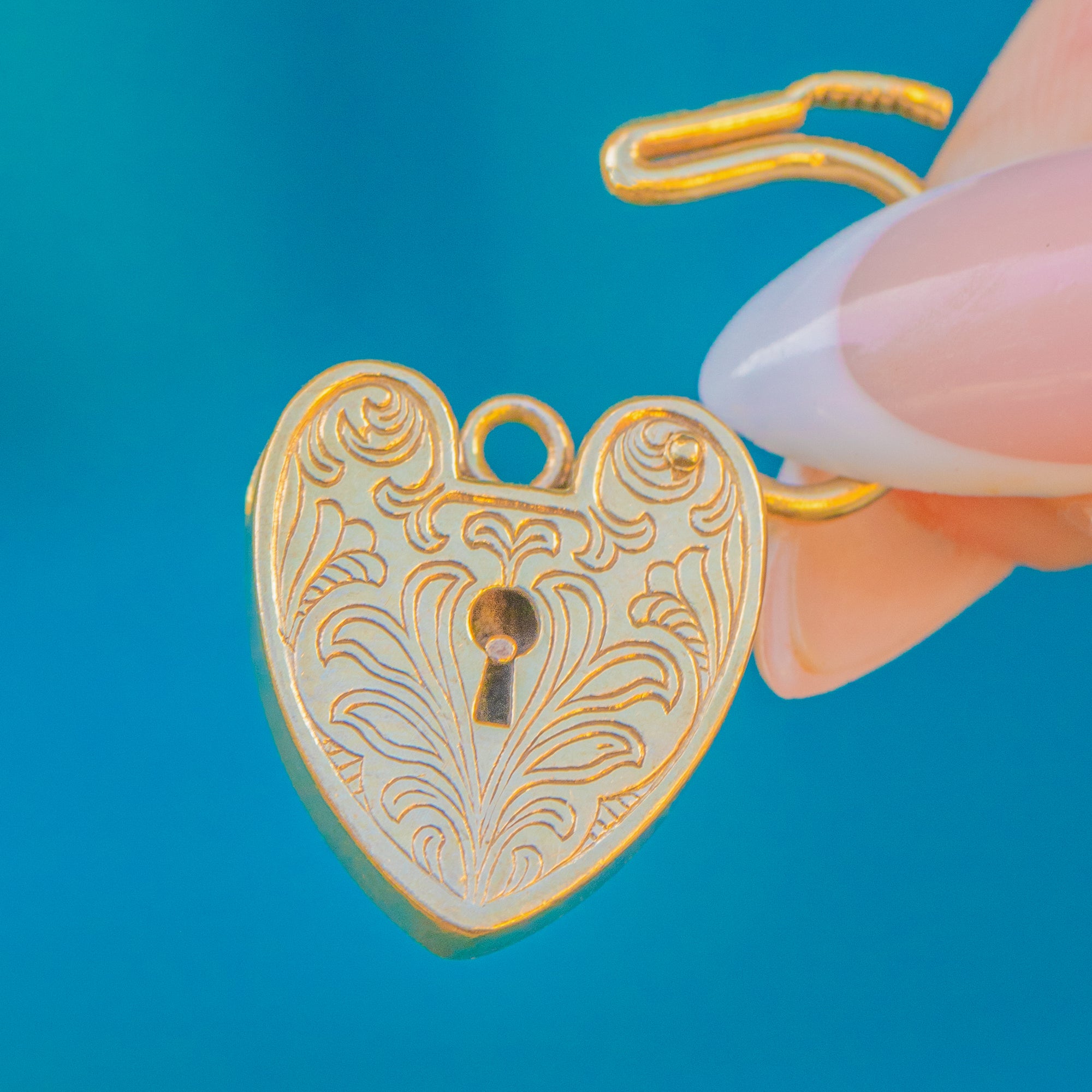 A charming Mid-Century Vintage heart padlock pendant crafted in solid 9ct Gold. The piece is beautifully engraved to the front with scrolling detail and opens via a hinged lever, stamped to match. With its warm gold tone and romantic design, this pendant is perfect worn on a chain or as part of a traditional bracelet.