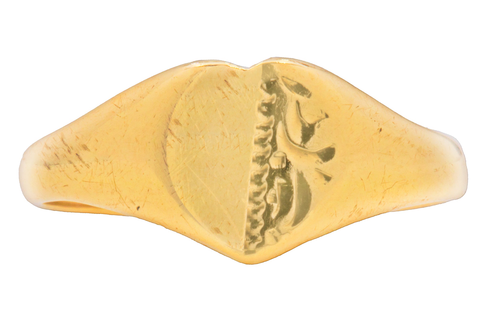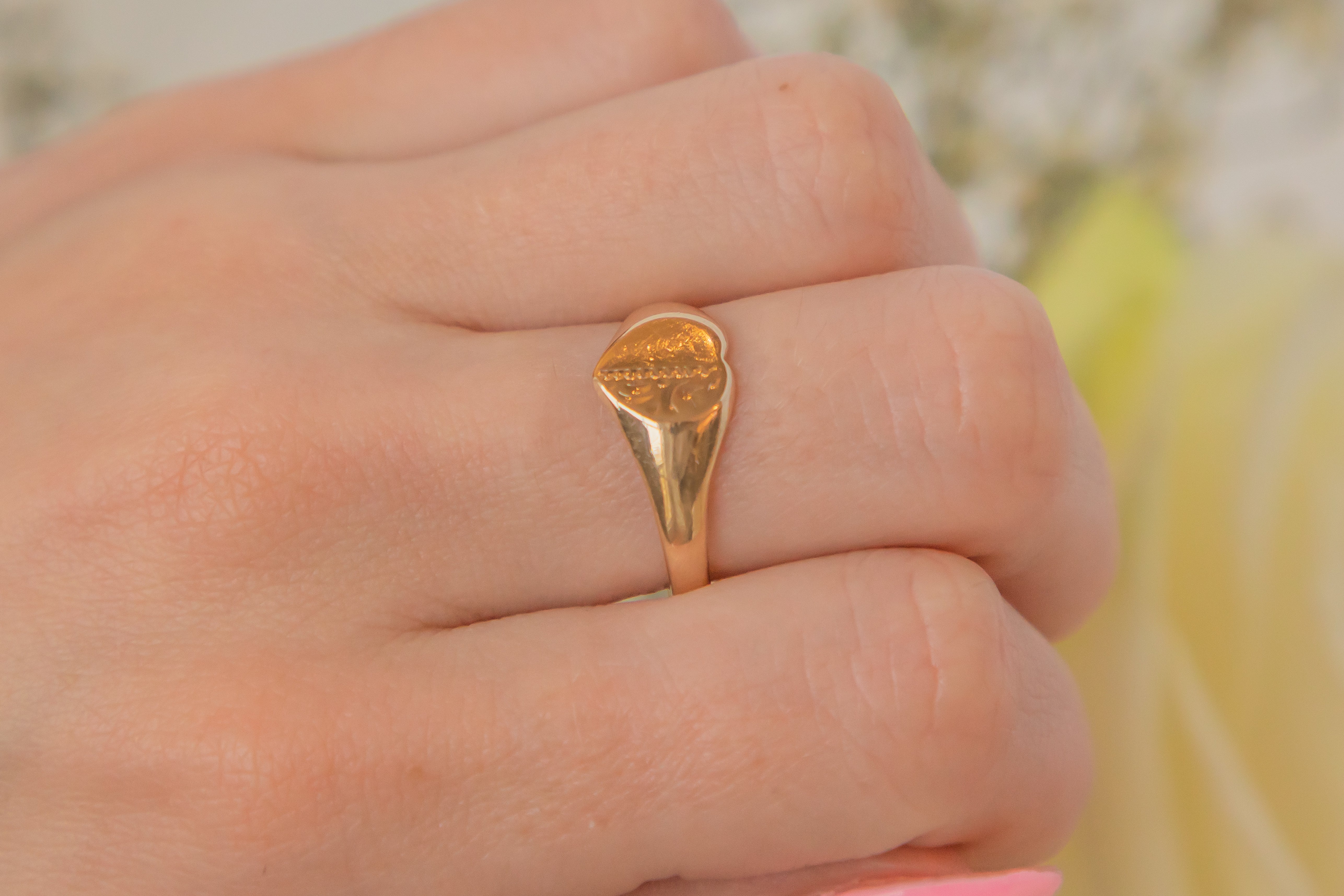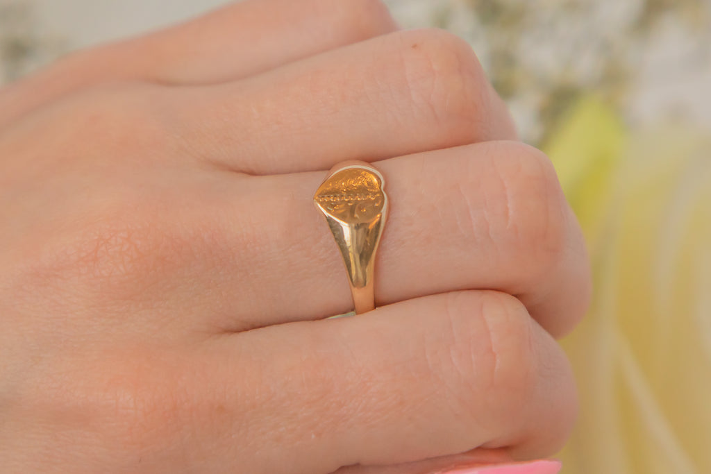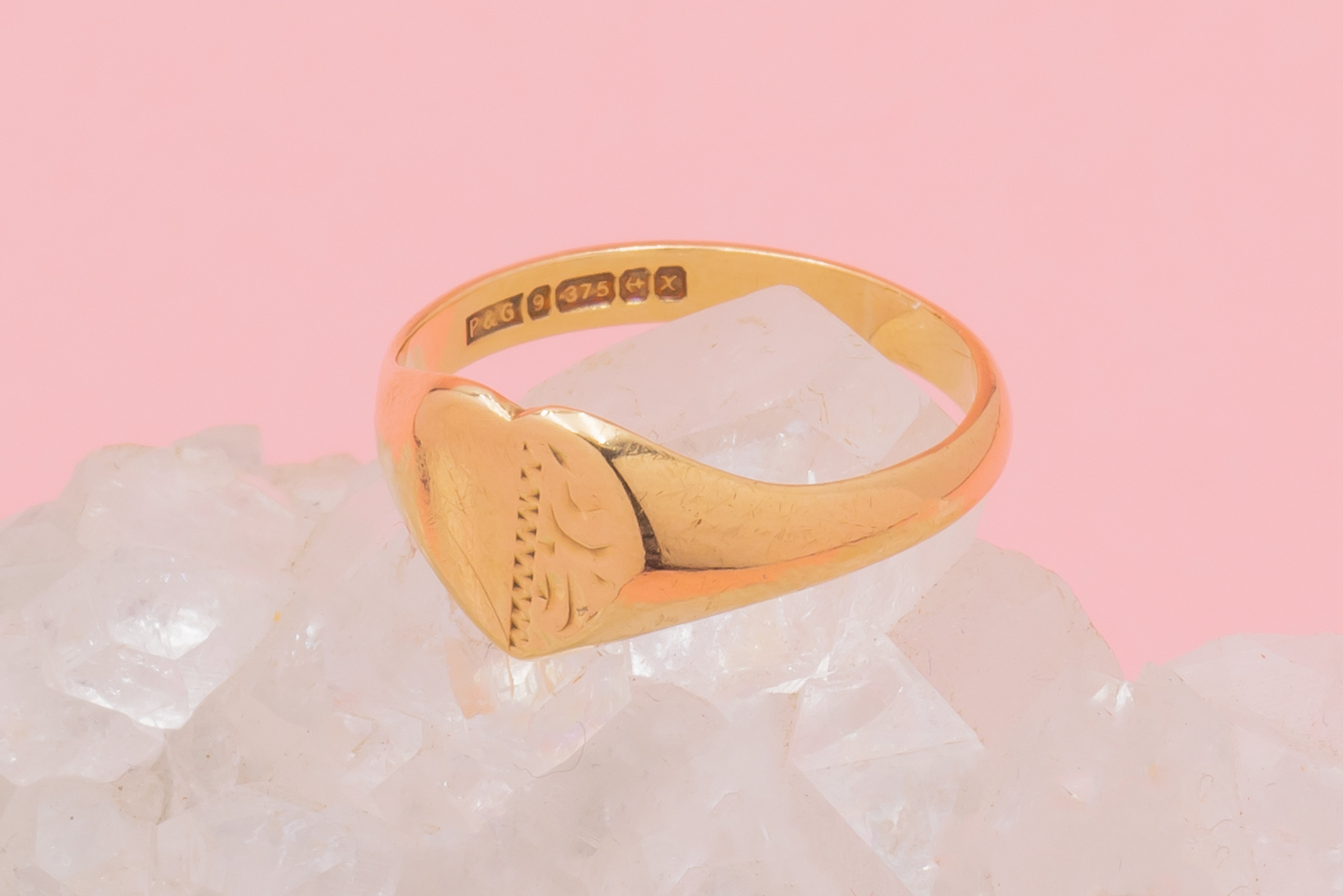 EXCELLENT. A bright 9ct Gold engraved heart signet ring in excellent condition! The heart has maintained its shape perfectly, and the band is robust. Inside, the band is fully hallmarked, and we can't see any resize marks. This is a glorious piece, with a beauty you will never tire of!