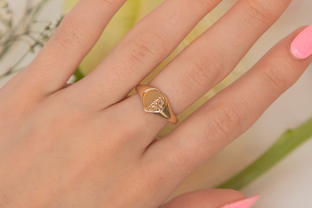 Her 9ct Gold is so buttery and glossy she feels as though she could melt in your hands- just delicious! With that in mind, this Gold signet ring makes for the most comfortable wear, so much so, you almost forget she's on your hand. The timeless appeal of the signet ring makes her an ideal heirloom to pass down for generations to come!