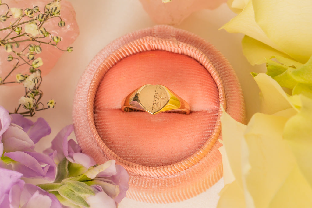 How divine is this 9ct Gold engraved heart signet ring! Enchanting floral engravings adorn the perfect dainty heart enhancing her feminine charm.