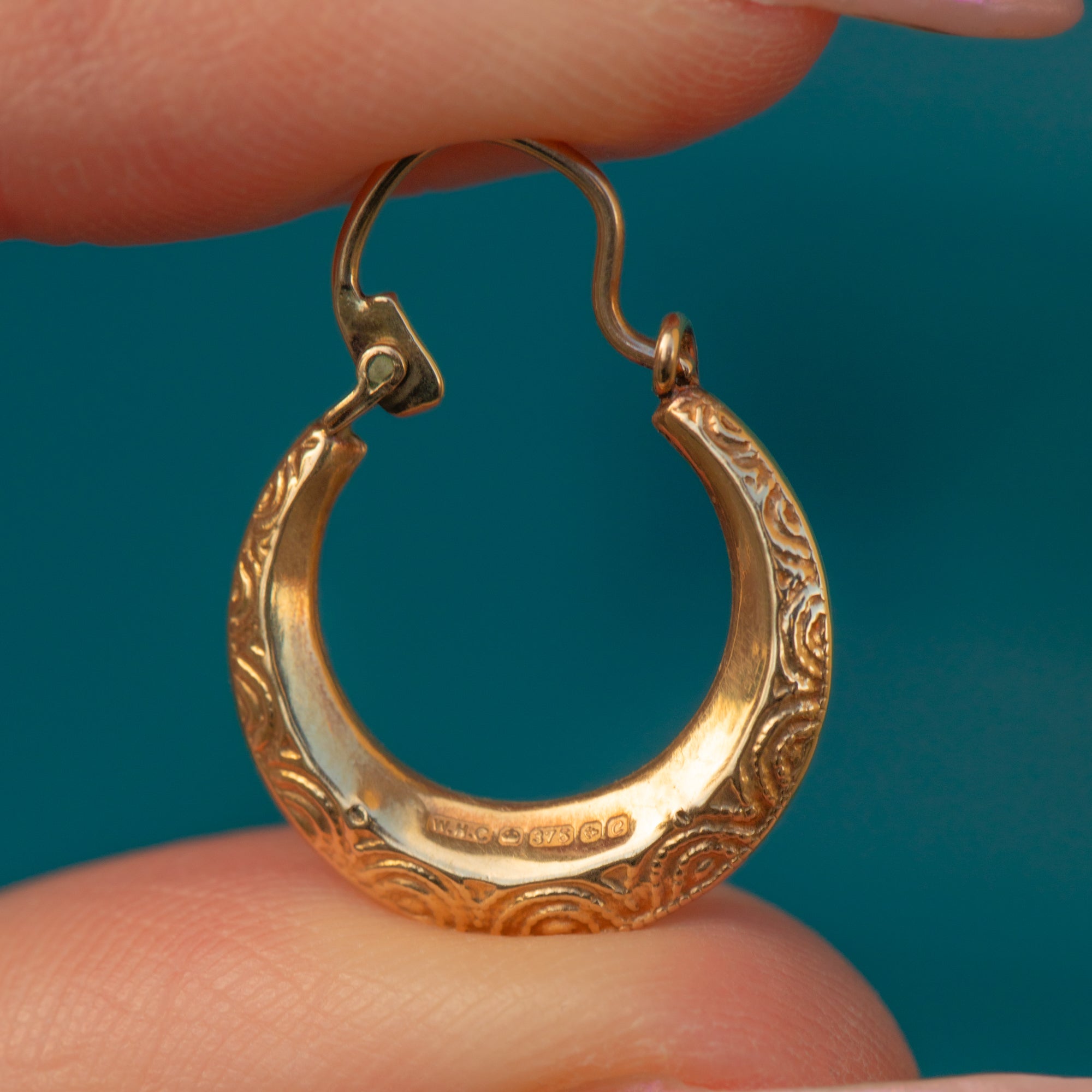 EXCELLENT: These 9ct Gold engraved huggie hoop earrings are in excellent condition. Her Gold is lustrous and buttery and her engravings are crisp. Her levers are in great working condition, so you can wear them with confidence!