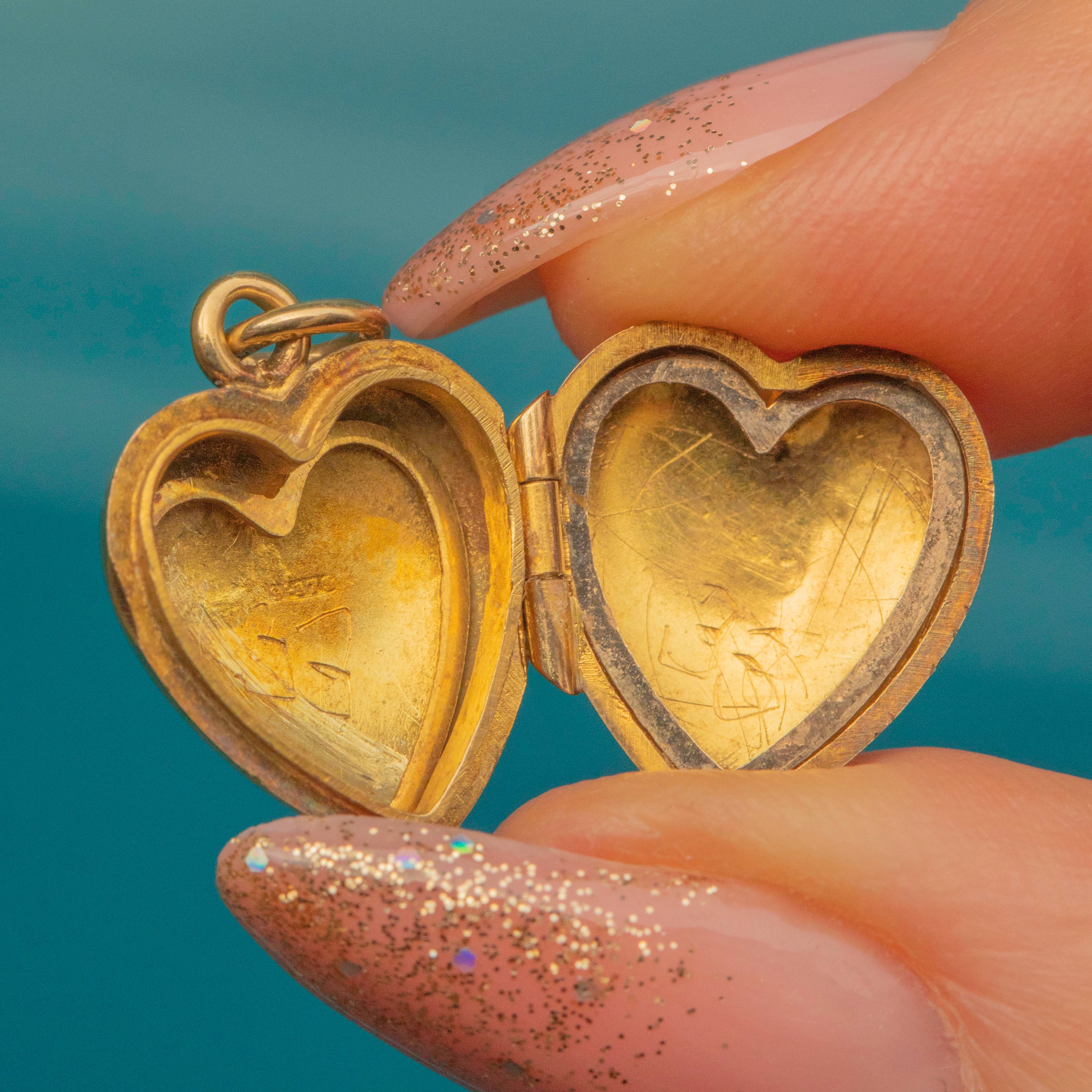 EXCELLENT This 9ct Gold Engraved Mini Heart Locket is in superb condition, with its intricate acanthus leaf engravings perfectly preserved. Tiny age-related dings blend seamlessly into the design, remaining unnoticeable when worn. It opens easily and secures tightly, keeping your treasured keepsakes safe and close to your heart.