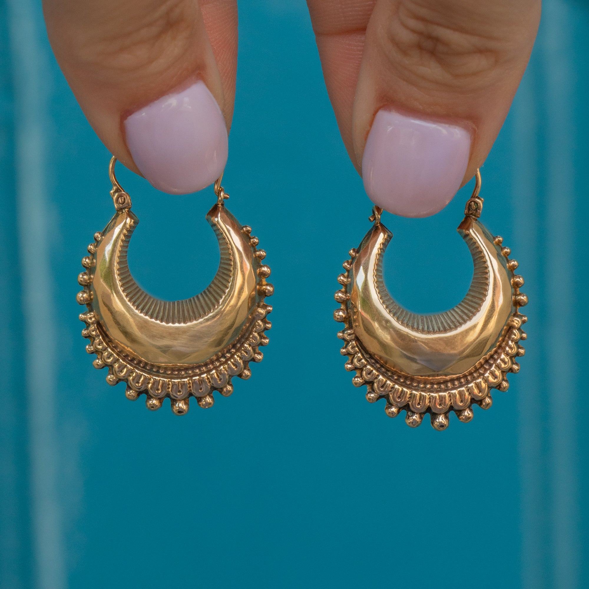 EXCELLENT. These 9ct Gold faceted fancy hoop earrings are in exceptional condition. The Gold is bright with no dings or dents to the body of the earrings. The hooks are sturdy and attach securely making them ready to wear or gift straight away.