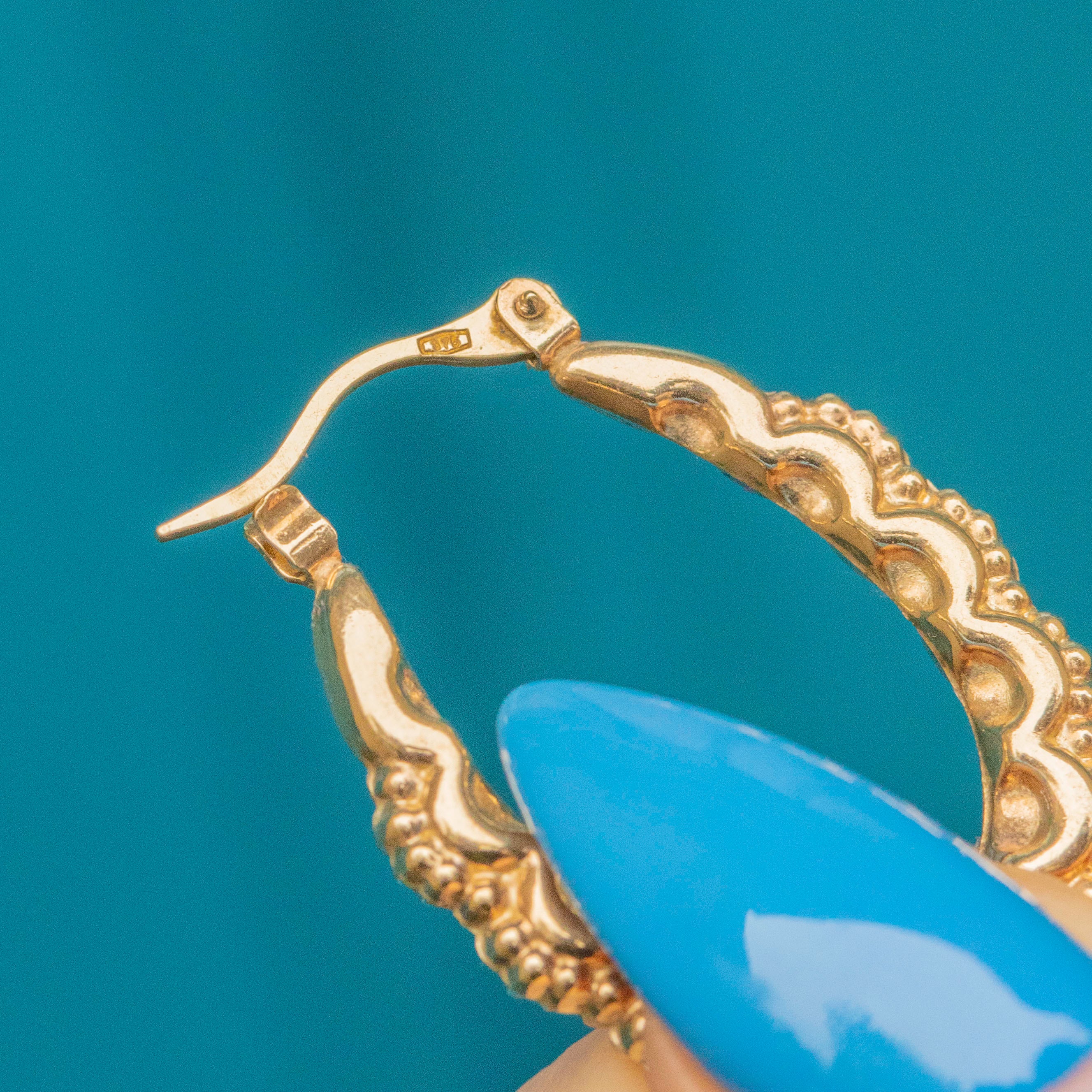 These 9ct Gold fancy oval hoop earrings are the perfect 'grab & go' pair. They have beautiful details that can be adored from every angle, and lever hooks so you can slot them into and out of the ear with ease!