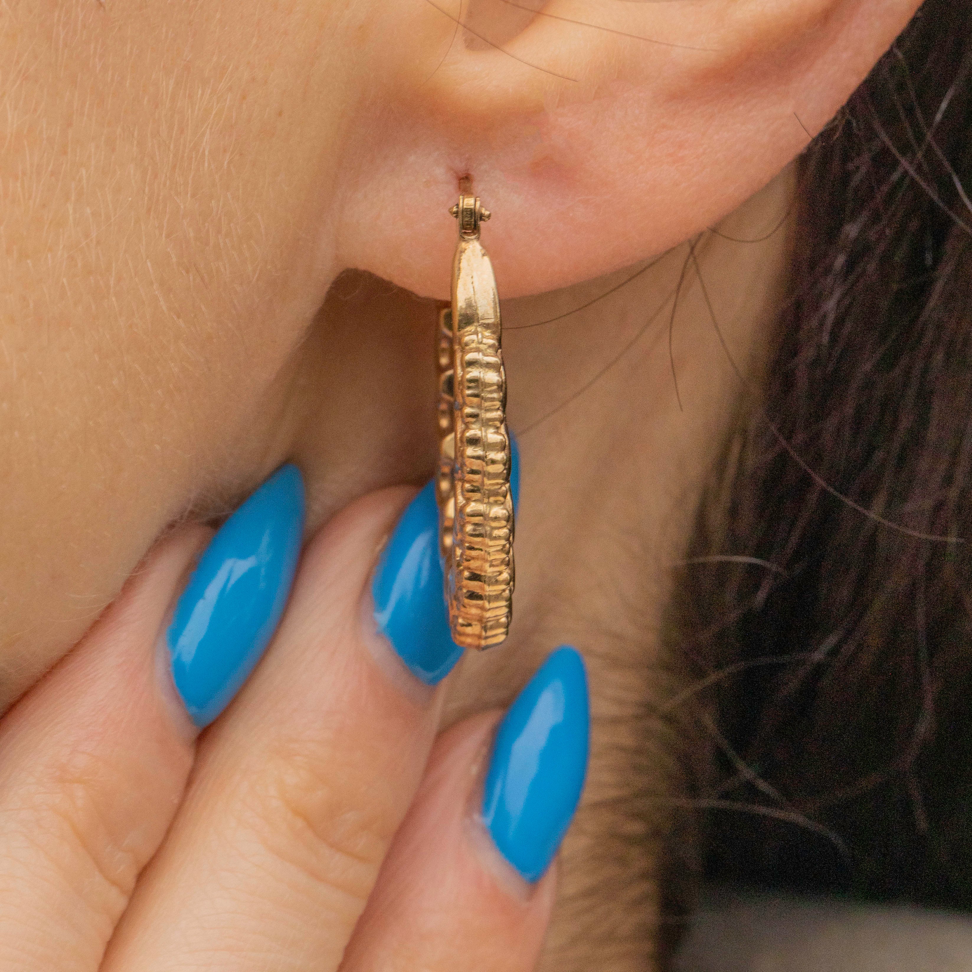 EXCELLENT. These 9ct Gold fancy hoop earrings are in excellent condition. The earrings have very little wear to note, and can be worn with confidence!
