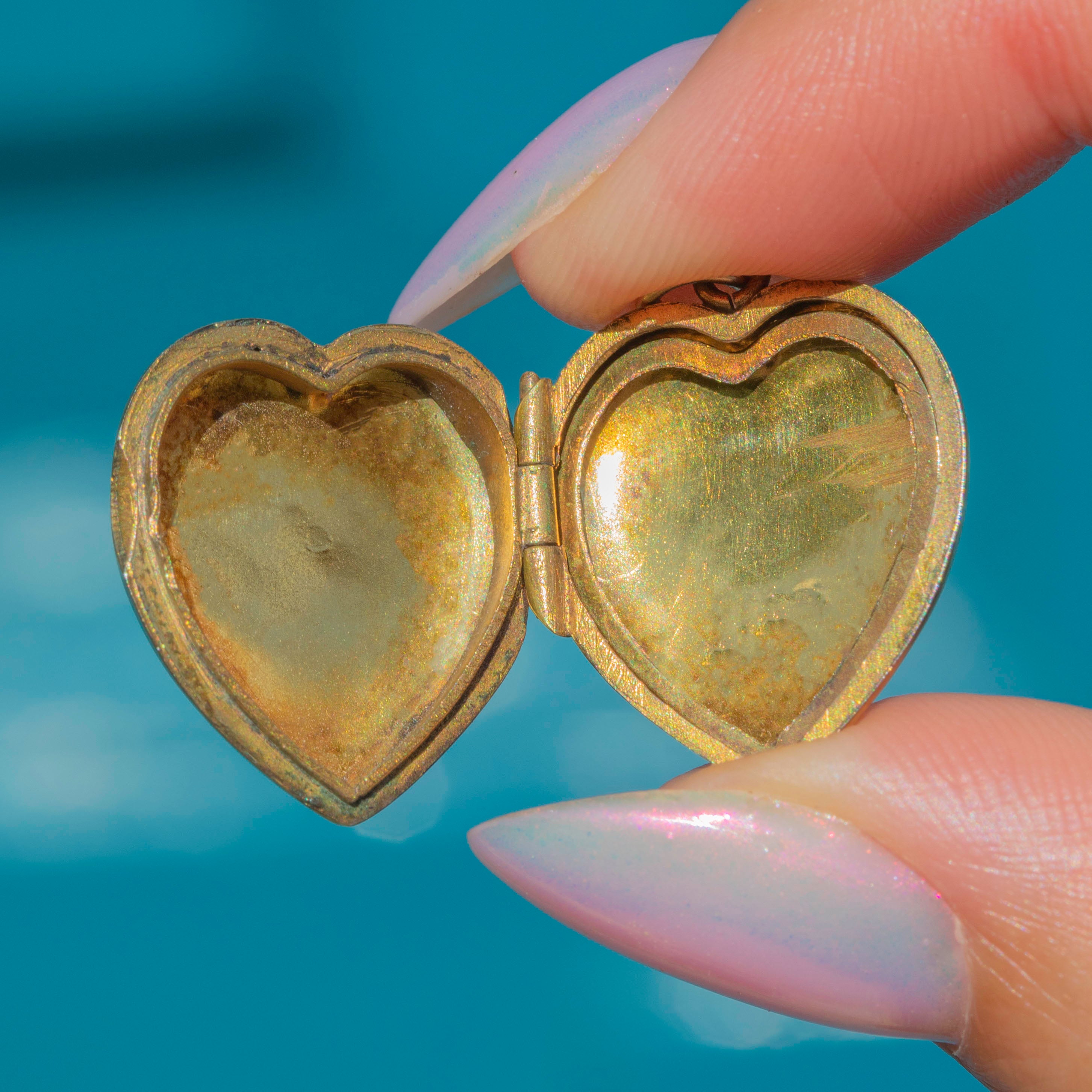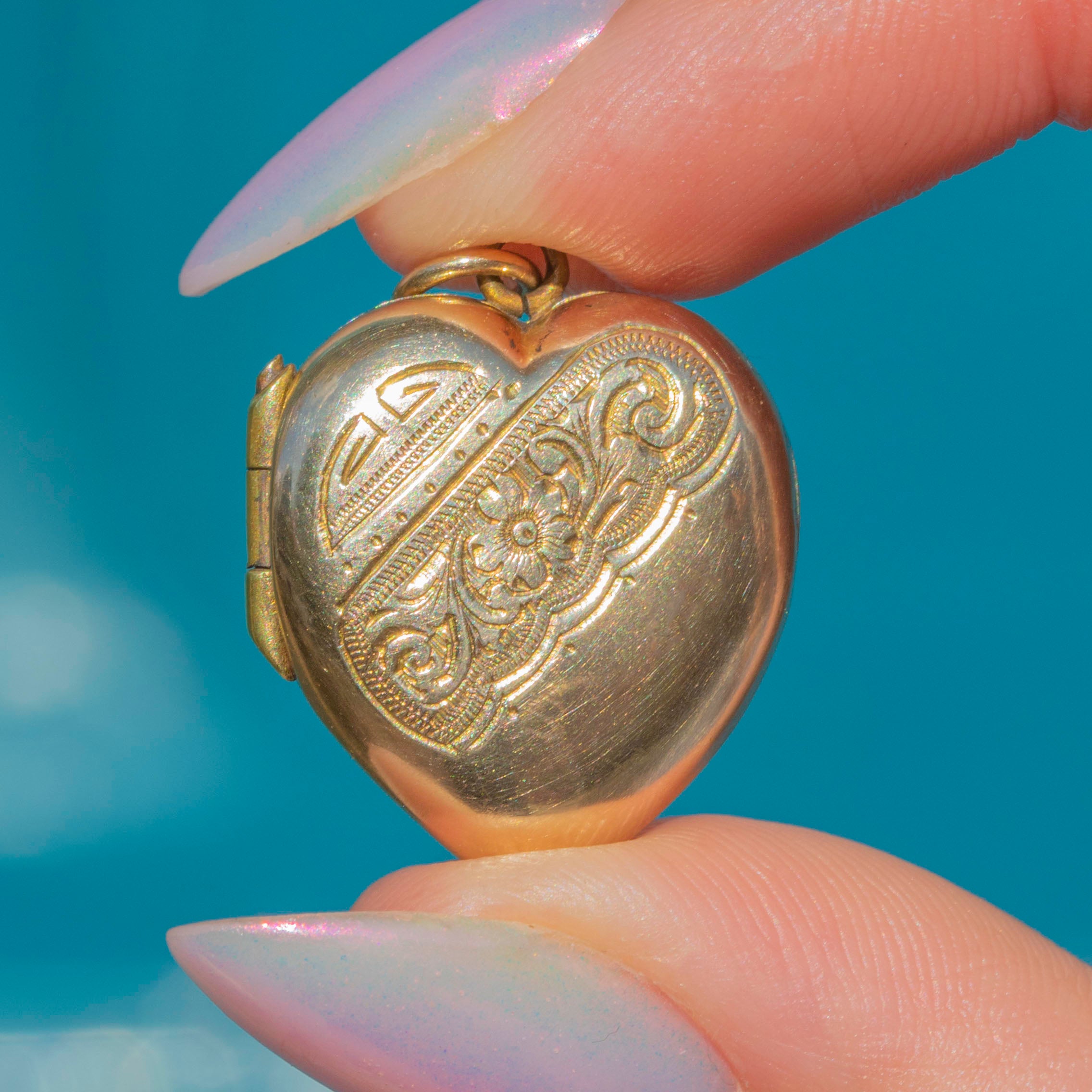 VERY GOOD: This 9ct Gold floral engraved heart locket is in very good condition. The Gold is buttery and glossy, and the locket has held its form well. There is some mild surface wear, including discolouration inside the locket, expected with age, but the locket is free from notable dings or scuffs, and the engraved details are crisp. With one frame present and closing securely, you can use and wear this mid-century Gold heart locket with confidence!