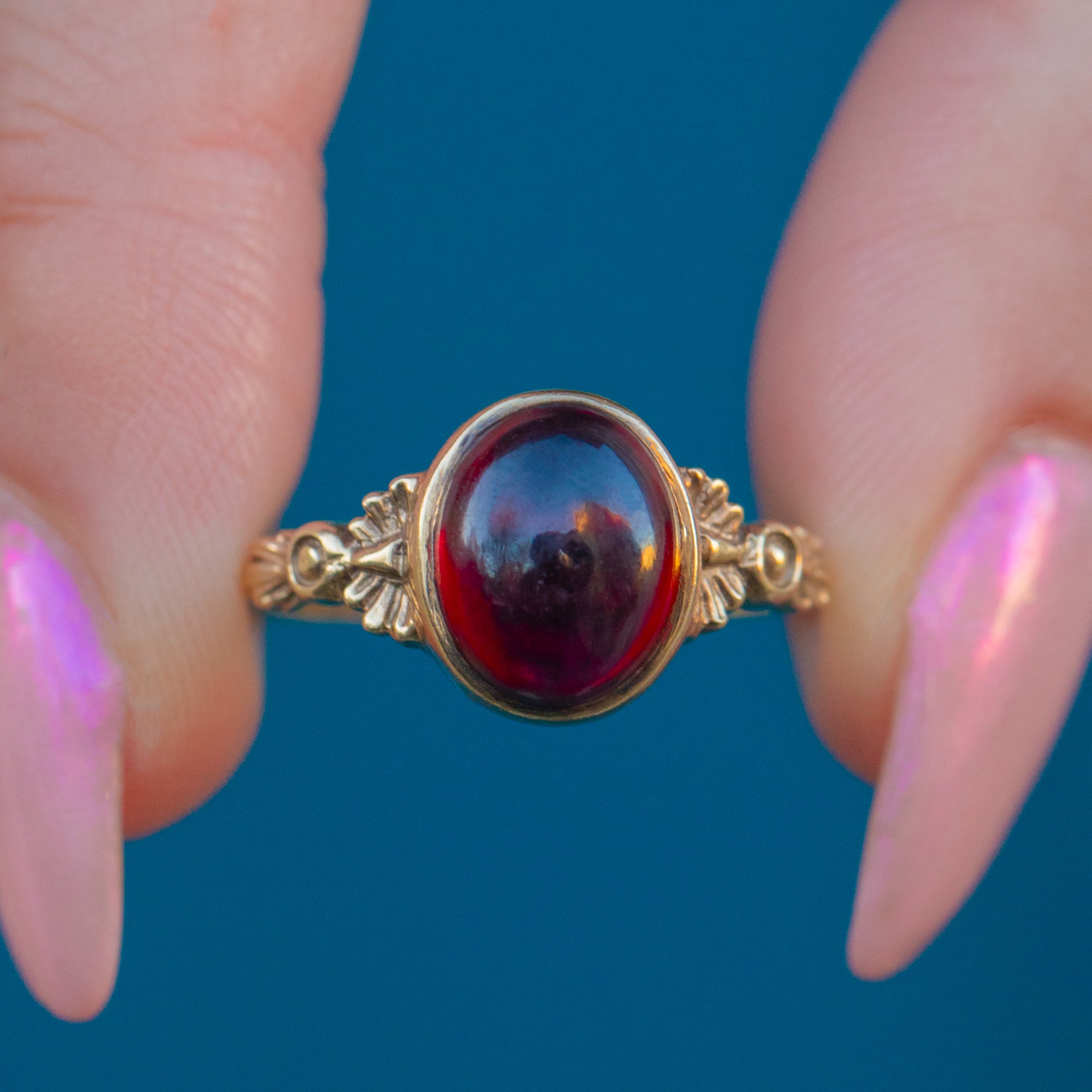 9ct Gold Garnet Cabochon Ring, Ornate Shoulders