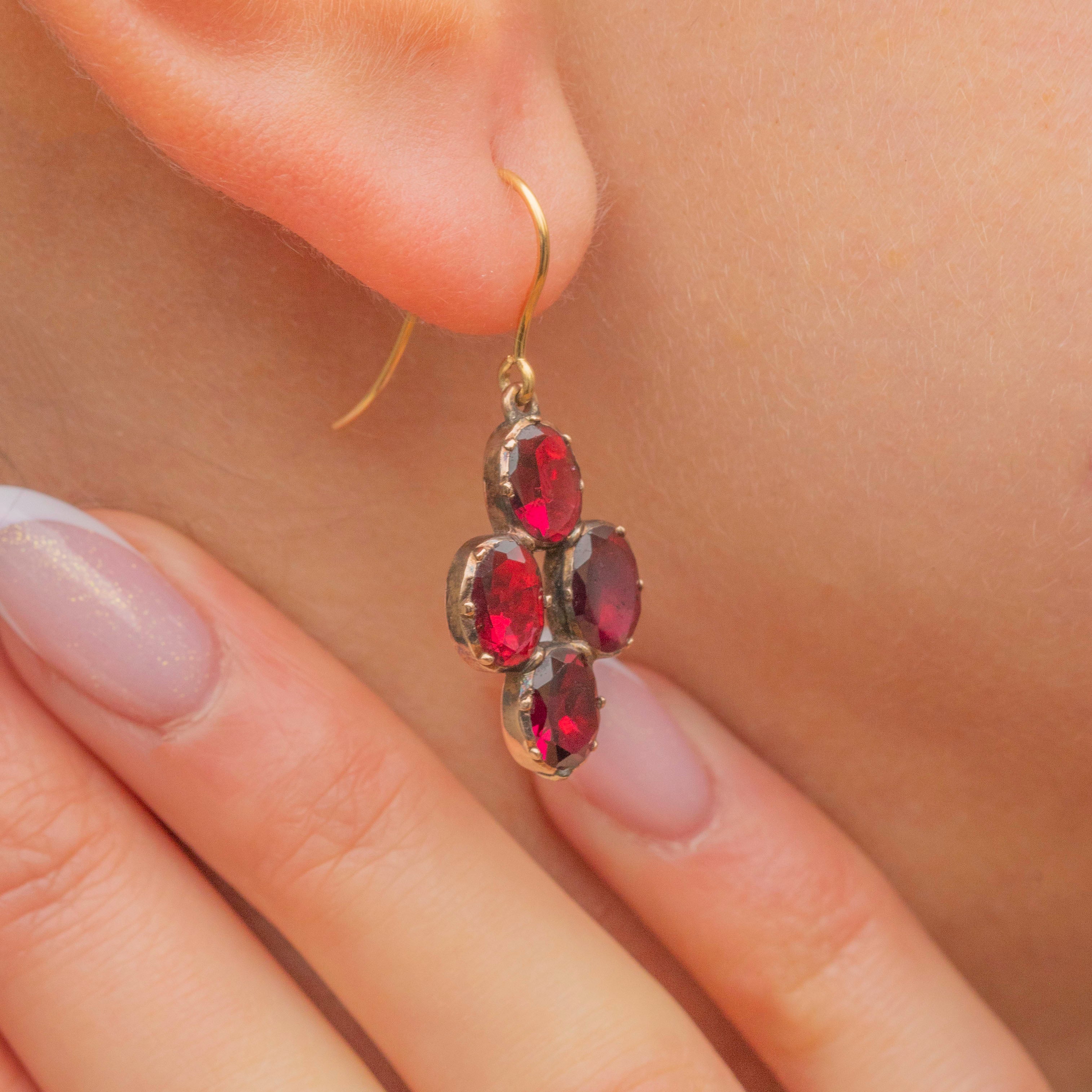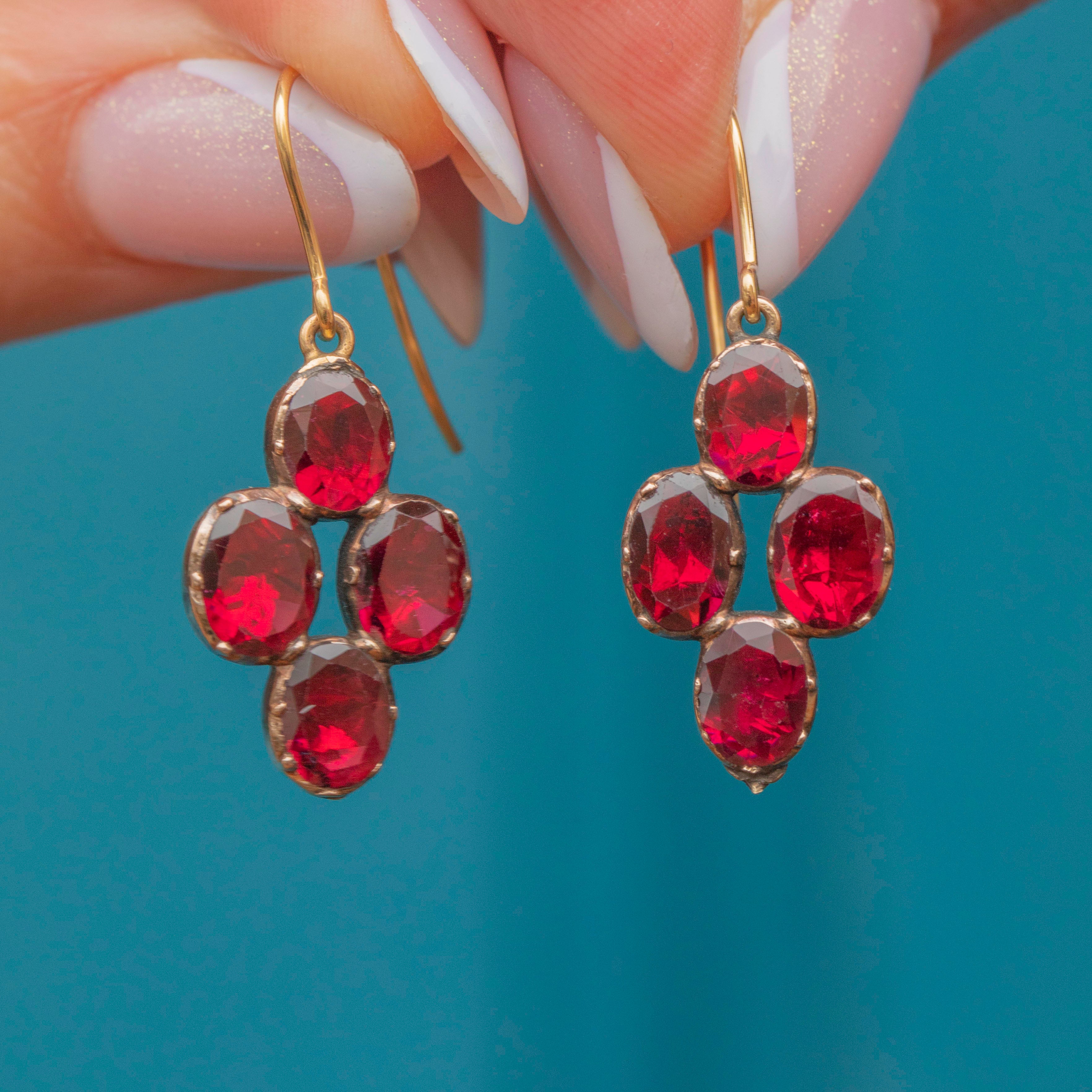 These Georgian 9ct Gold flat-cut Garnet drop earrings are an elegant pair! Rich with sparkly scarlet tones, these earrings will complete your outfit.