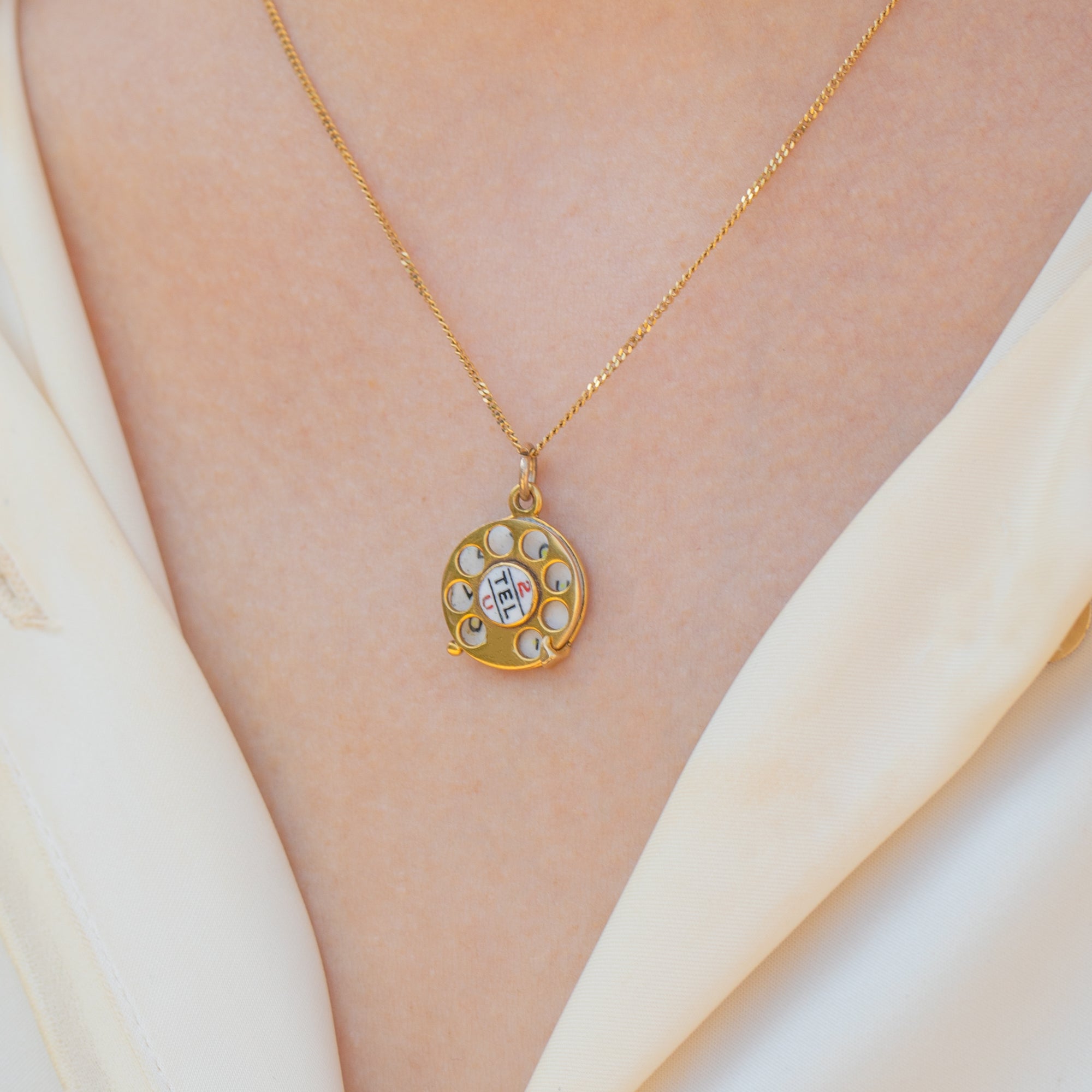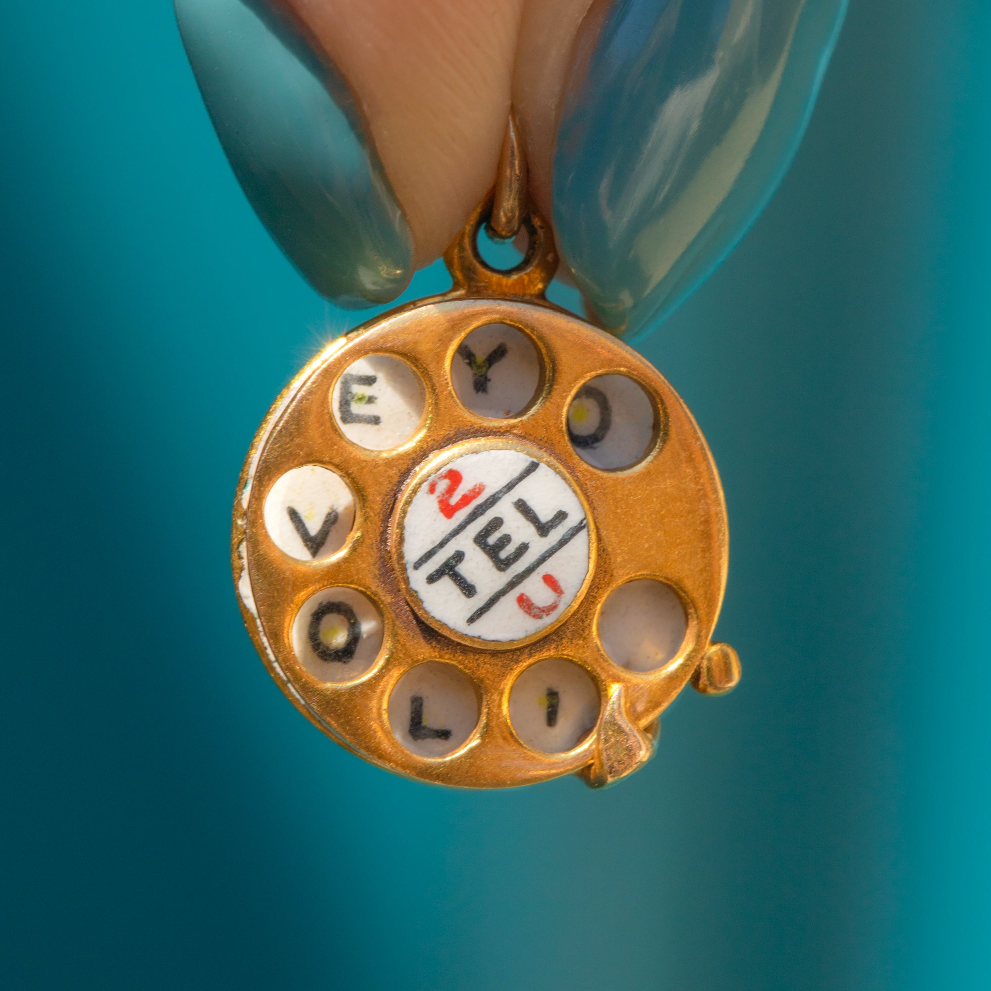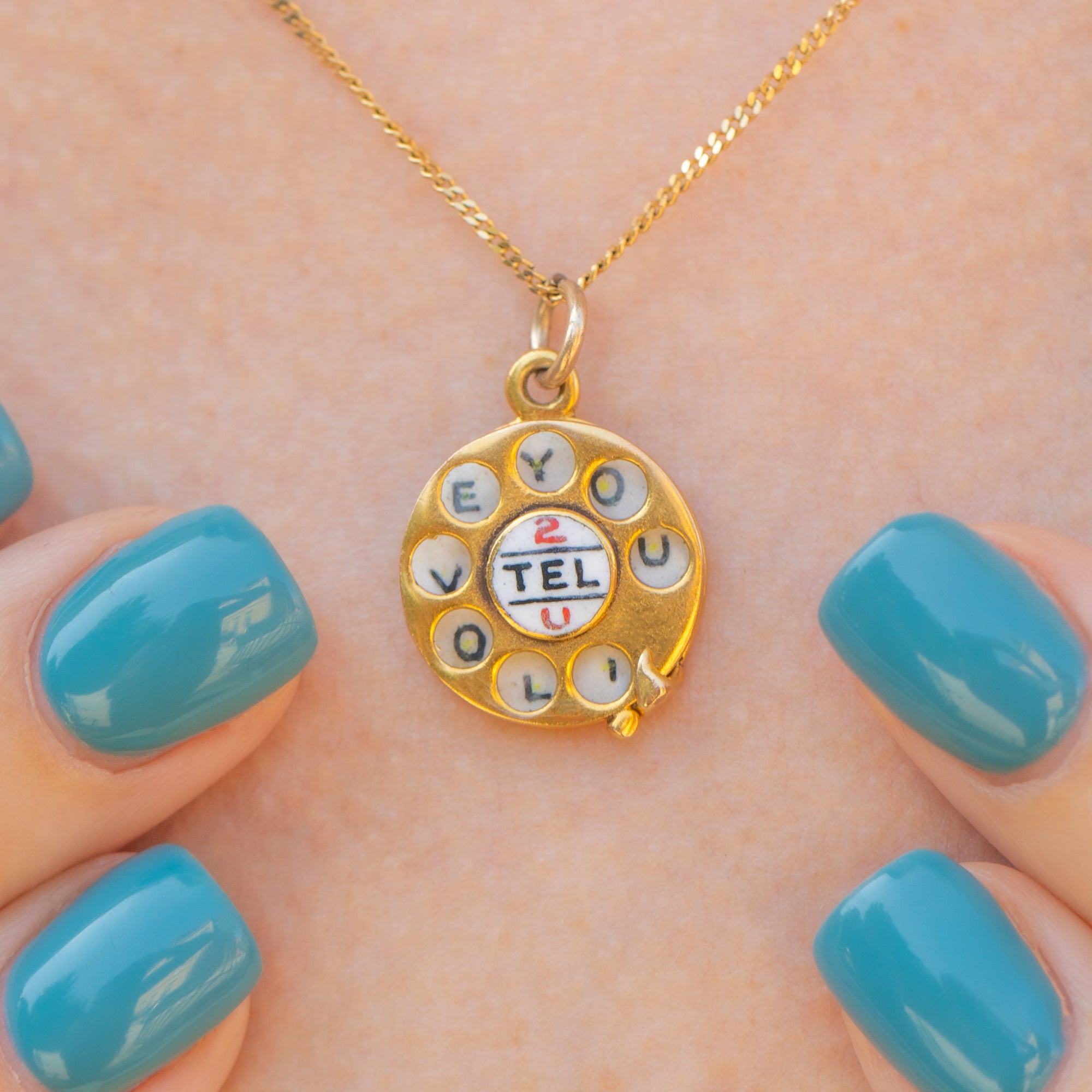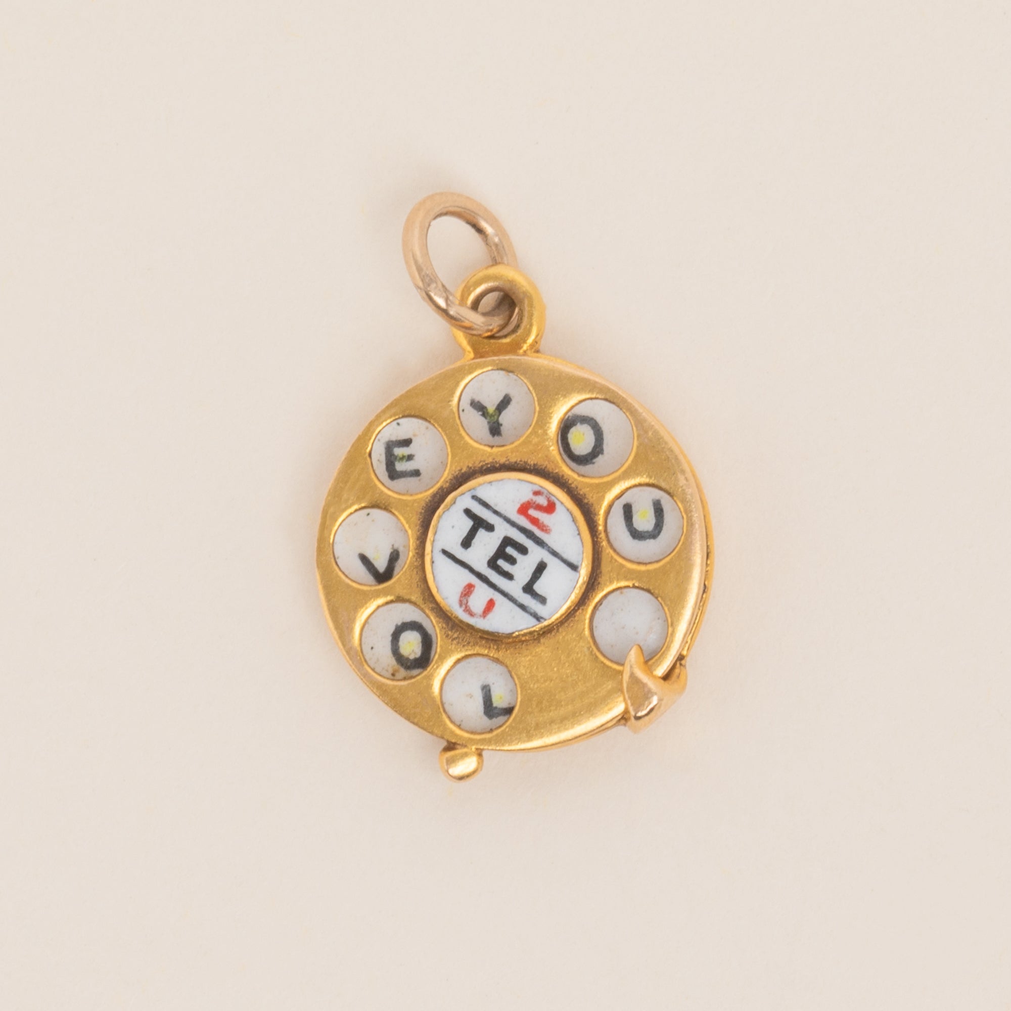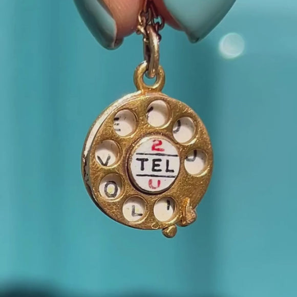 Send a sweet message with this 9ct Gold I love you telephone charm! Harking back to days past with a rotary telephone wheel design, this tactile piece has a spinning dial that turns to reveal a secret message of "I LOVE YOU".