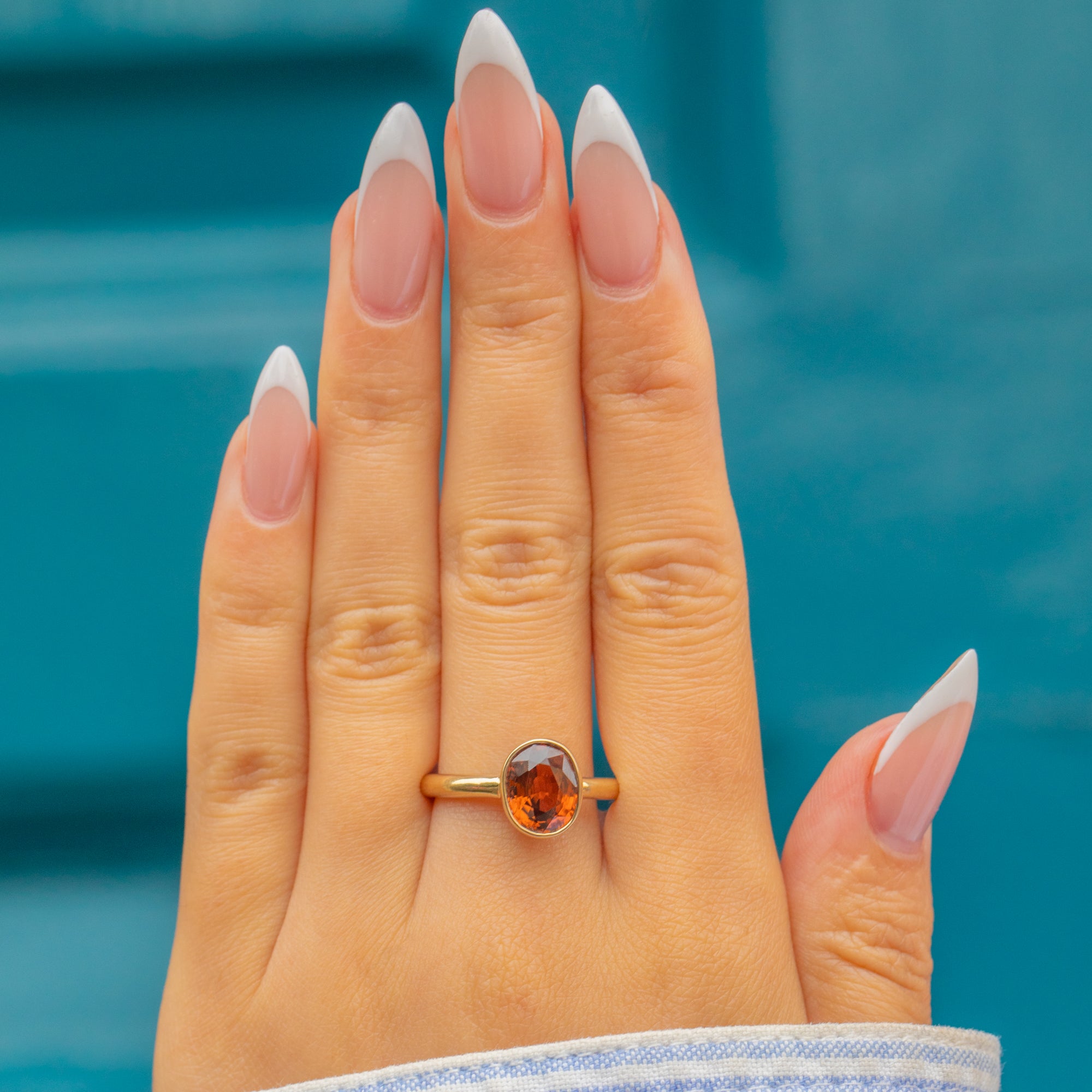 A striking Mid-Century Vintage ring set with a vibrant natural Imperial Topaz. The Topaz displays a rich golden-orange hue, perfectly complemented by a simple 9ct Gold bezel setting that allows the stone’s natural beauty to shine.