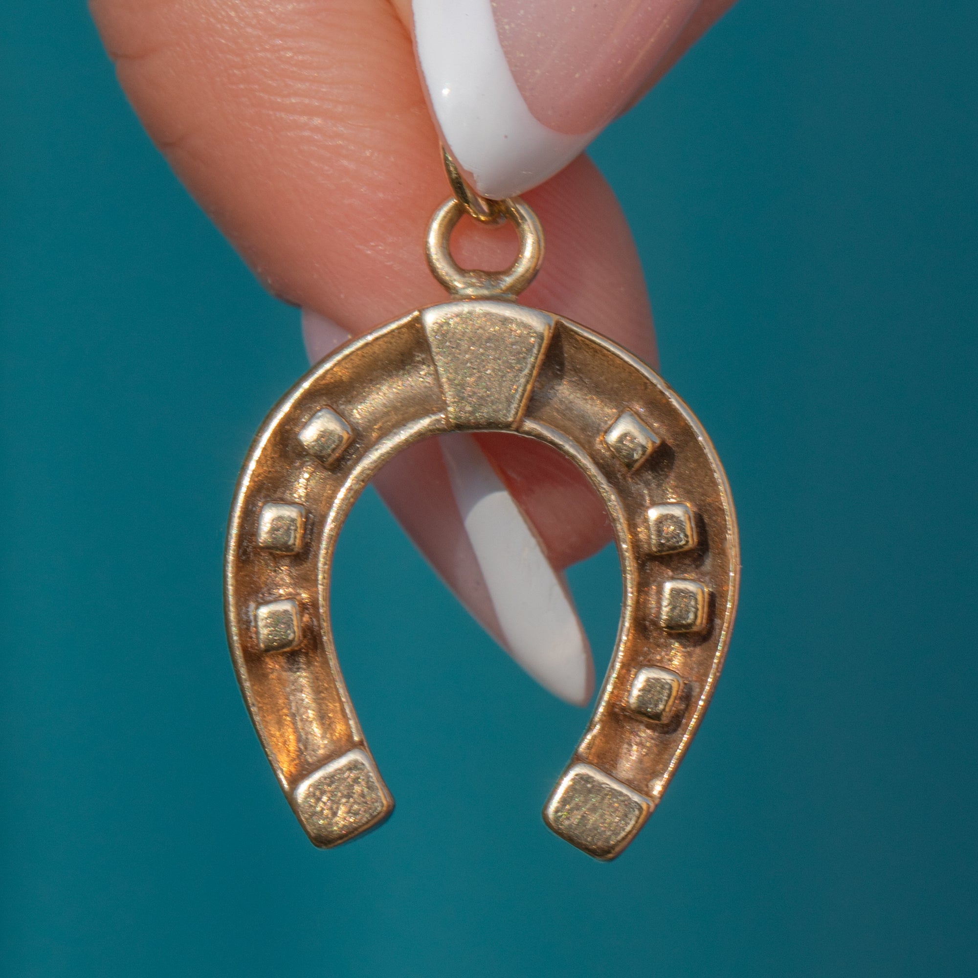 EXCELLENT: We are pleased to report that this 9ct Gold Lucky Horseshoe Pendant is in excellent condition. Her 9ct Gold is glossy and smooth while her shape has maintained its original form. Securely attached to its jump ring, you can wear this beautiful Gold horseshoe charm with confidence.