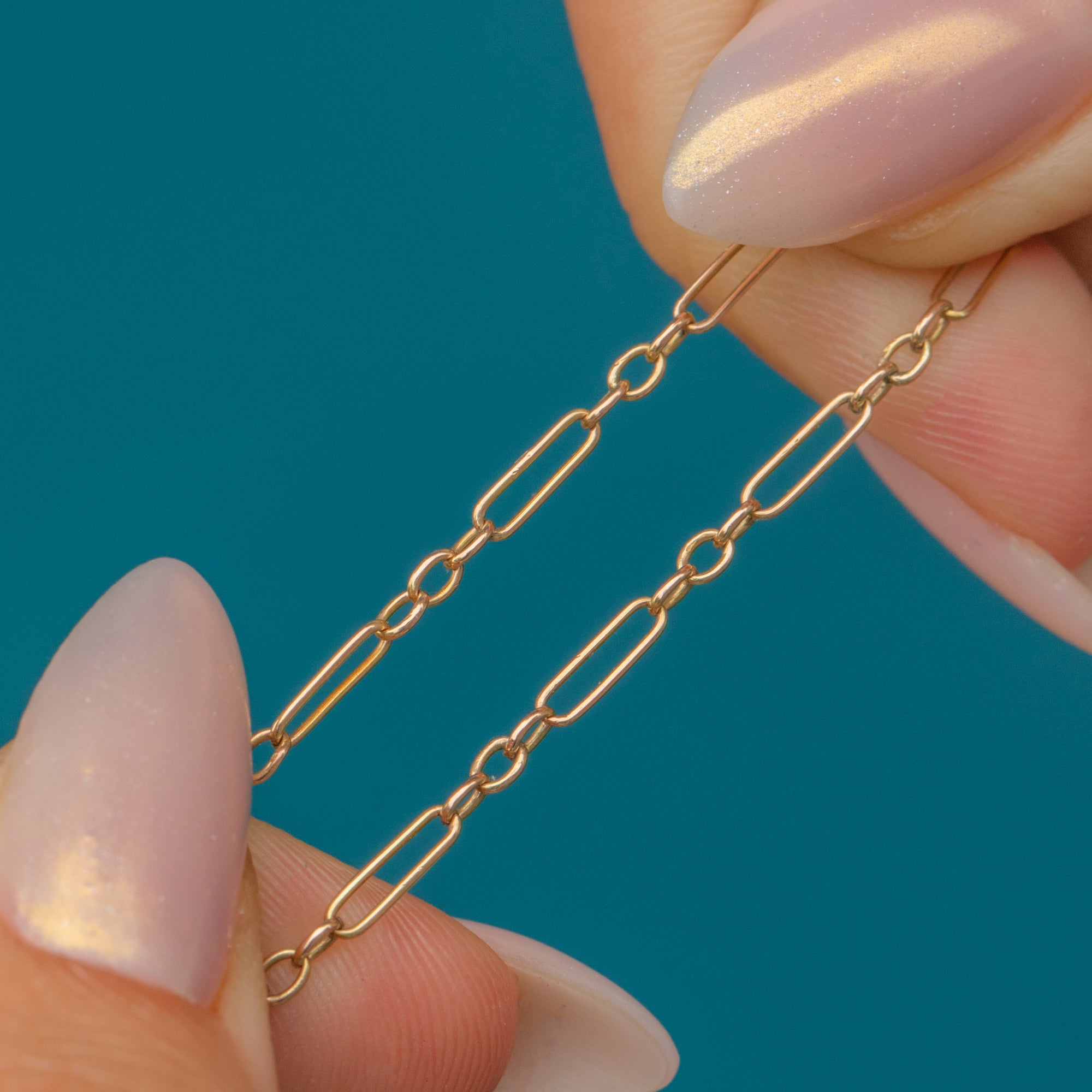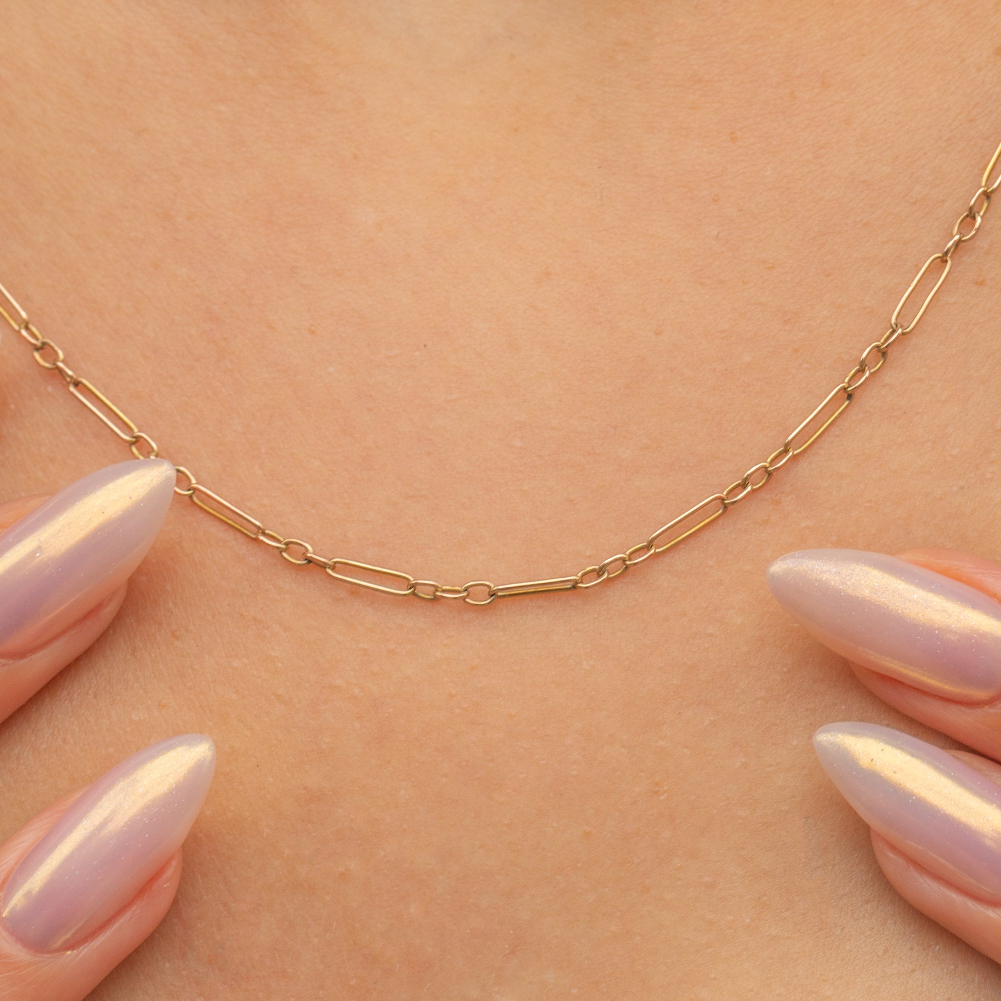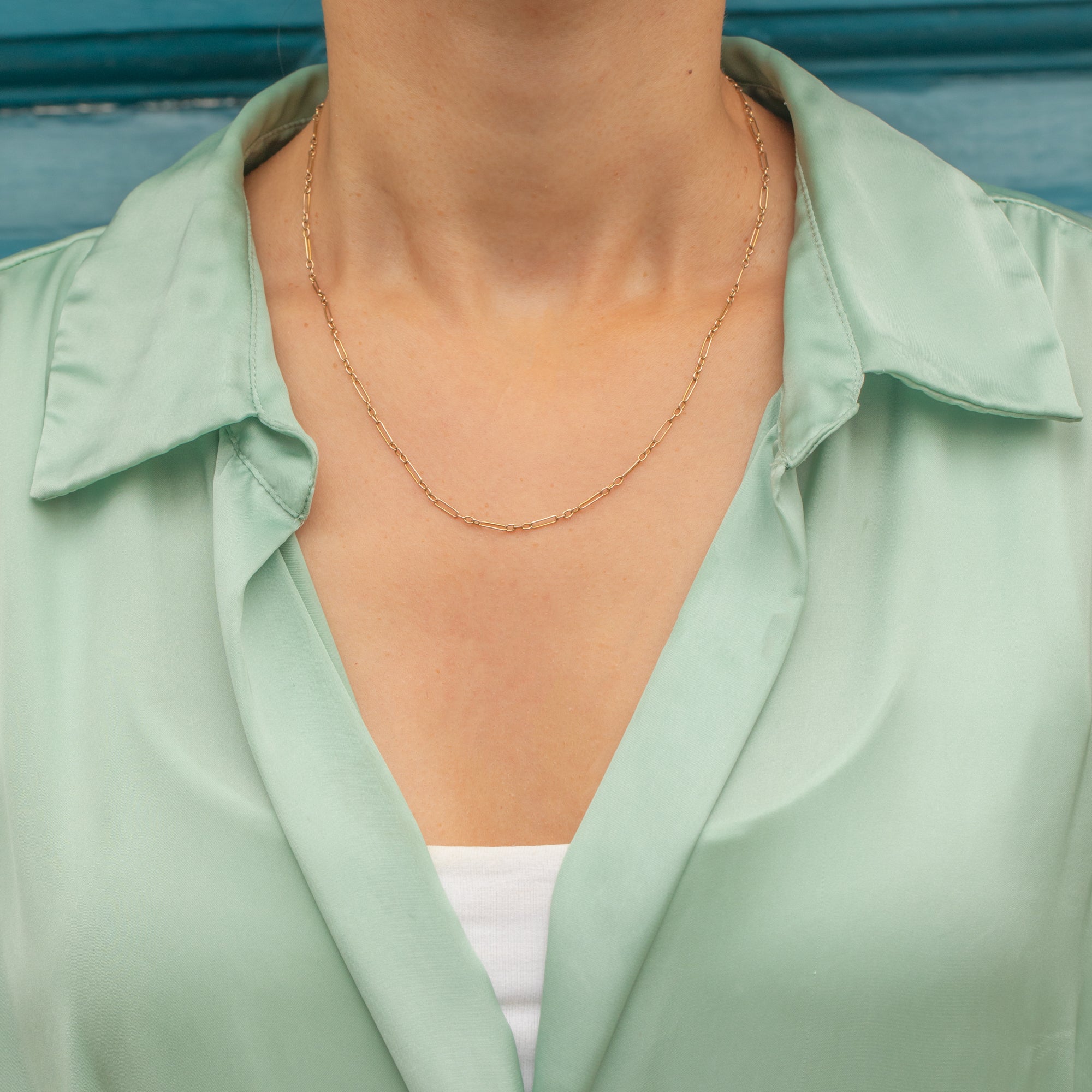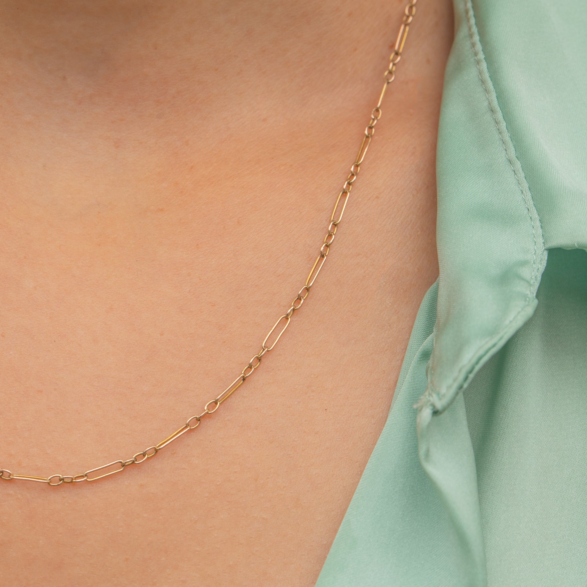 This delicate chain necklace is a wonderful example of understated antique design, featuring elegant trombone links crafted from 9ct Gold. The alternating elongated and shorter links create a refined rhythm to the design, making it elegant when worn alone or perfect for layering with other chains.
