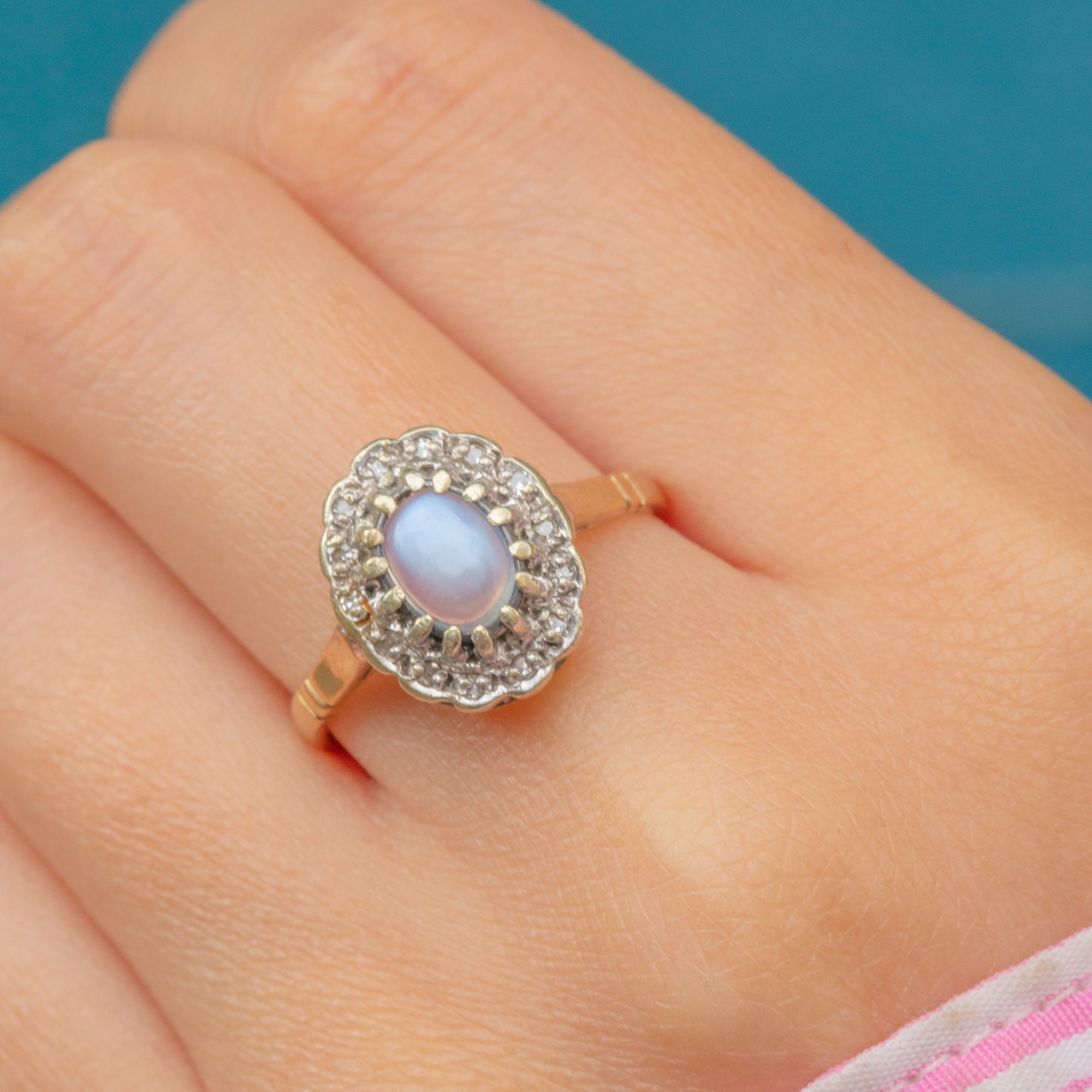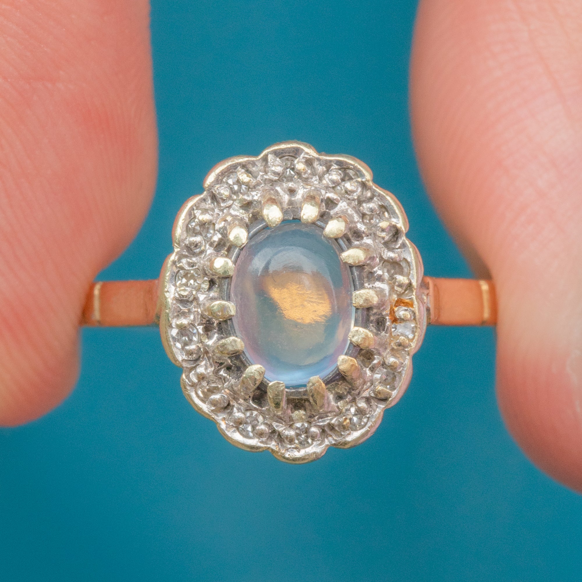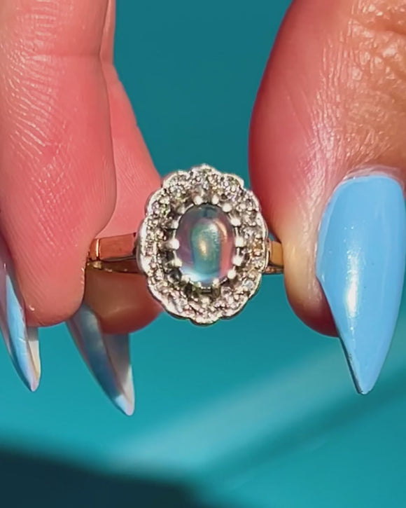 This vintage cluster ring displays a luminous 0.35ct Moonstone cabochon haloed by scintillating Diamonds, boasting decadence and refined sophistication.