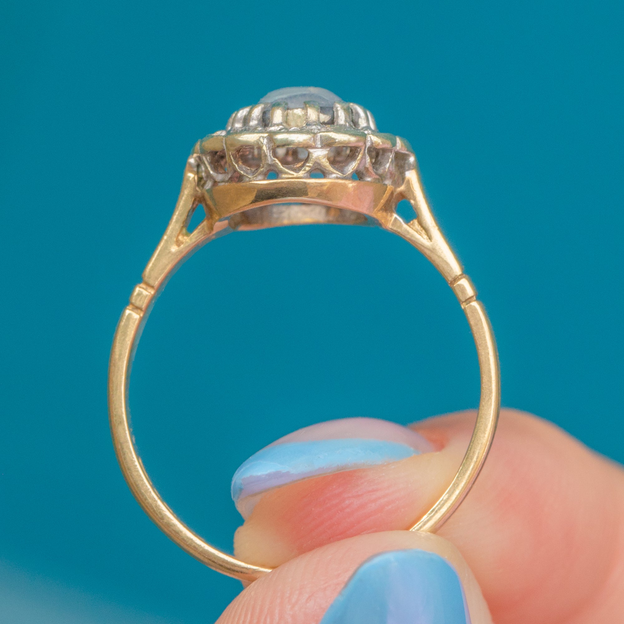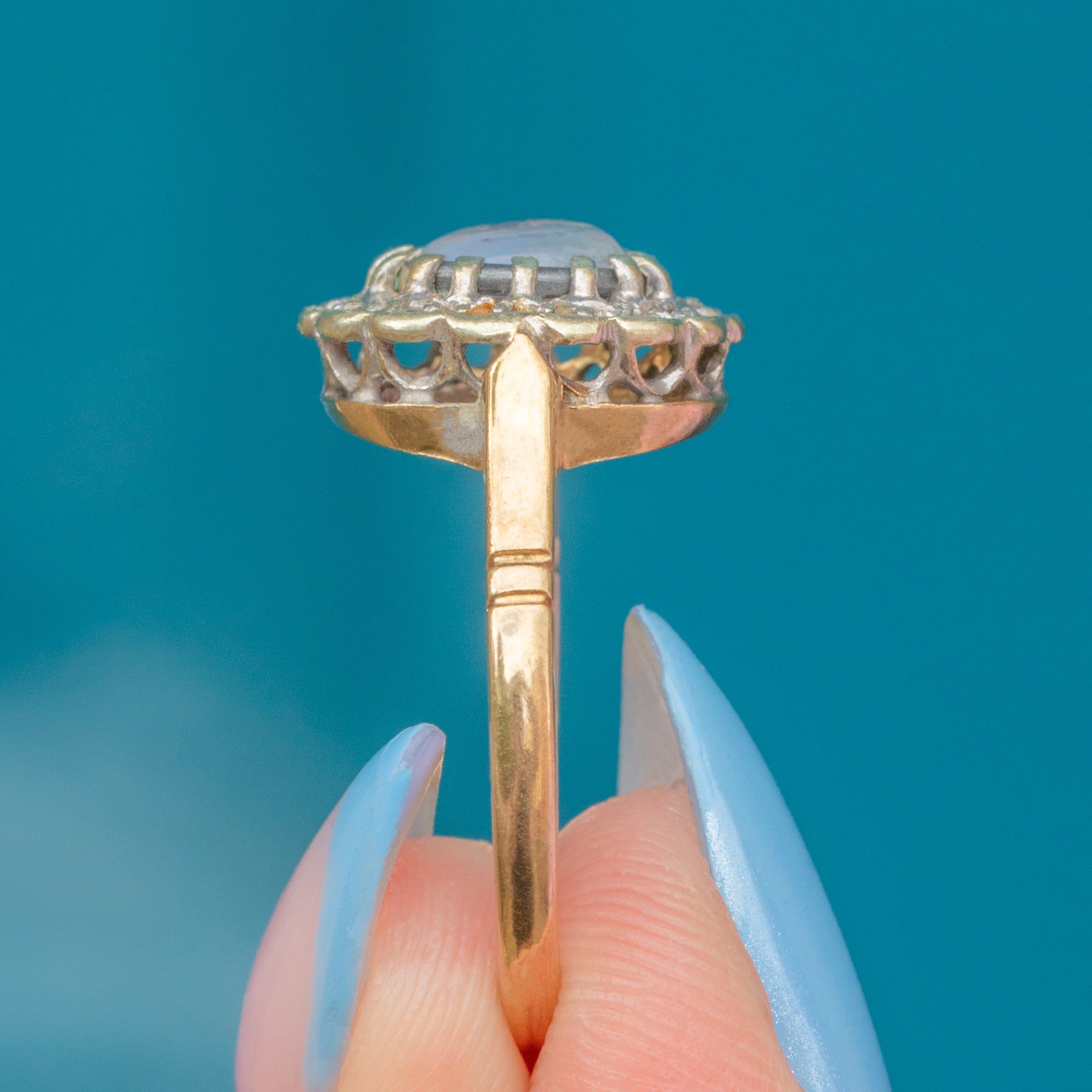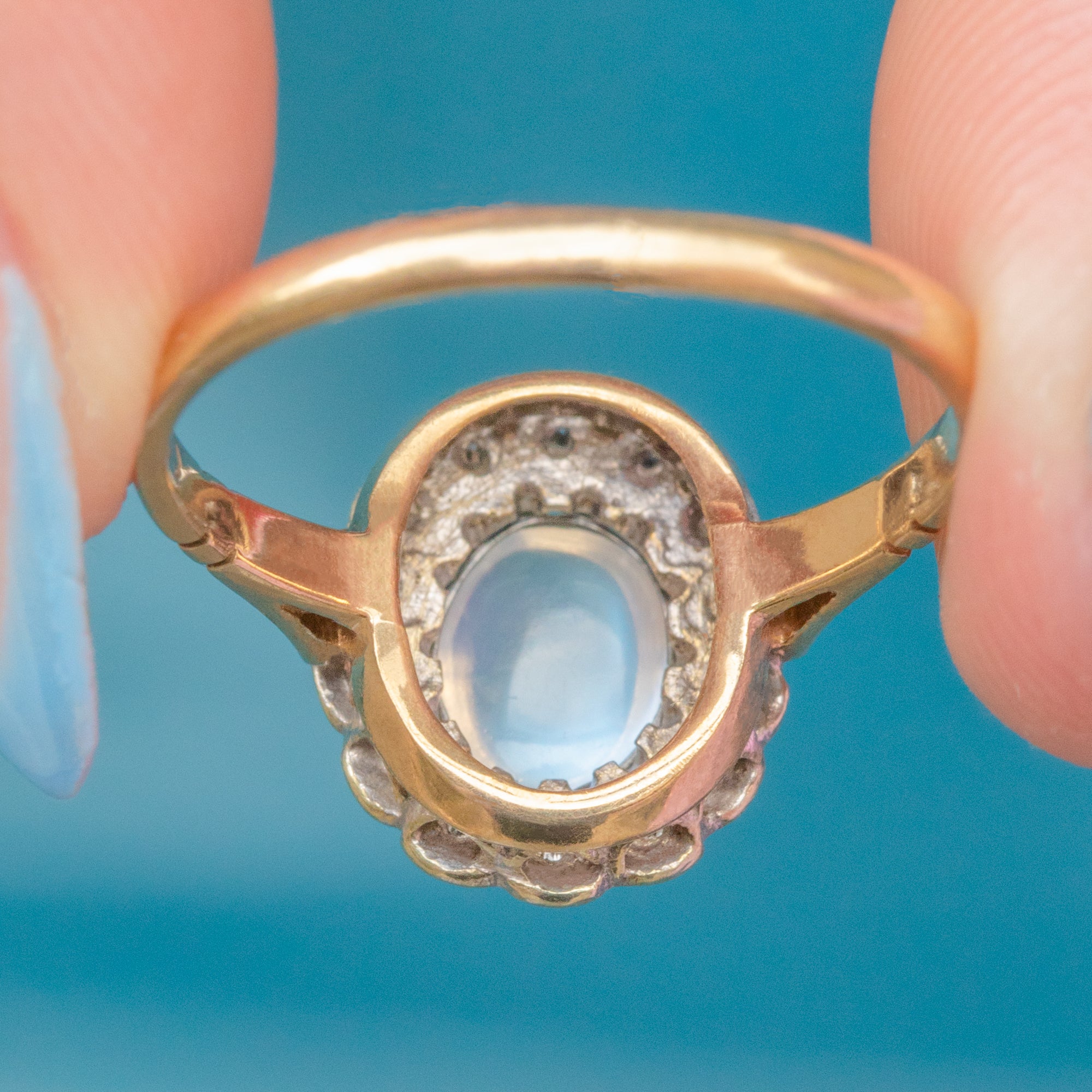 This vintage cluster ring displays a luminous 0.35ct Moonstone cabochon haloed by scintillating Diamonds, boasting decadence and refined sophistication.