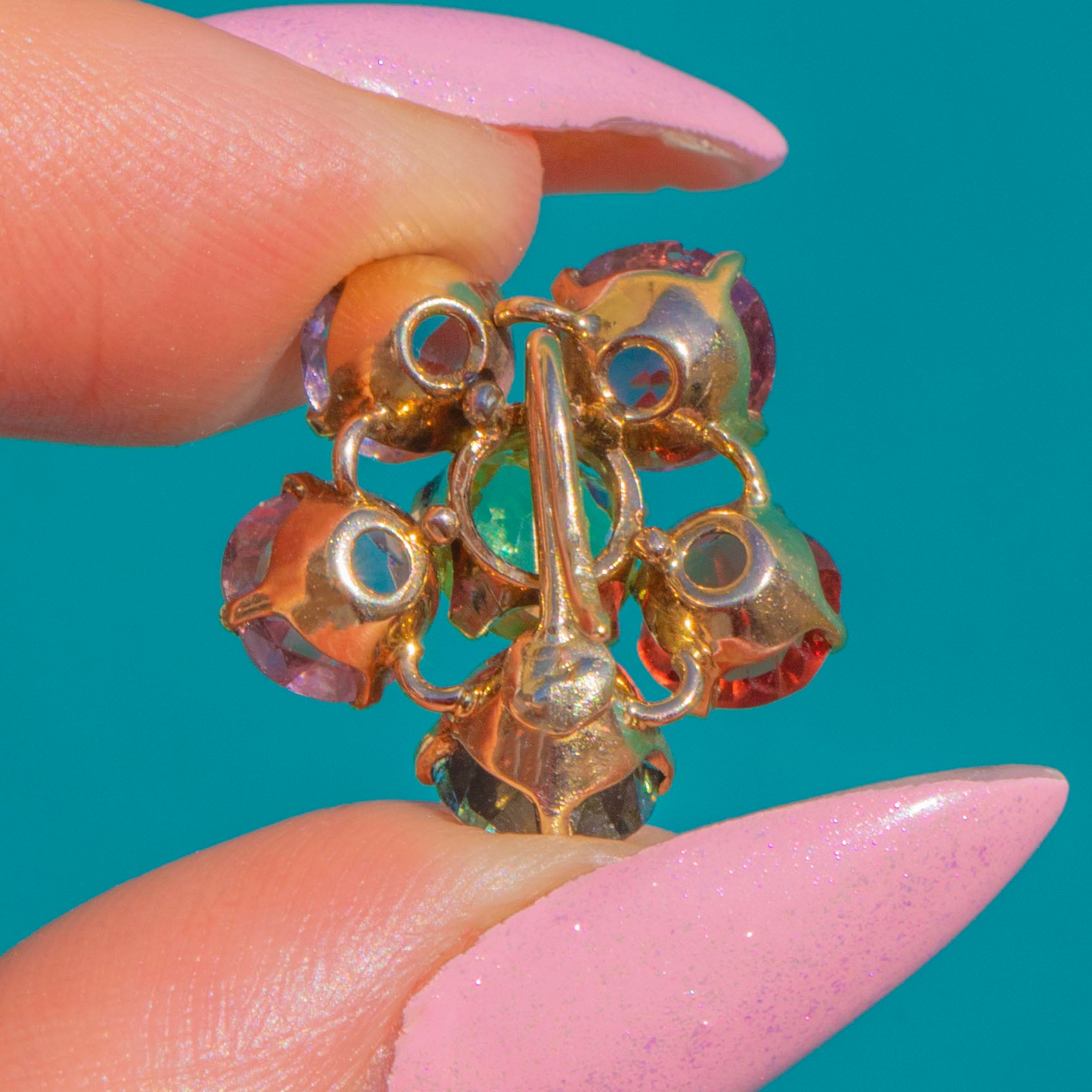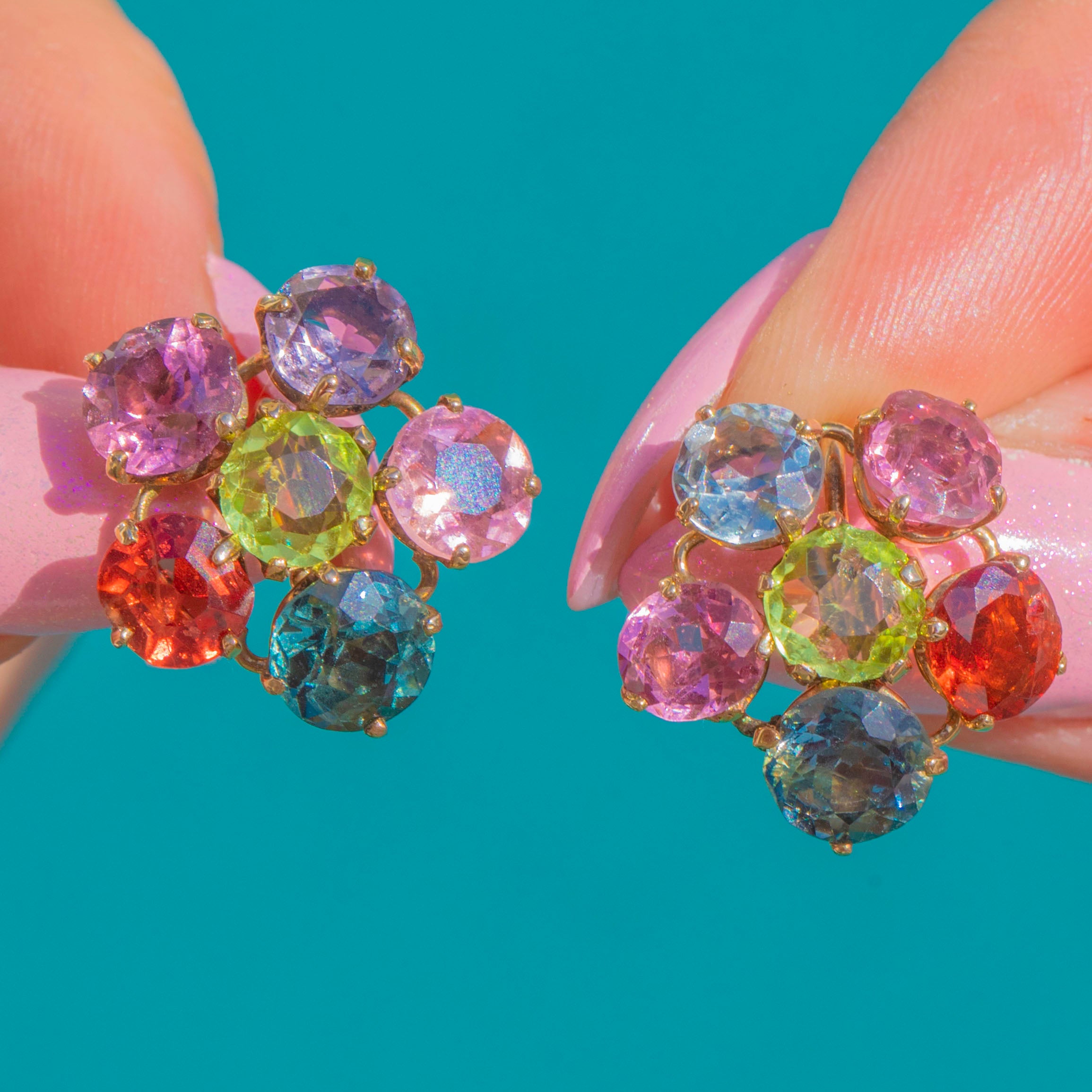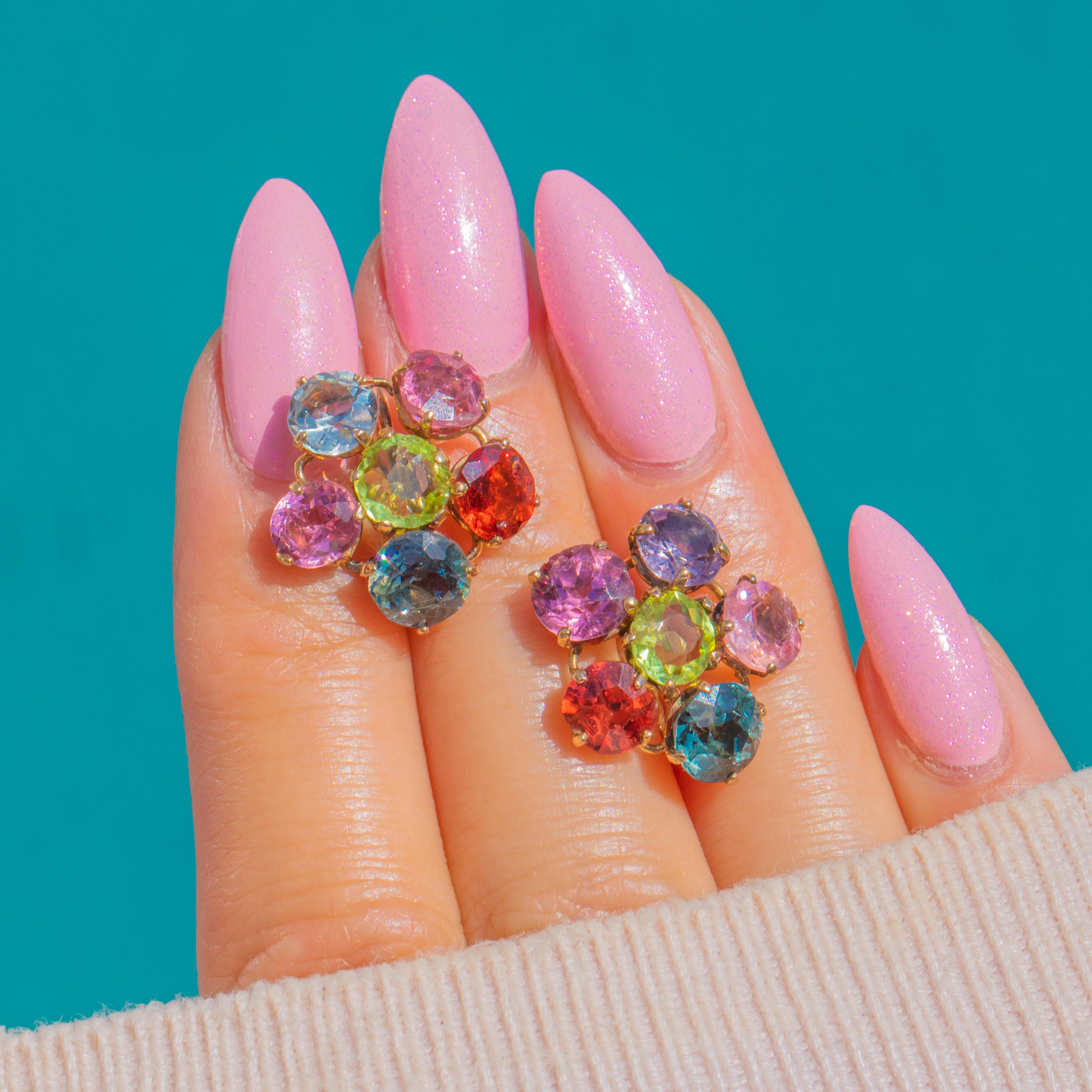 The gemstone medley is delightfully characterful: one earring is framed by Pink Topaz, Madeira Citrine, teal-blue/purple Spinel, Pink Topaz, and Aquamarine; the other by pale lilac Spinel, Pink Topaz, teal/greyish-purple Spinel, Madeira Citrine, and Pink Tourmaline. A perfectly poised pair with subtle asymmetry, they deliver that coveted mid-century charm in luscious colour and warm Gold.