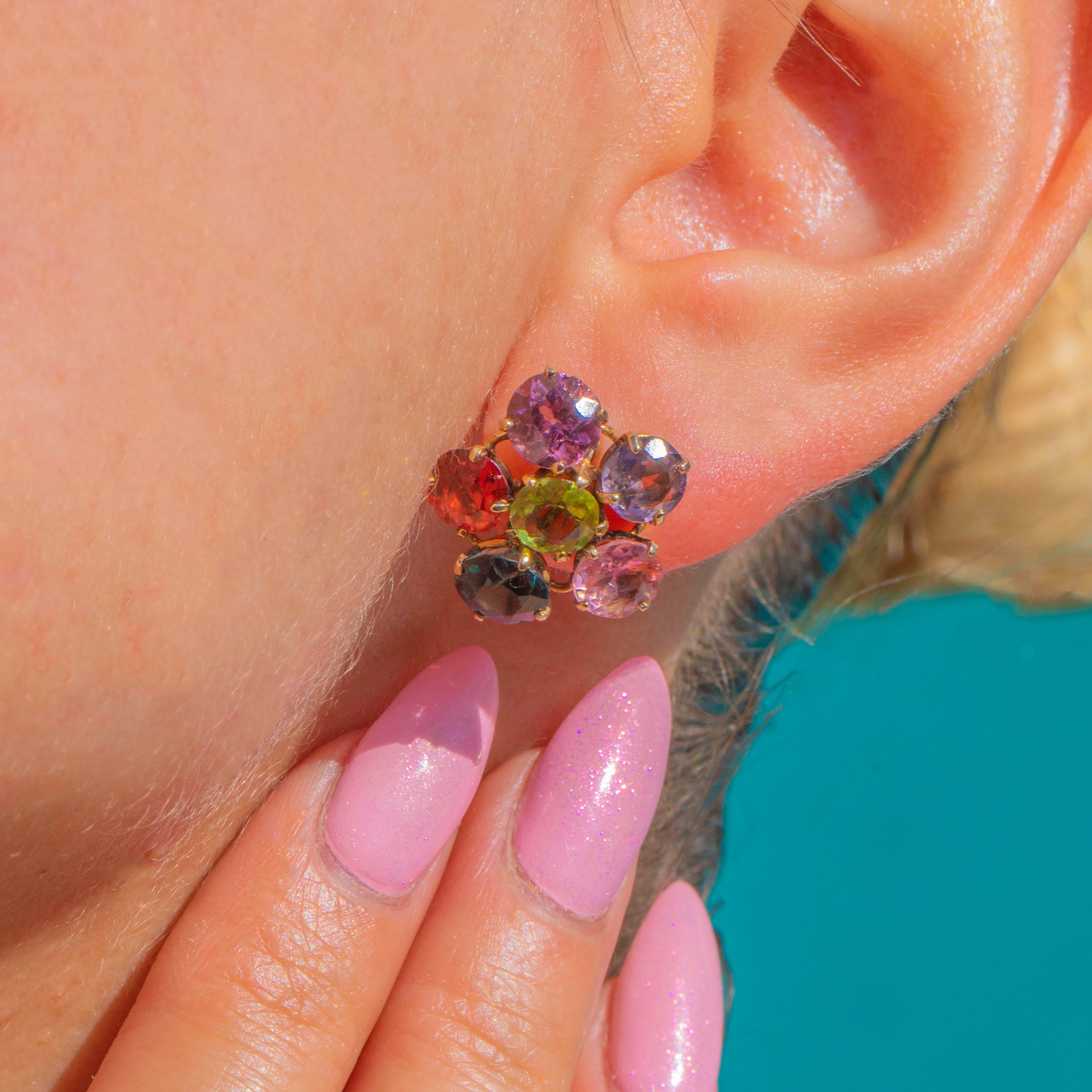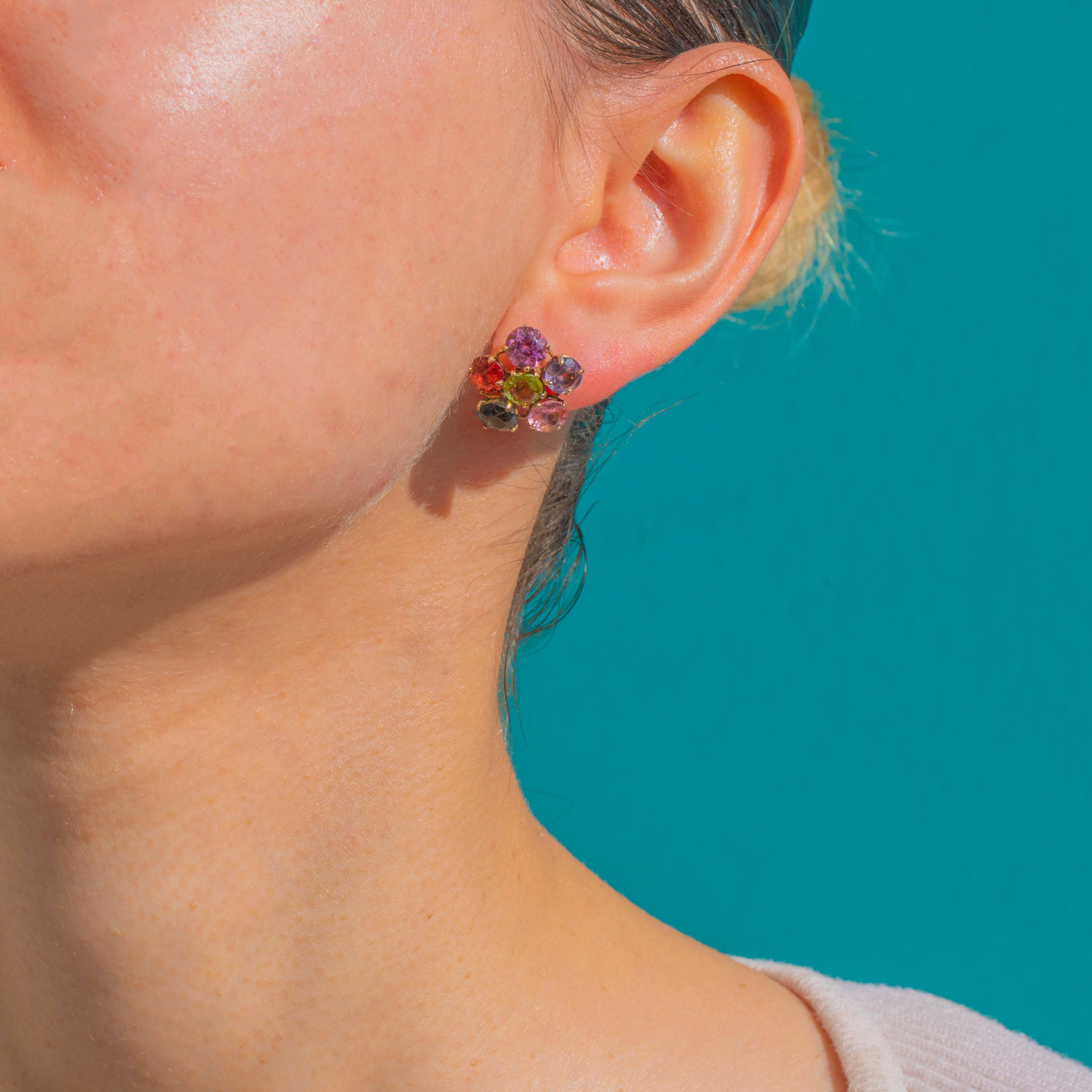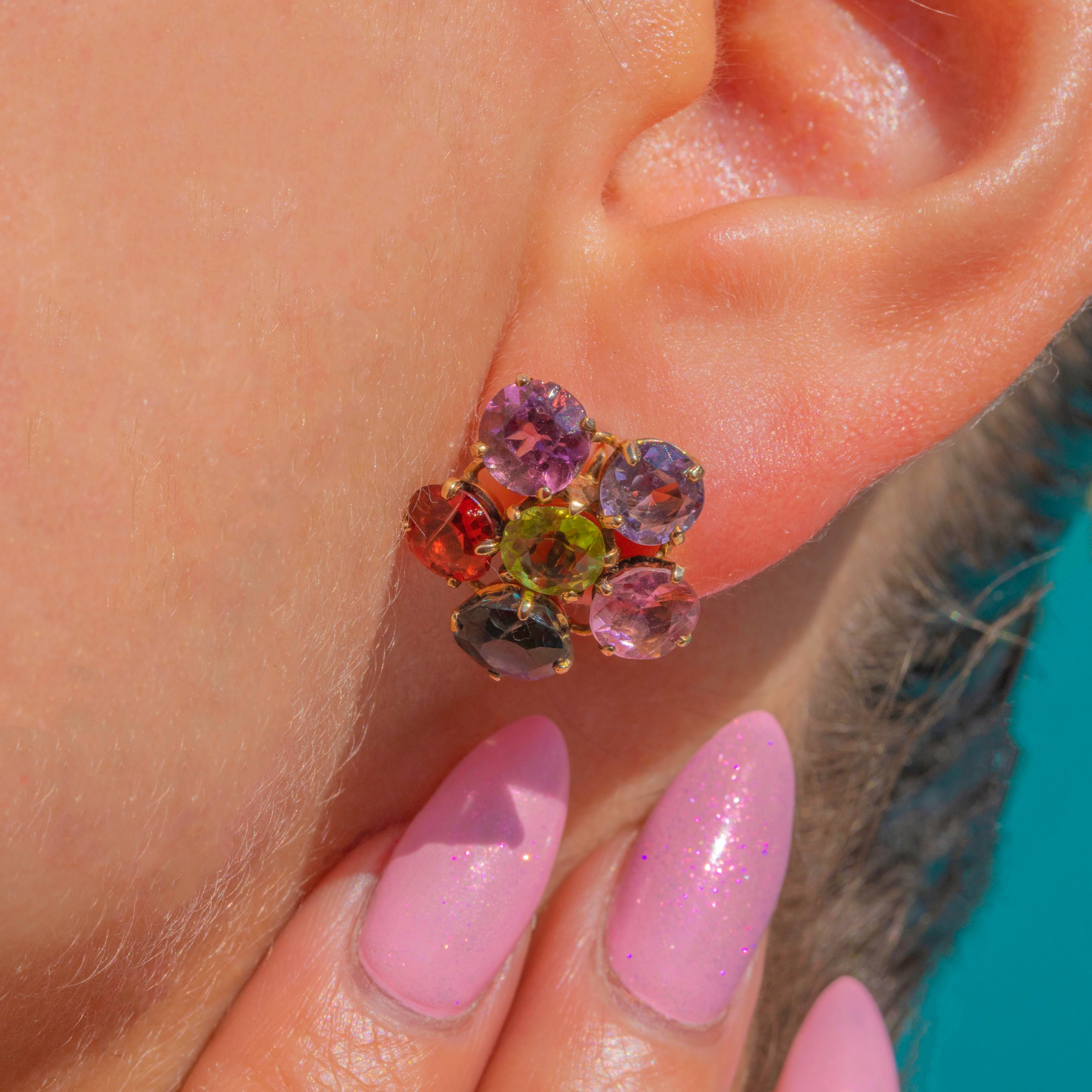 A jubilant bouquet of colour, these mid-century flower earrings are a joy to behold. Each earring centres on a lively Peridot, encircled by a halo of vibrant gemstones that shimmer in a tight floral cluster, creating a playful yet polished look that sits neatly against the lobe.
