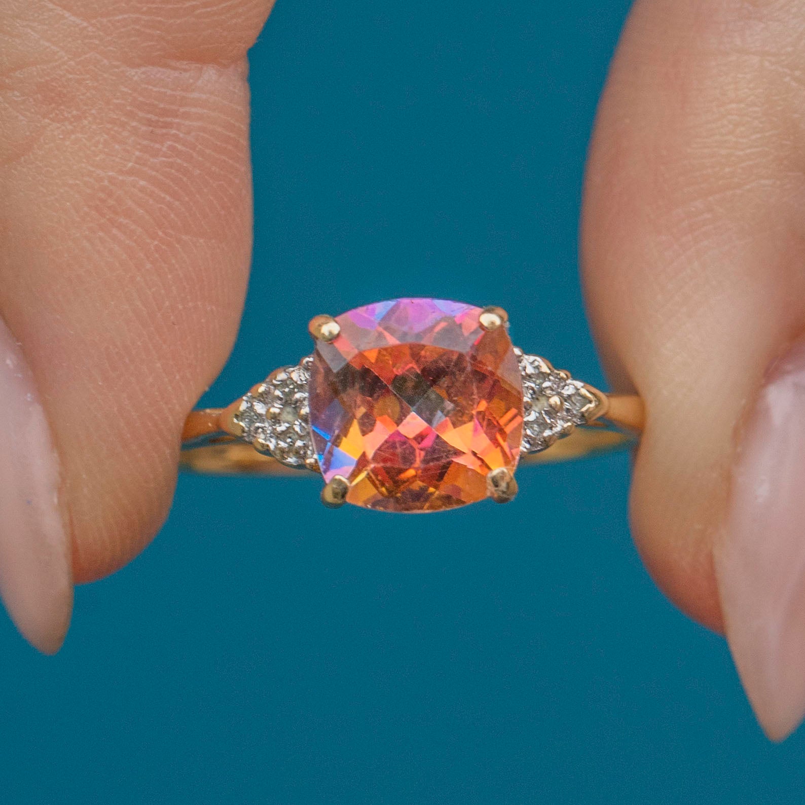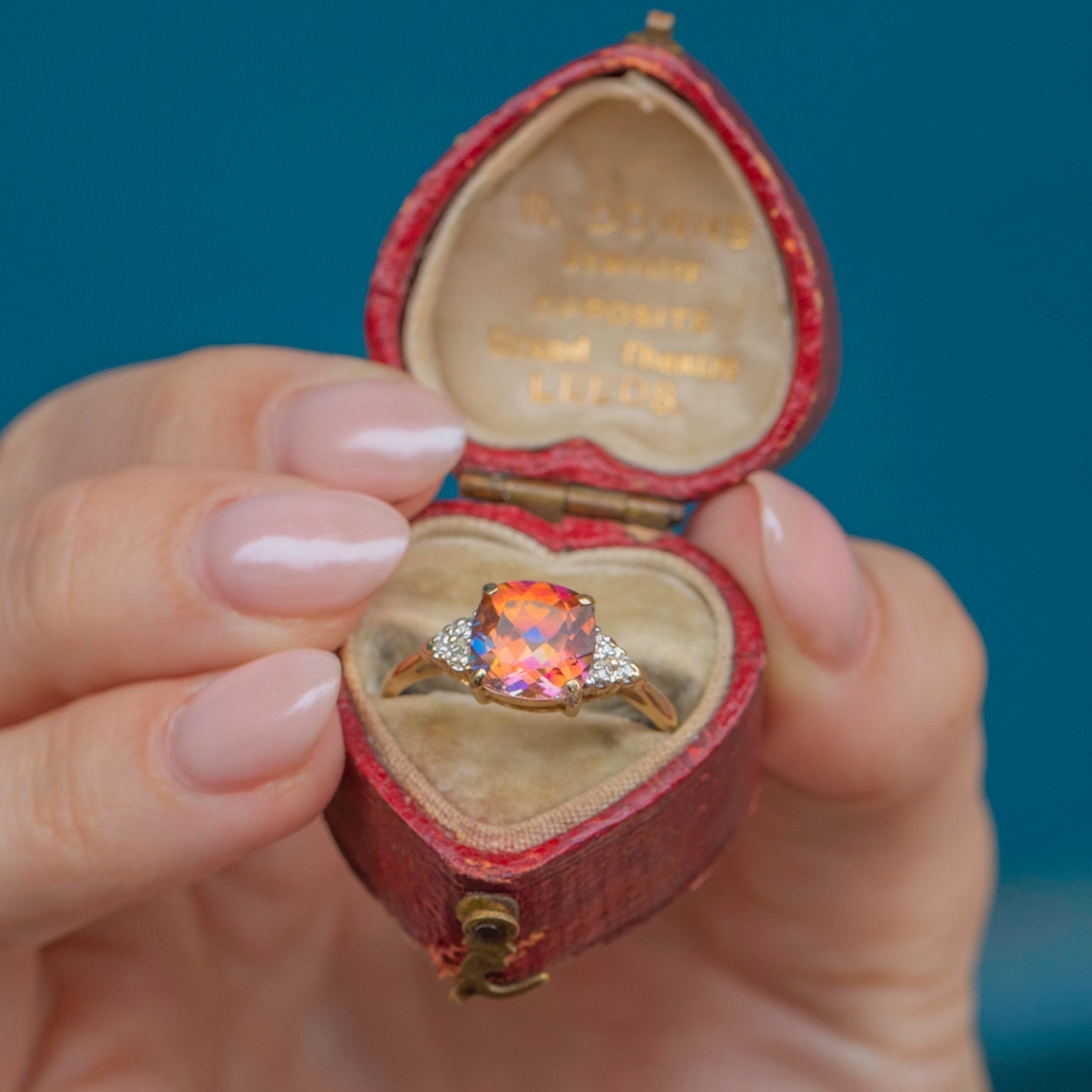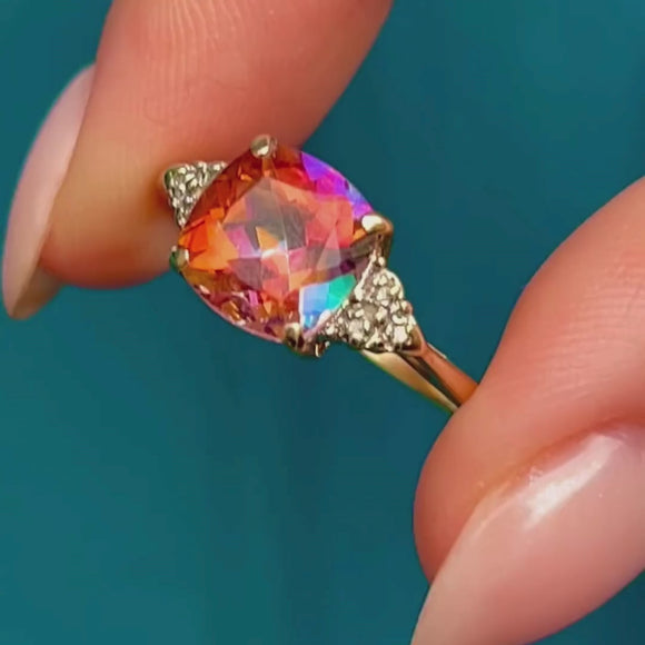 This 9ct Gold mystic Topaz Diamond cluster ring is a sweet treat for your jewellery collection! Centred by a fabulously faceted 2.20ct mystic Topaz, she flaunts a peachy core, graced with a rainbow of colour across her surface.