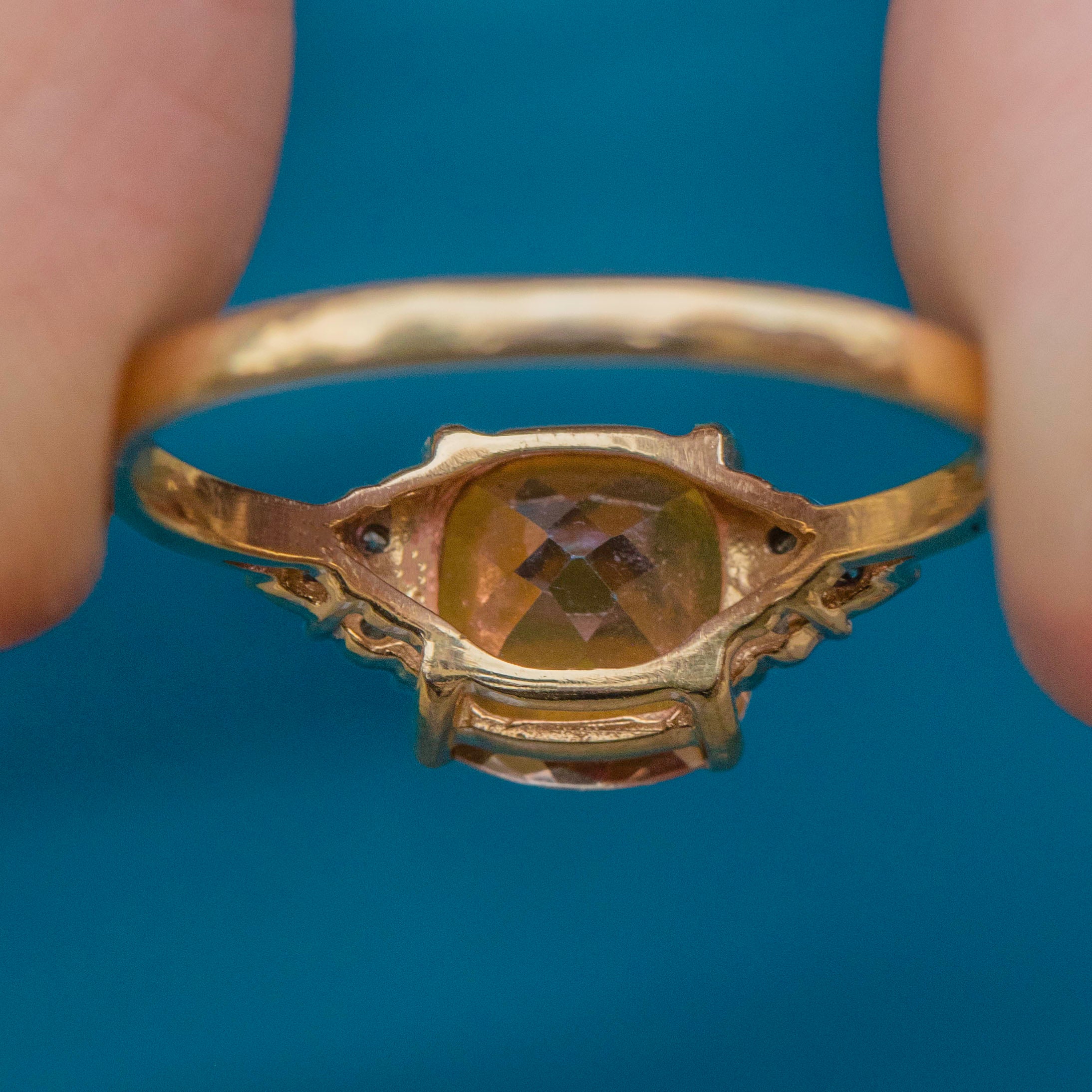 Her Mystic Topaz is accompanied by scintillating Diamond encrusted shoulders adding a sparkling accent. Not only is this Vintage Gold ring endlessly pleasing to look at, but she is also super comfortable to wear. The colour of that Mystic Topaz just melts into her sumptuous 9ct Gold band- how could you resist her?!