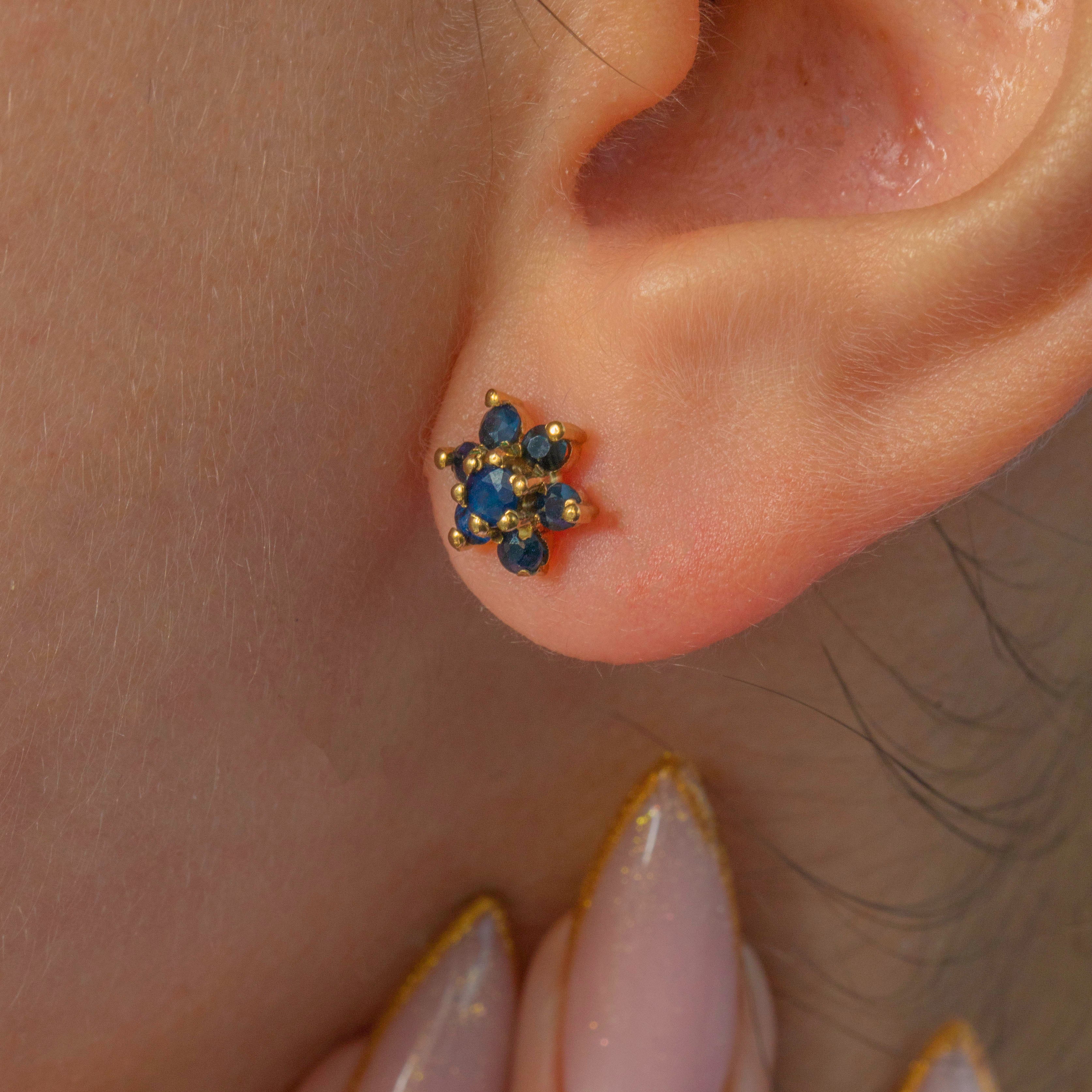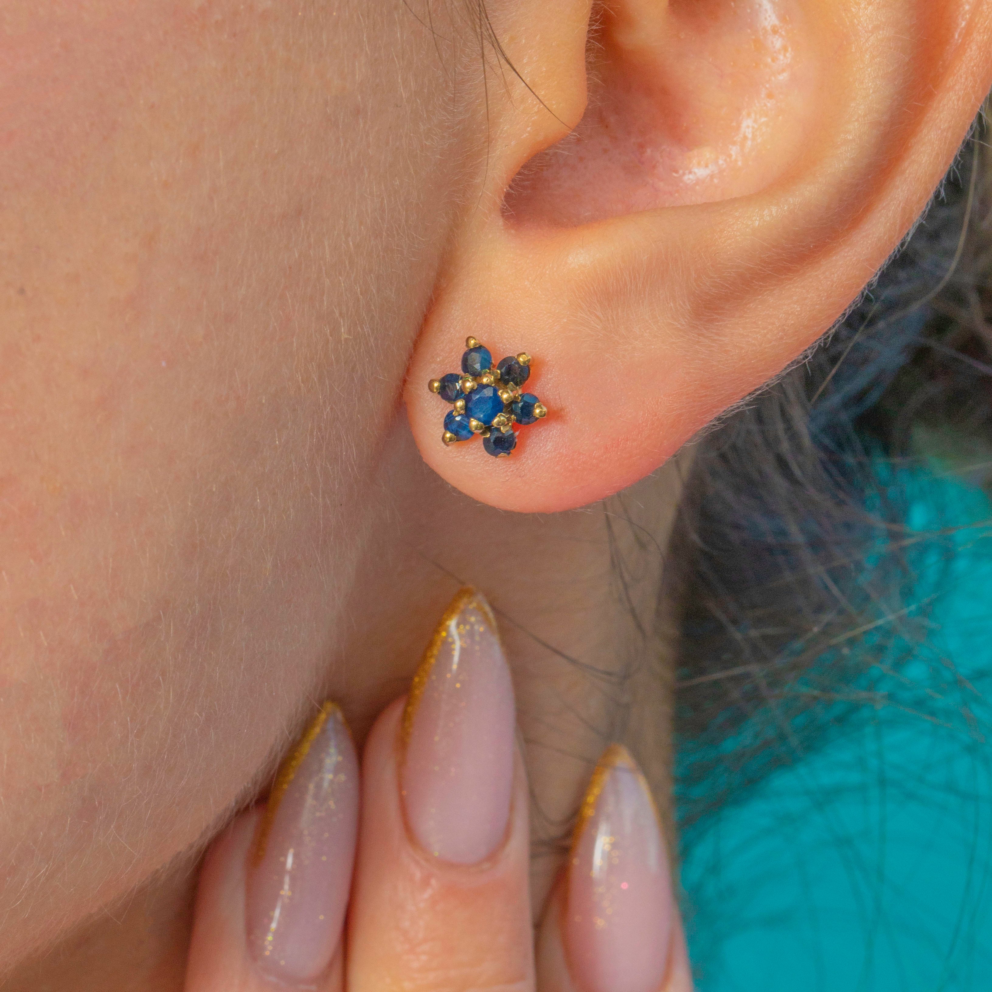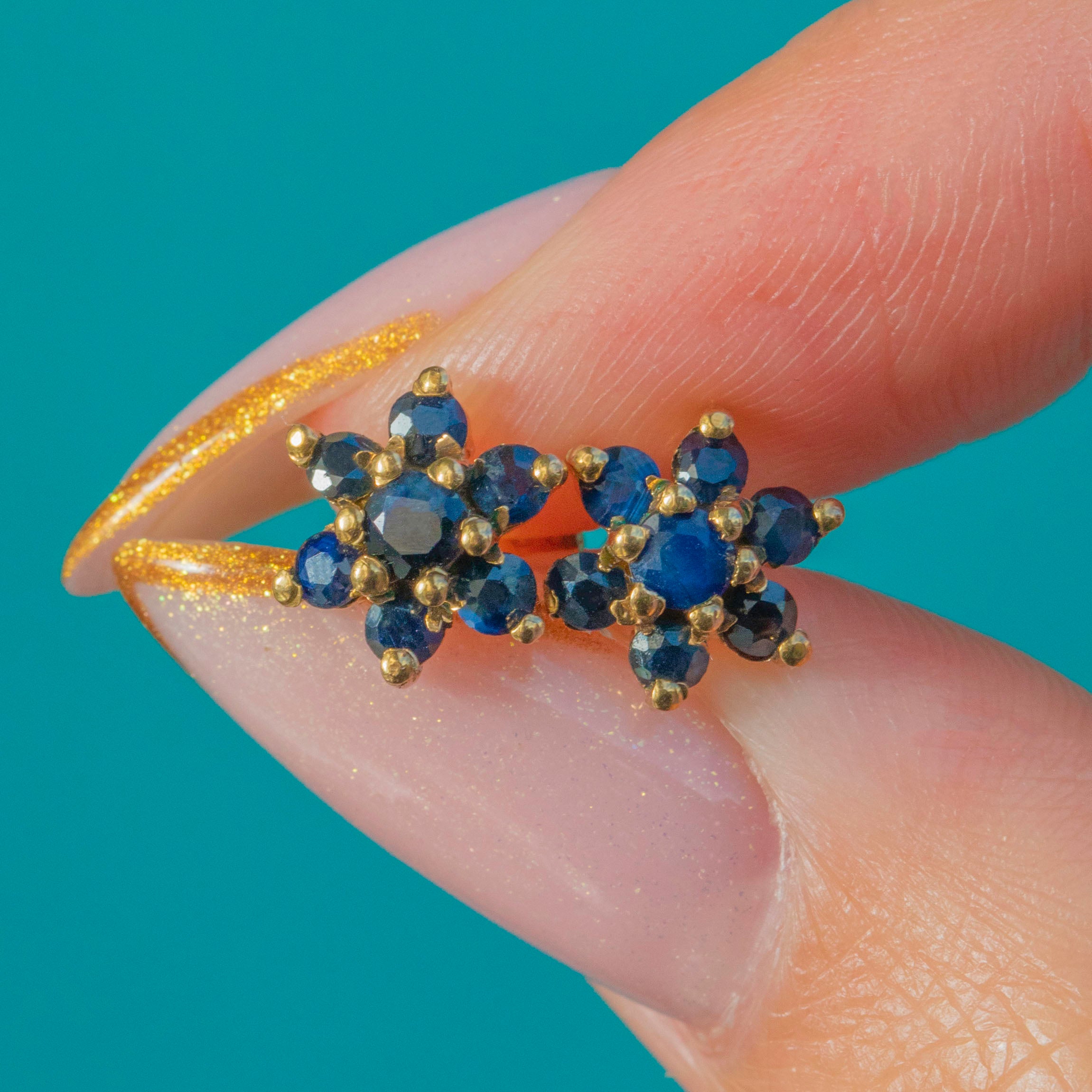 A pretty pair of Vintage Sapphire cluster studs crafted in solid 9ct Gold and fully hallmarked for 1977. Each earring forms a delicate floral-style cluster set with rich inky blue natural Sapphires, totalling approximately 0.50cts. The colour is deep and velvety, offering a classic sparkle that works beautifully for everyday wear.
