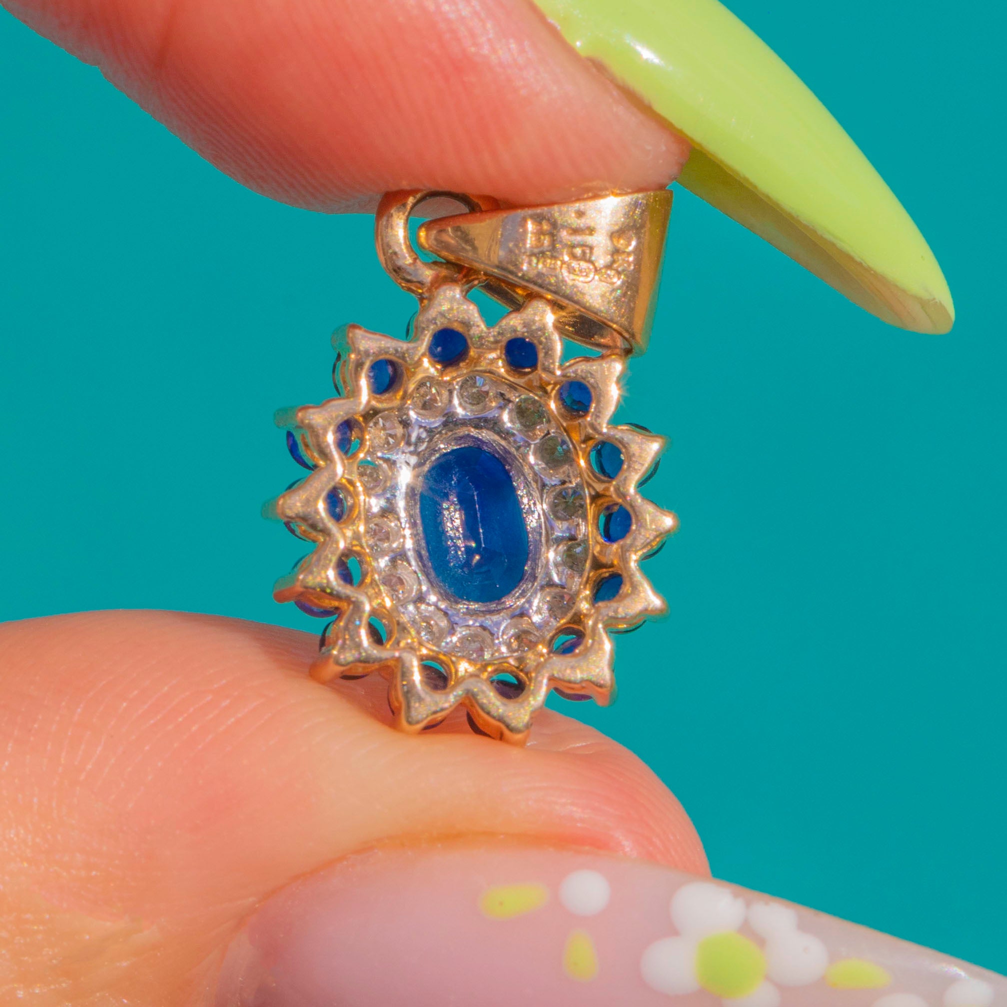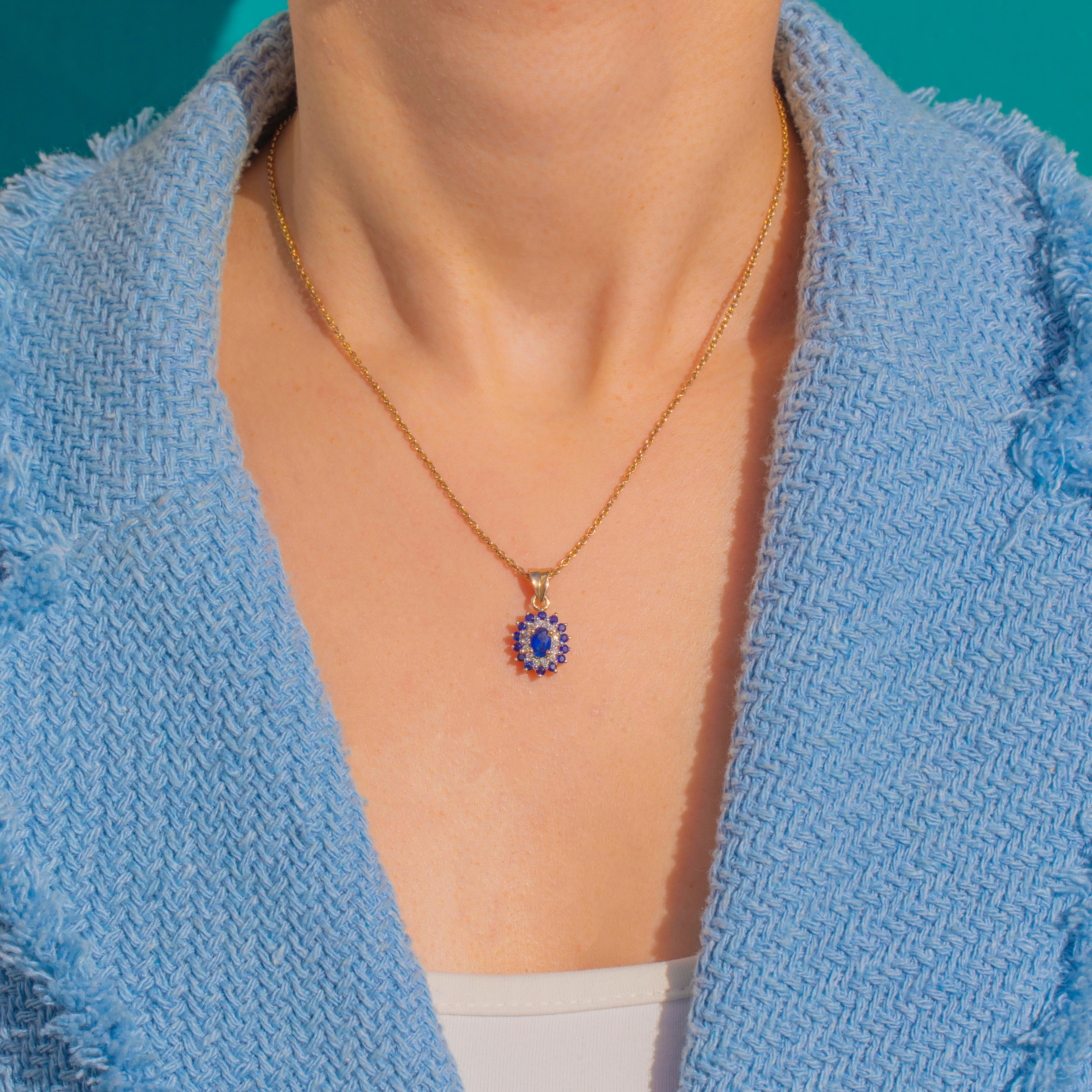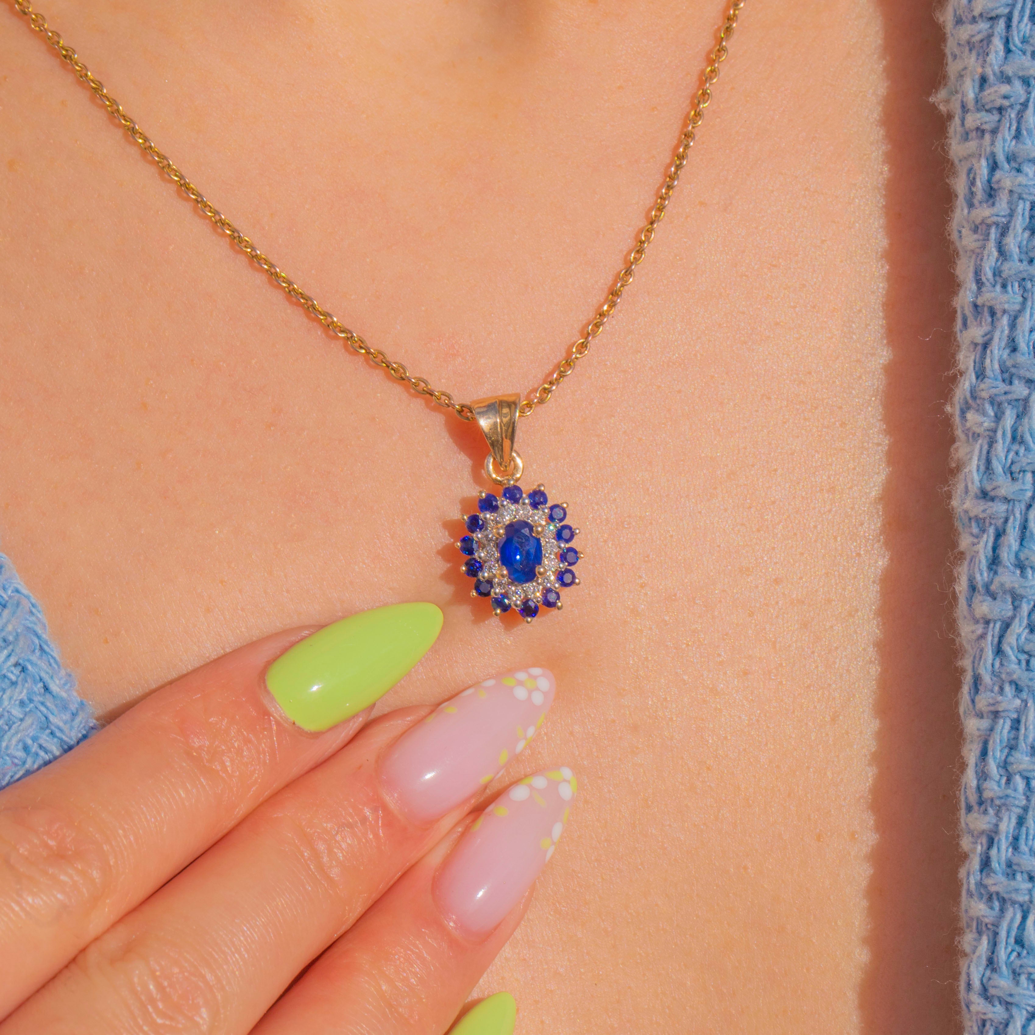 A luminous burst of blue, this Vintage 9ct Gold cluster pendant is centred on an oval Sapphire, encircled first by a twinkling halo of Diamonds and then by a further ring of rich midnight‑blue Sapphires. The concentric halos and pretty scalloped outline create a classic rosette silhouette that feels refined and feminine, with the warm Gold lending a timeless, luxe glow.