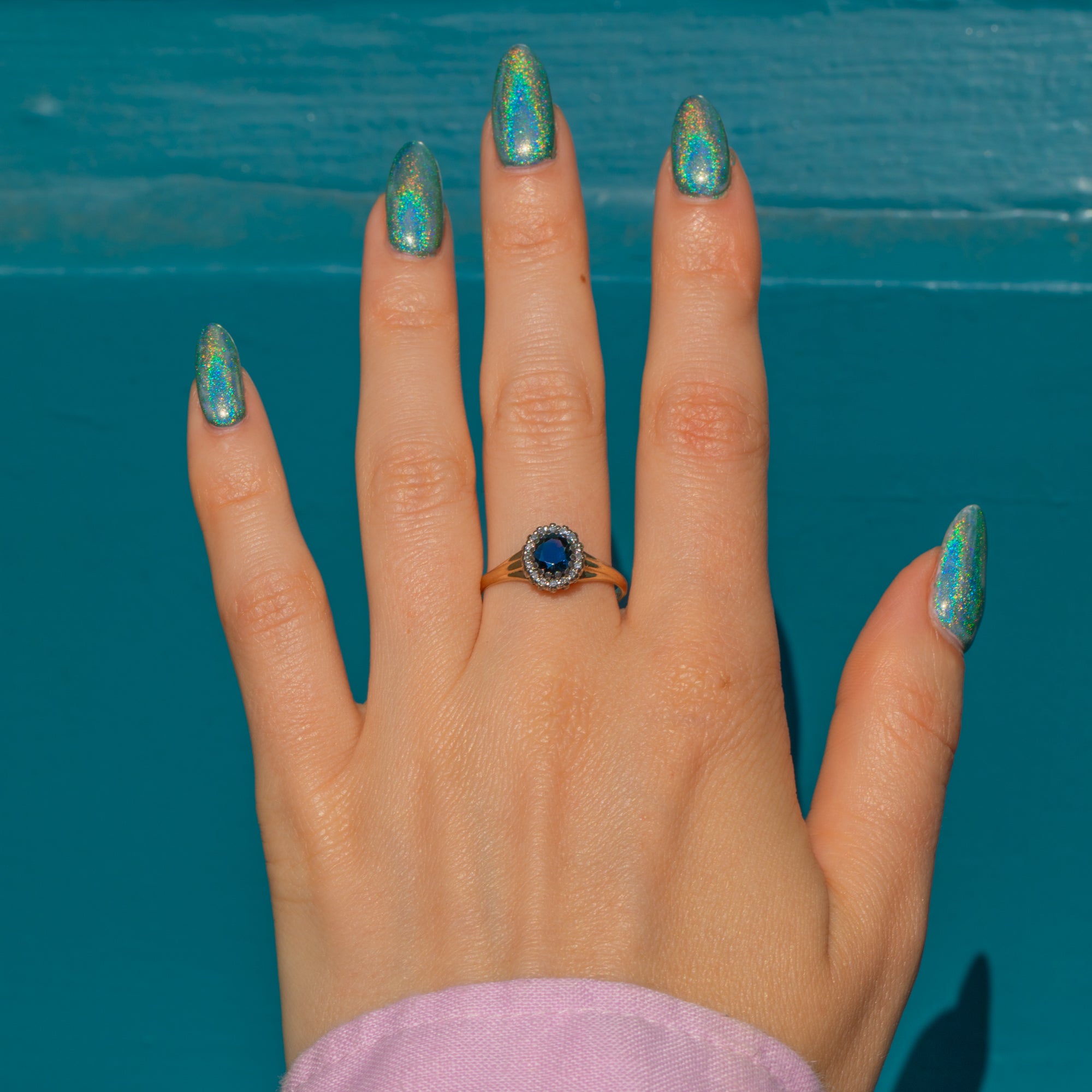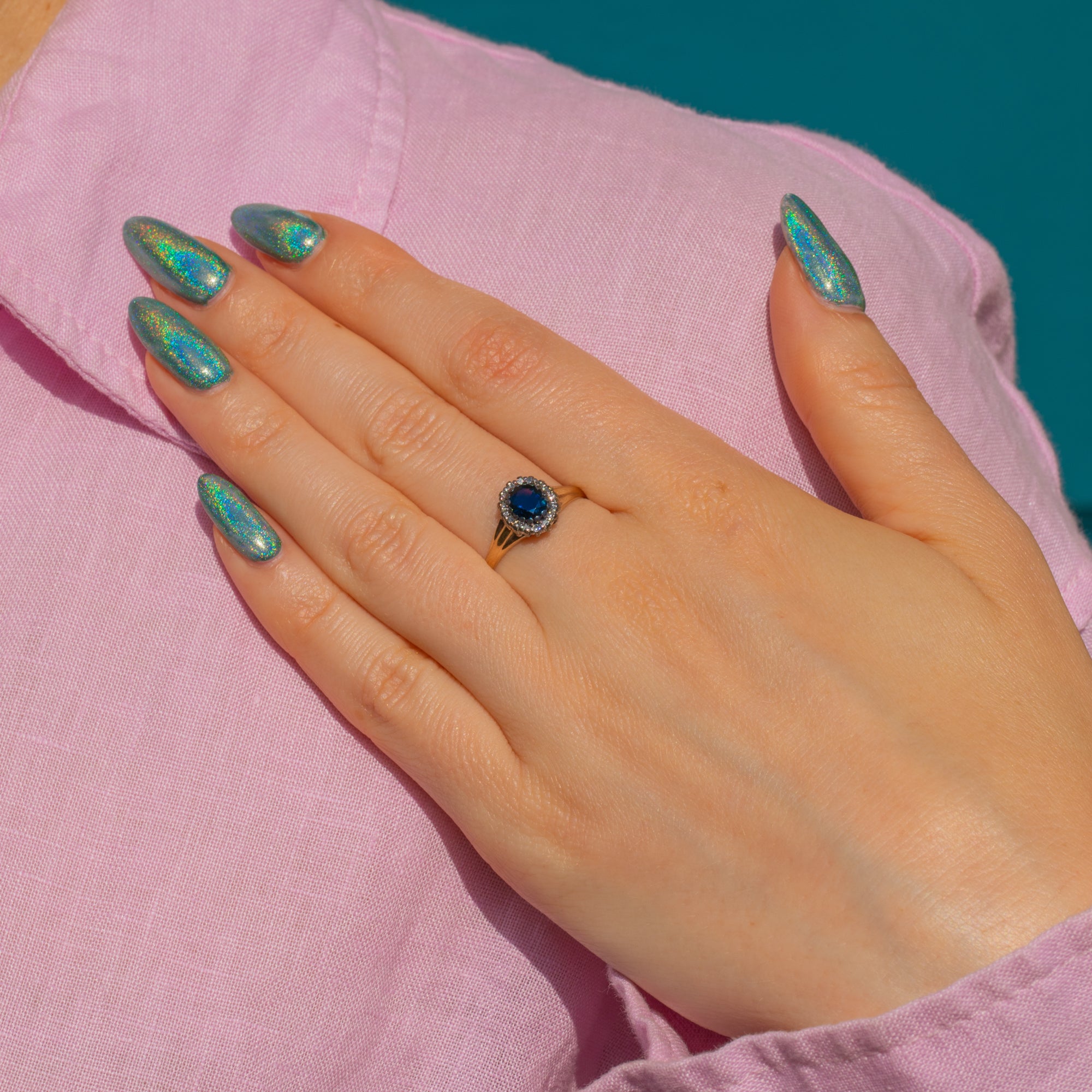The solid 9ct Gold will elegantly wrap around your finger, with the curved shoulders perfectly framing the exquisite gemstone cluster. With open claw settings allowing the light to stream through the deep blue 0.70ct Sapphire and scintillating Diamonds, this enchanting vintage Sapphire ring is guaranteed to provide you with ample wearing pleasure!