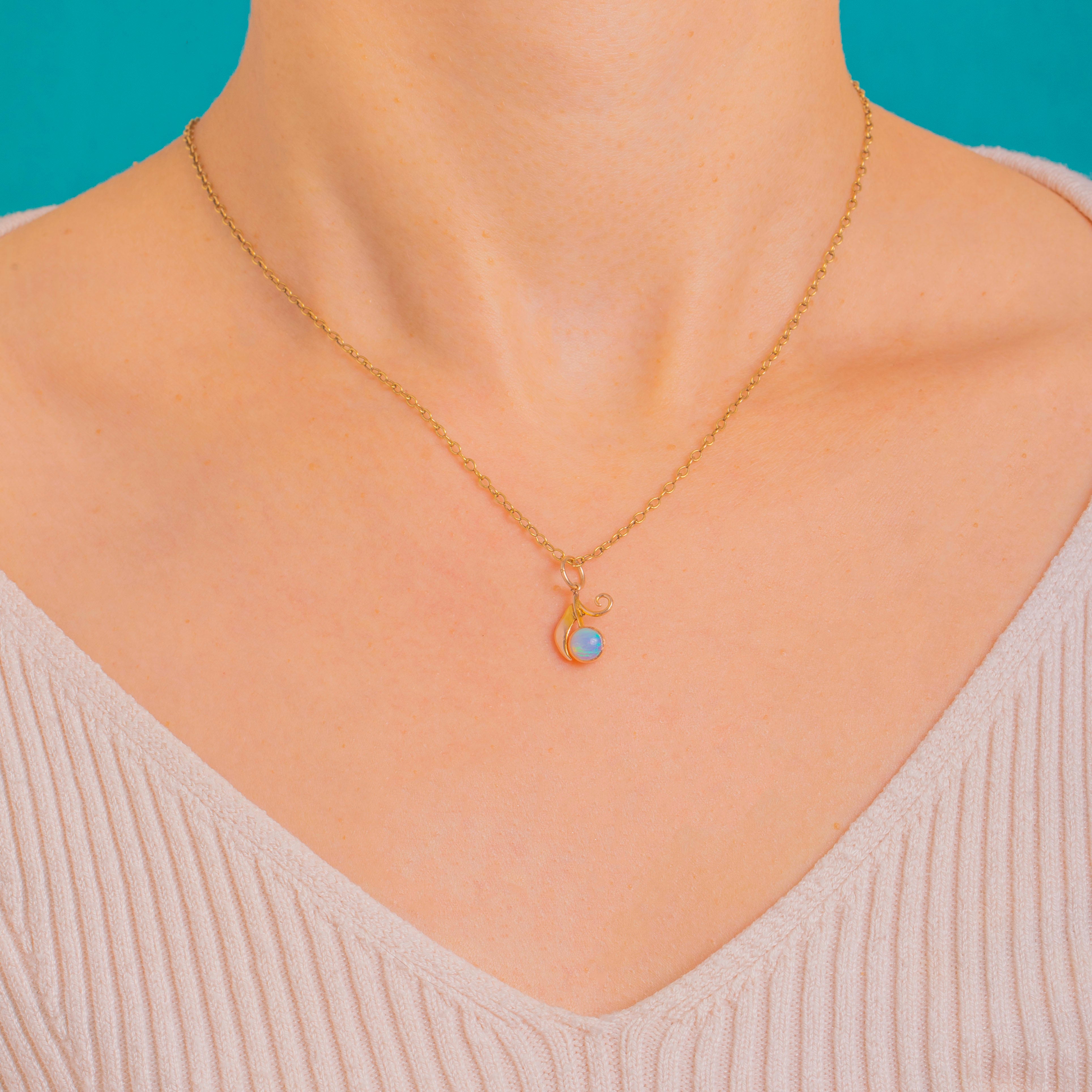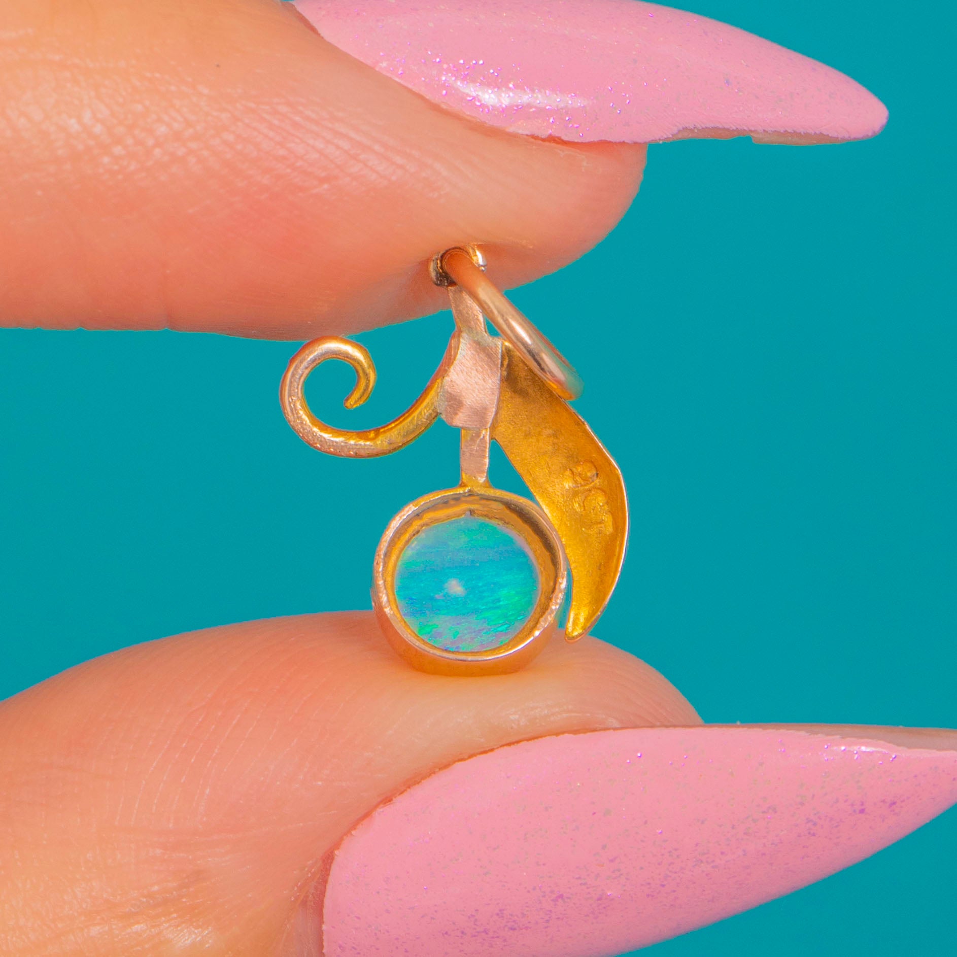 Sweet and sculptural, this petite “berry” charm pairs a luminous round Opal with a softly polished 9ct Gold leaf and a delicate curled tendril. The Opal’s blue-green play of colour glows against a smooth bezel, while the organic foliate detailing lends a romantic, Art Nouveau flourish.