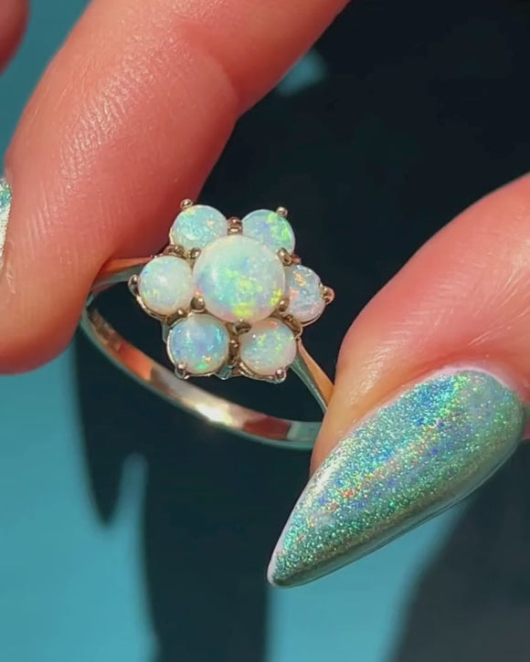 This 9ct Gold Opal flower cluster ring is bursting with vivacious hues! With punches of green and flashes of peach, this Vintage Opal ring will bring character to your ring stack.