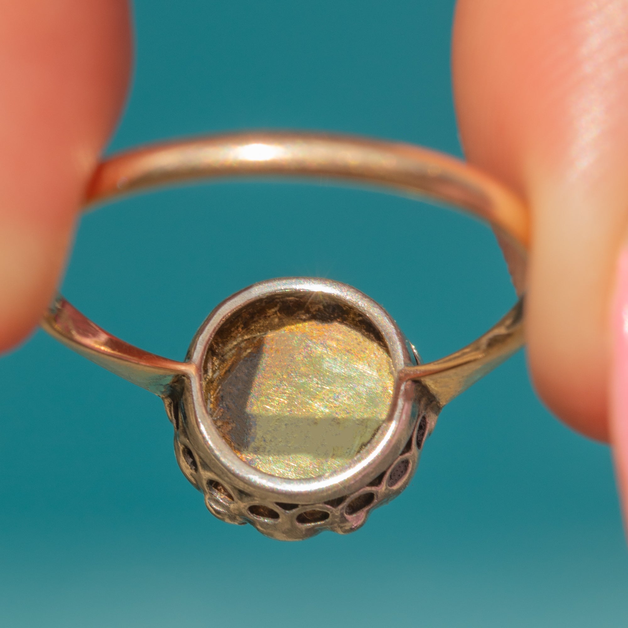 This vintage flower ring is complete with a glossy 9ct Gold band, radiating a gorgeous warmth and complementing the floral ring face wonderfully!