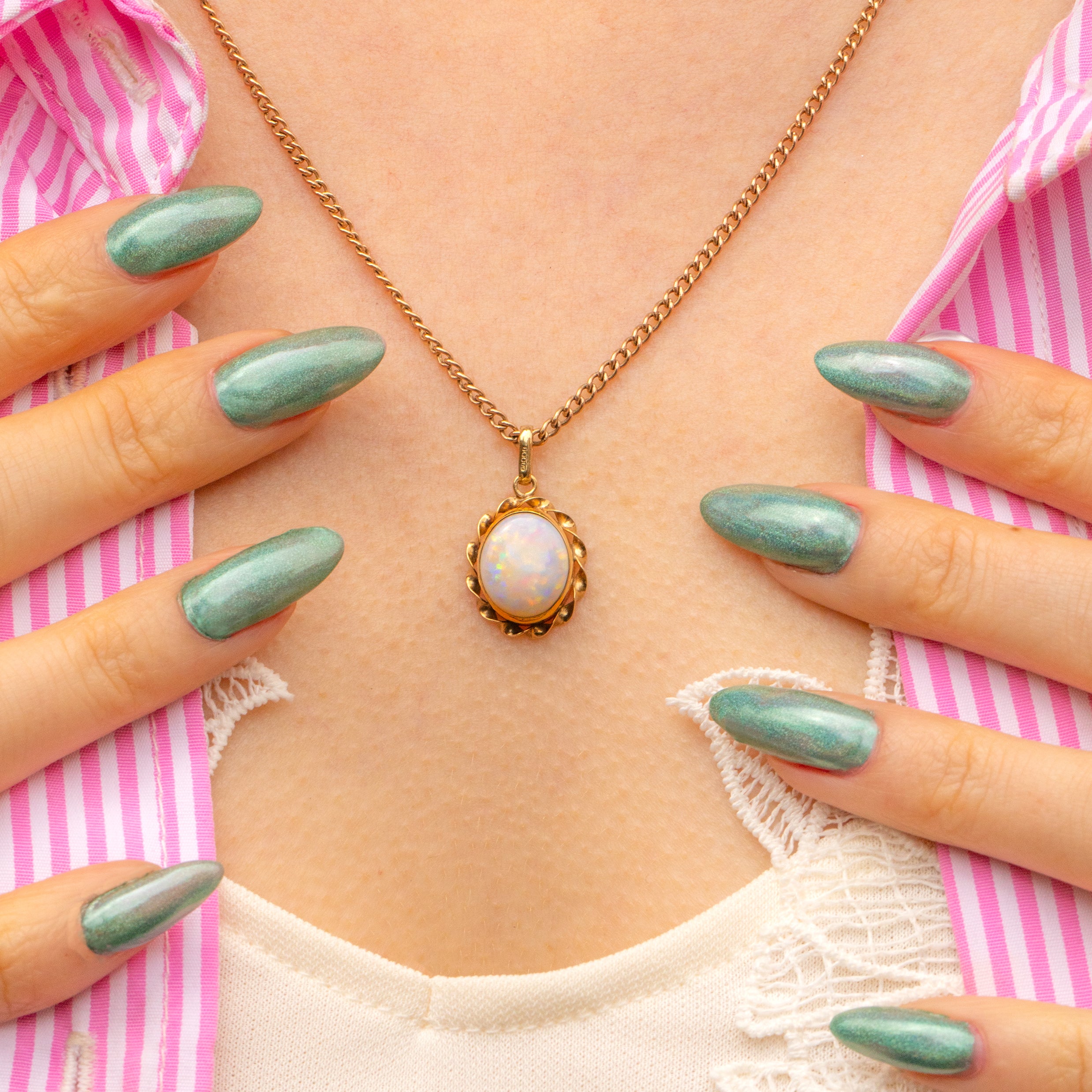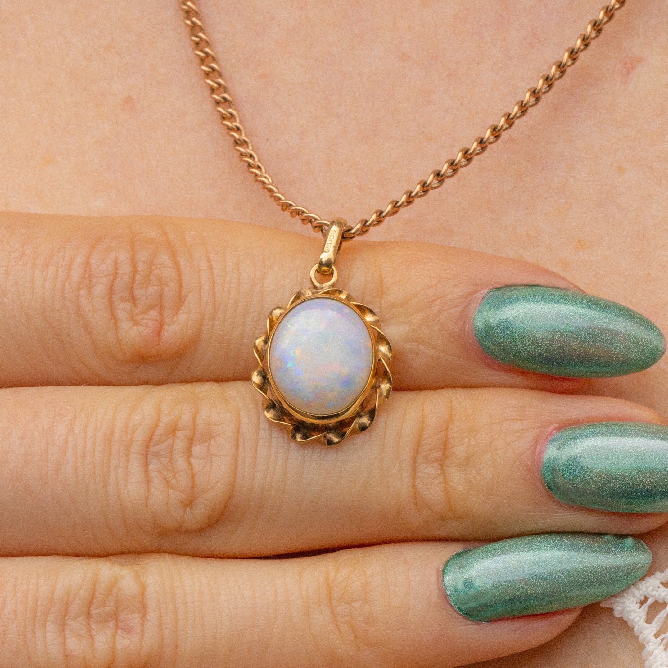 The 1.95ct Opal shimmers with hints of neon green and electric blue across its smooth cabochon surface, hugged by a softly spiralling rope border adding a decorative finish. Crafted from solid 9ct Gold and offered in excellent condition, this vintage Opal pendant promises years of wear and enjoyment!