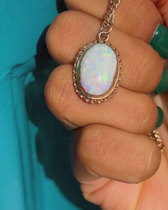 This vintage 9ct Gold Opal pendant is truly eye-catching! The 5.00ct Opal has a heavenly opaque body revealing a firework display of colours when light hits the gemstone's curvaceous body.