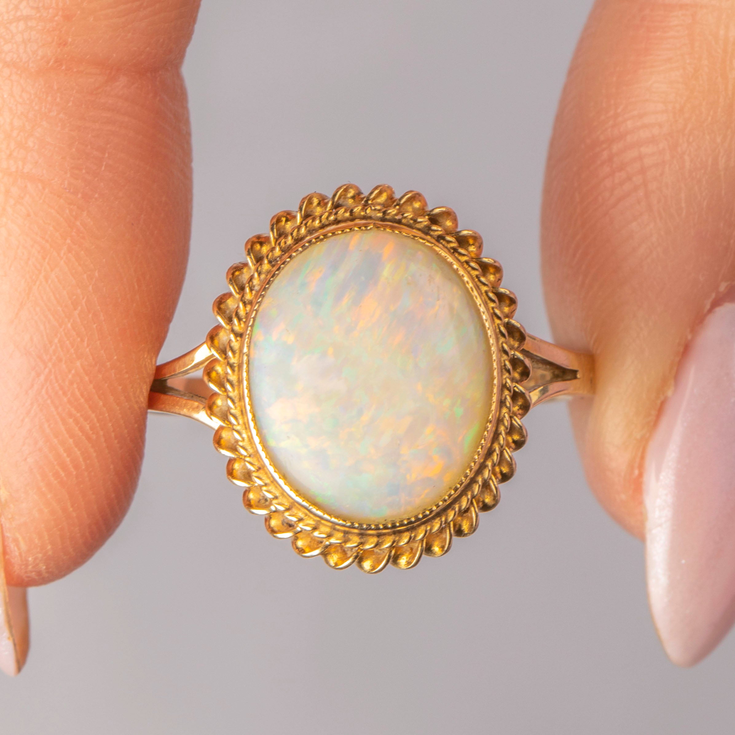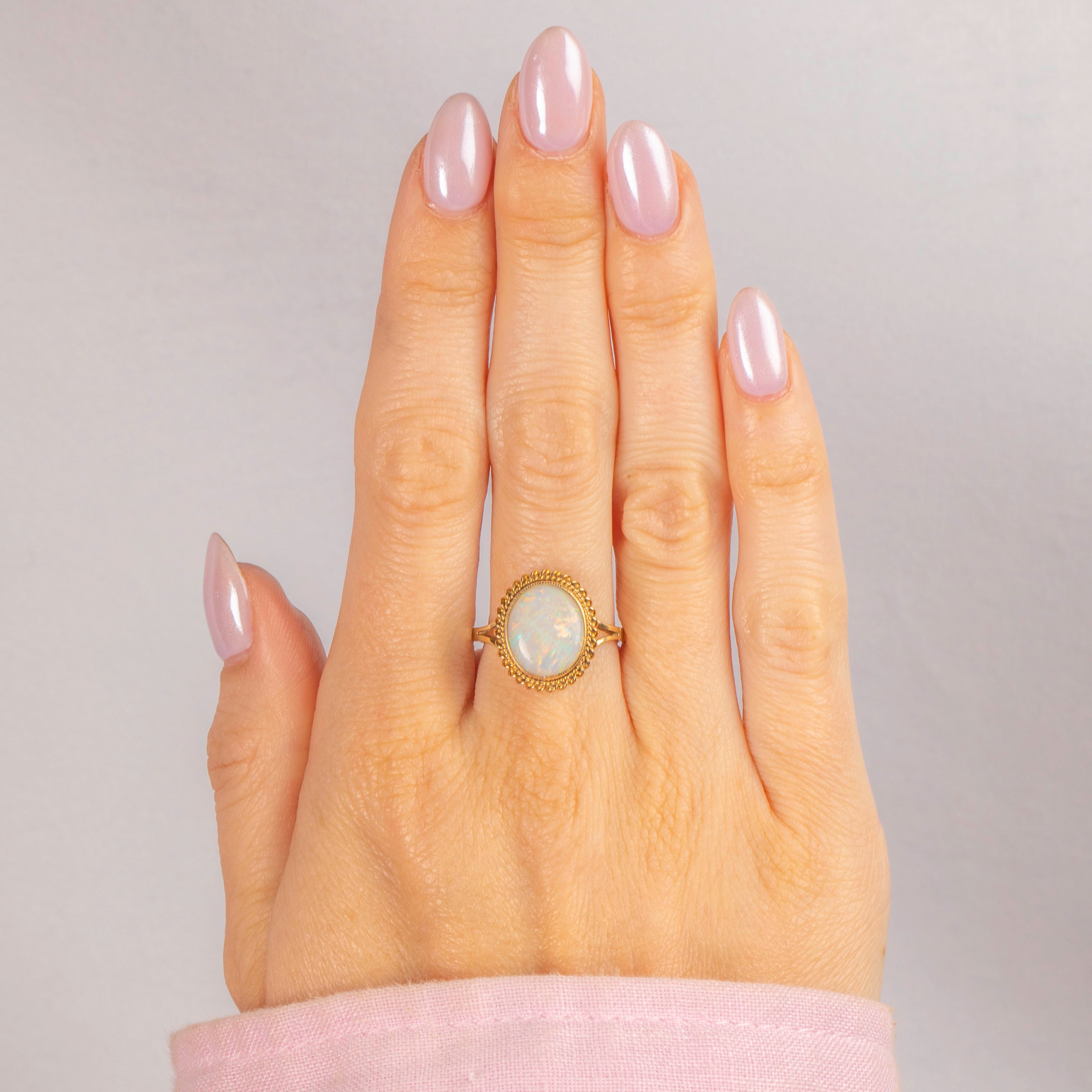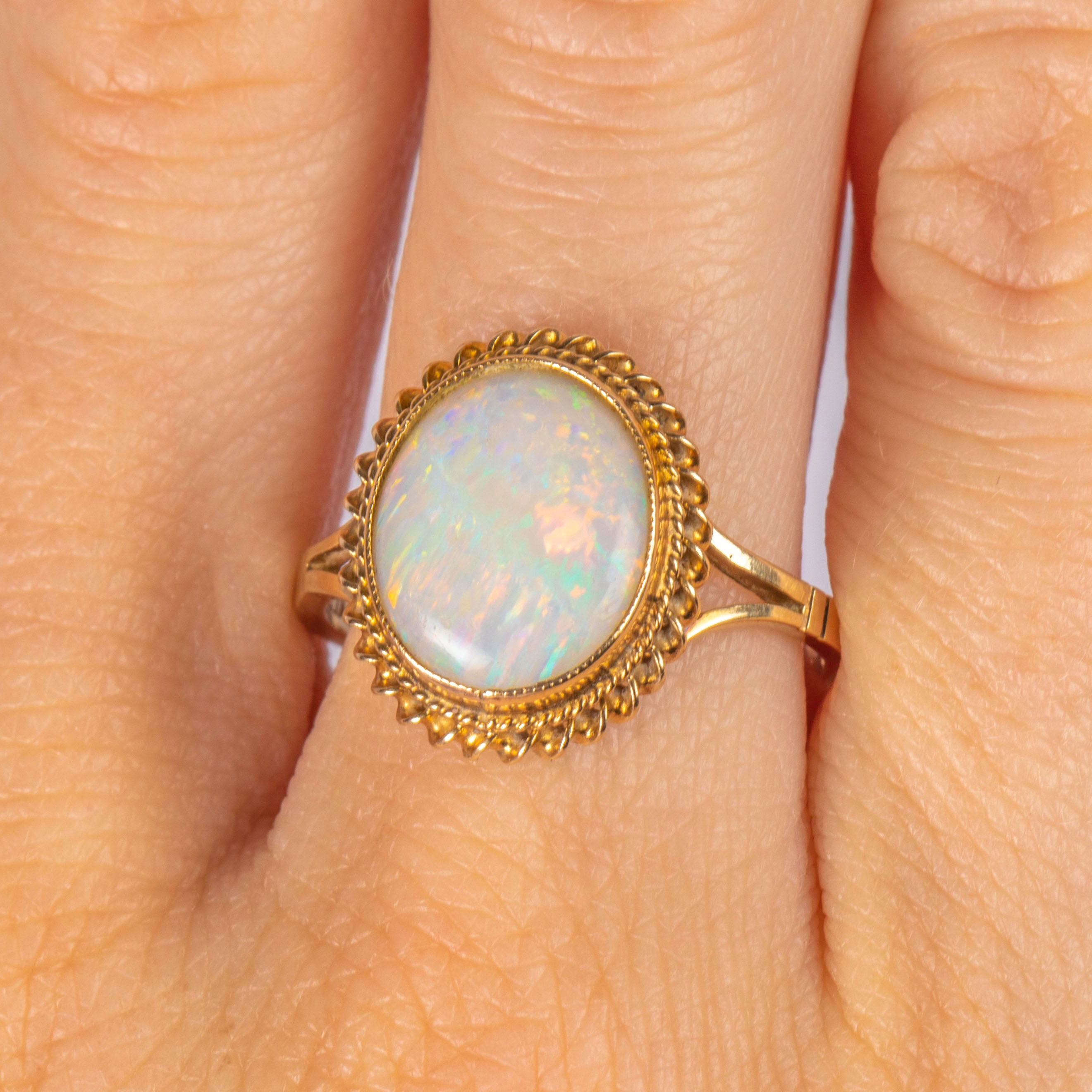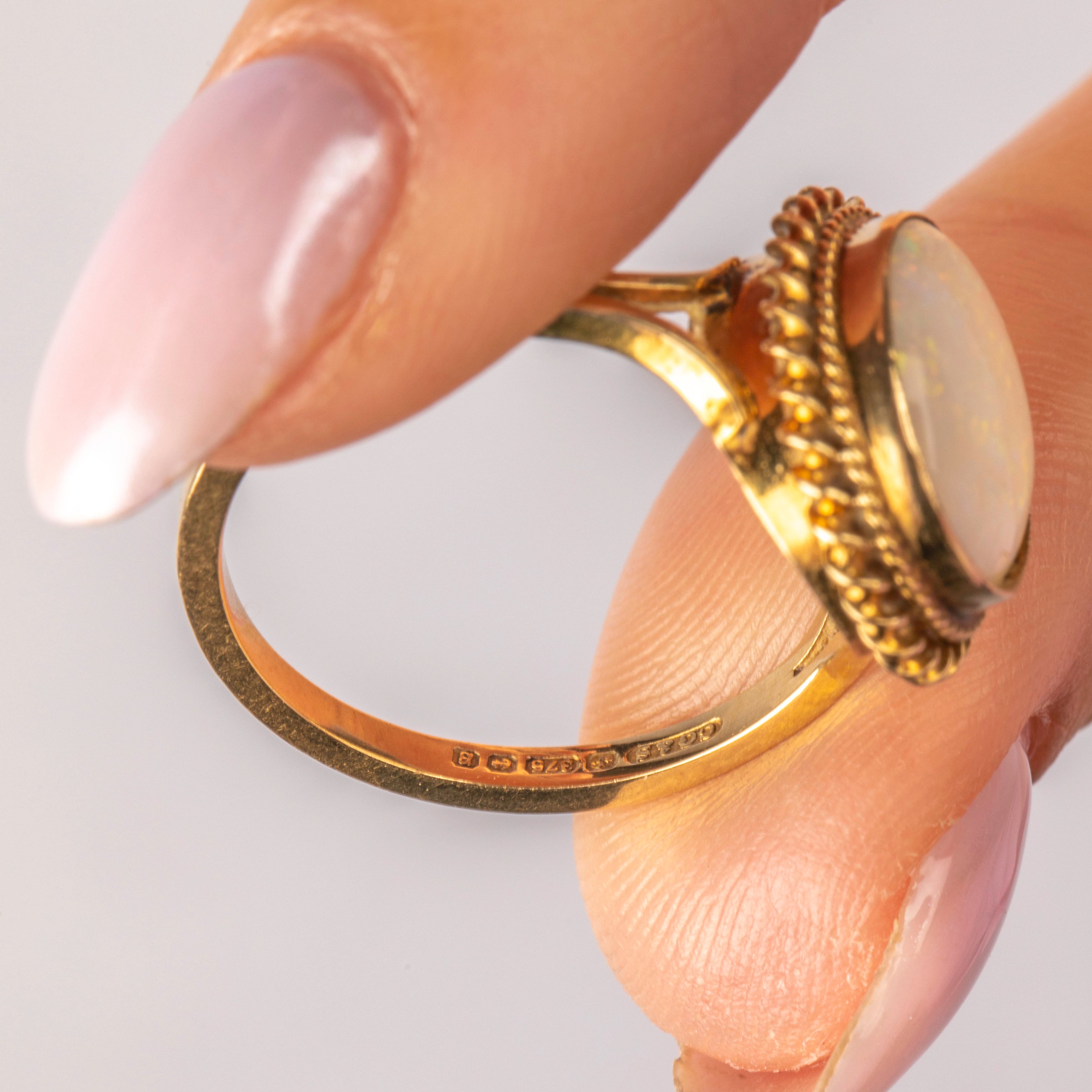 EXCELLENT. This 9ct Gold Opal solitaire ring is in excellent condition! The Opal sits securely within its setting, surrounded by a securely soldered rope border. The Opal has a lovely play of colour with her smooth cabochon cut flaunting no damage to note. With a full set of hallmarks, we can accurately date this ring to 1976, making her a true Vintage treasure!