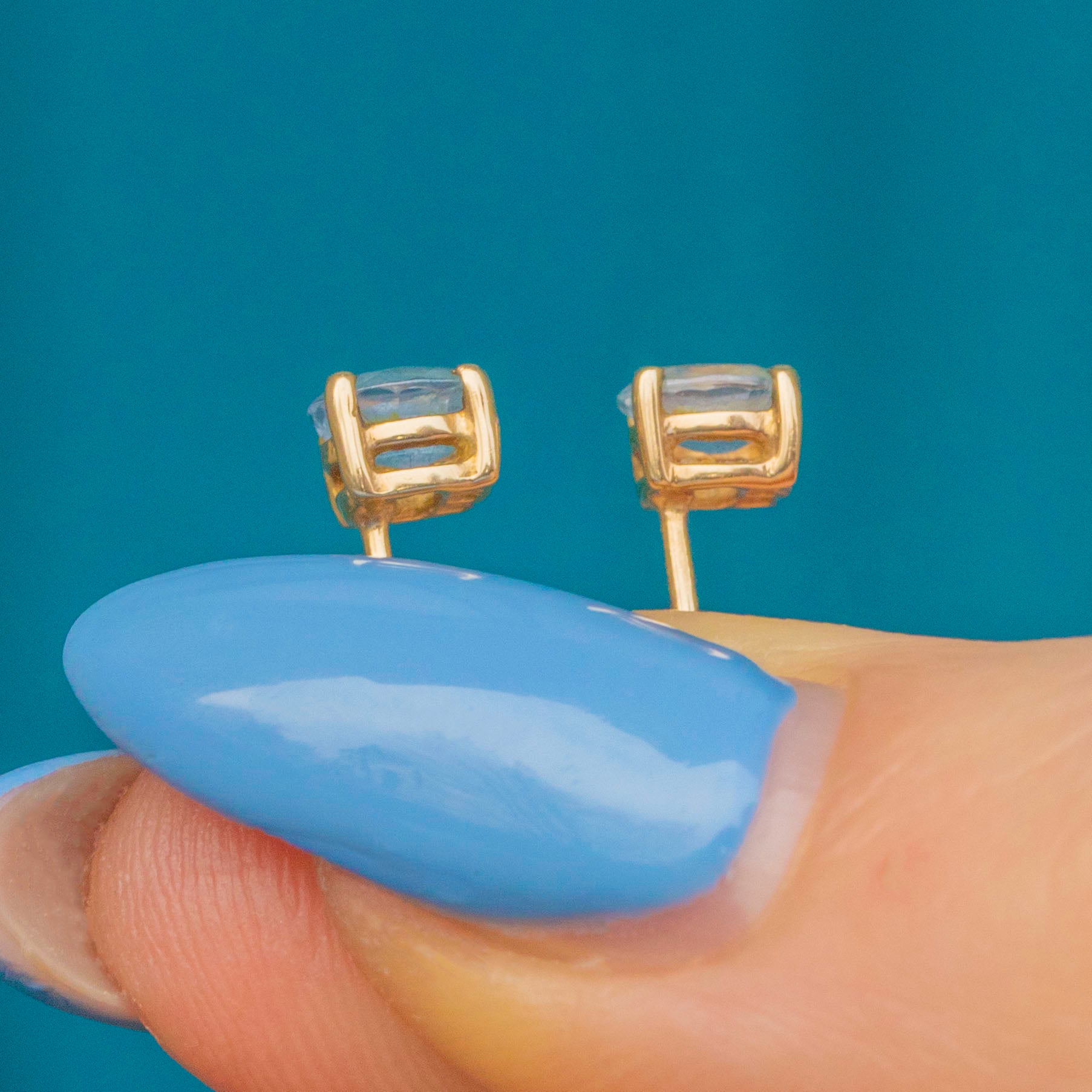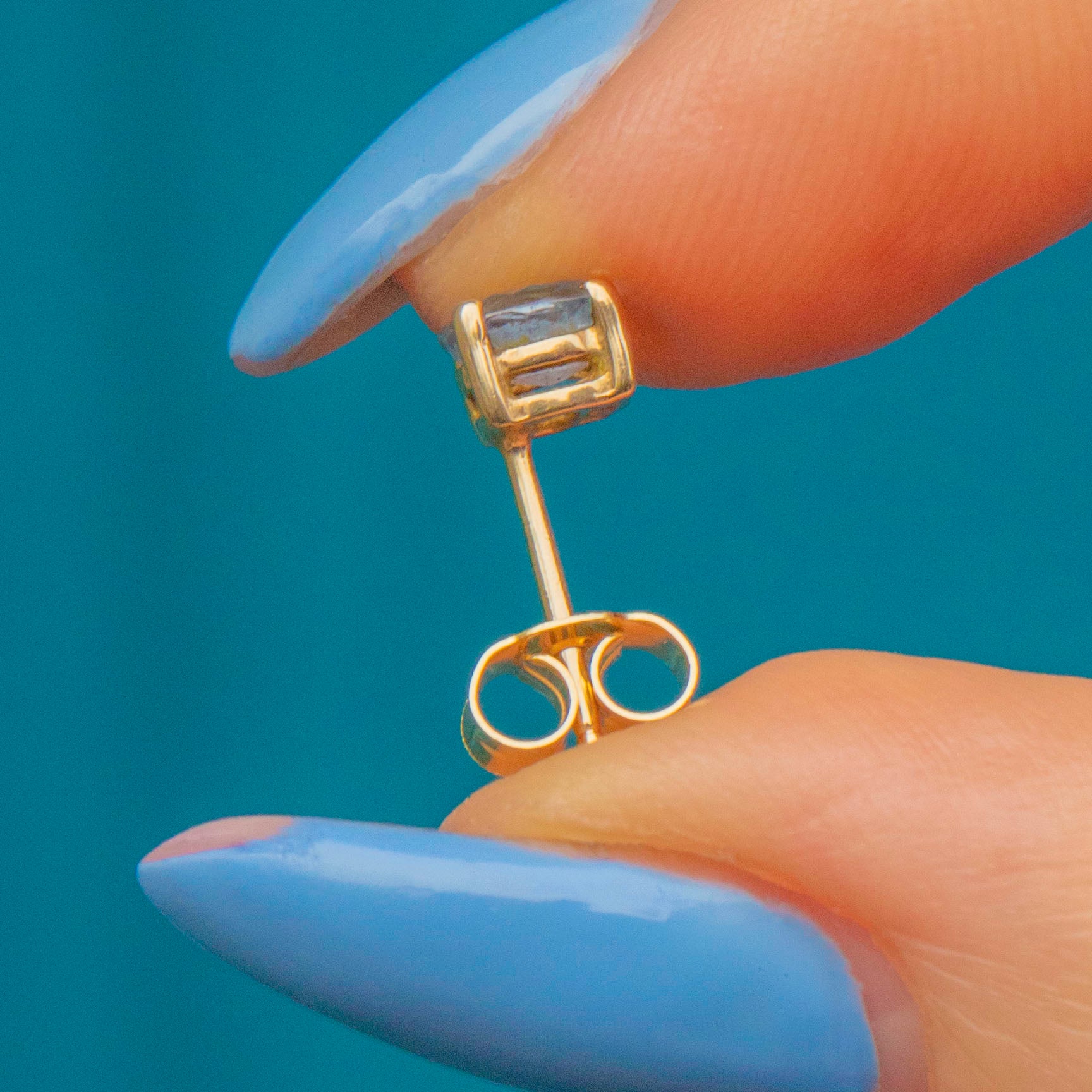 EXCELLENT. These 9ct Gold Pale Blue Sapphire stud earrings are in excellent condition with only minimal wear visible upon close inspection. The Sapphires are securely set and the Gold is buttery with snug-fitting butterfly backs providing secure closure.