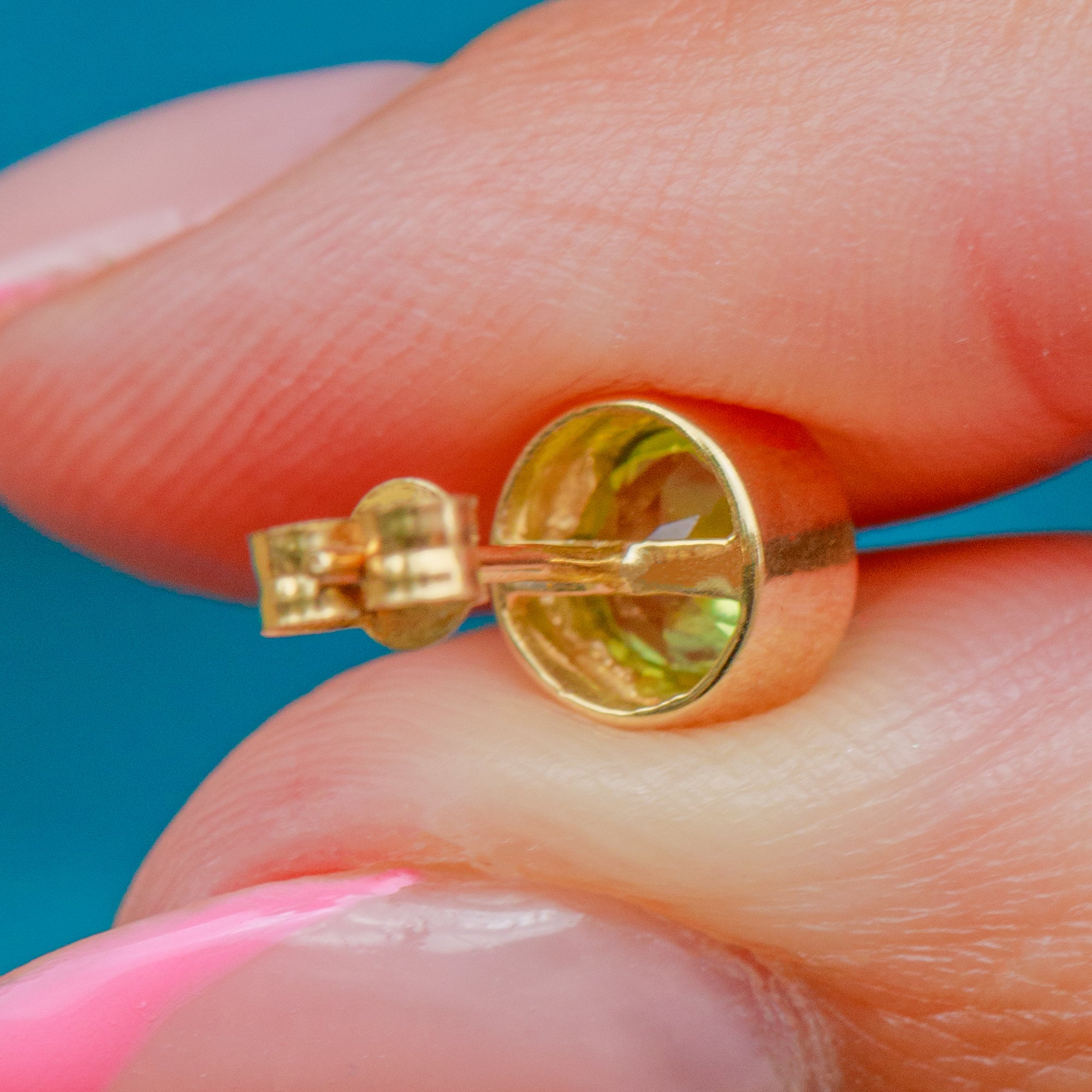 EXCELLENT: These 9ct Gold Peridot bezel-set stud earrings are in excellent condition! The Peridots are simply delightful and free from any chips or abrasions. The Gold is saturated throughout and the bezels hold each Peridot securely in place, with only very mild wear to their surface. With secure butterfly backs, these versatile vintage Peridot earrings are set to become your new grab-and-go pair!