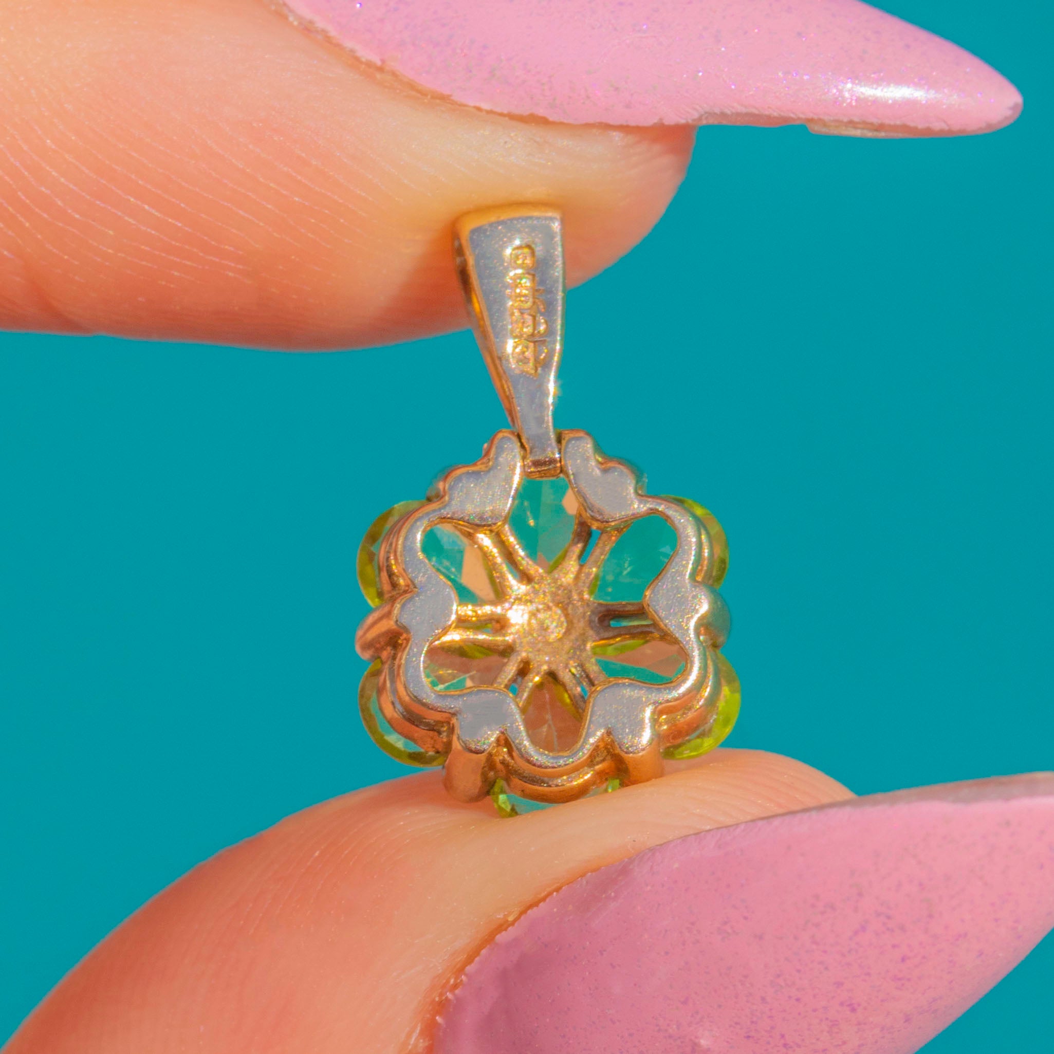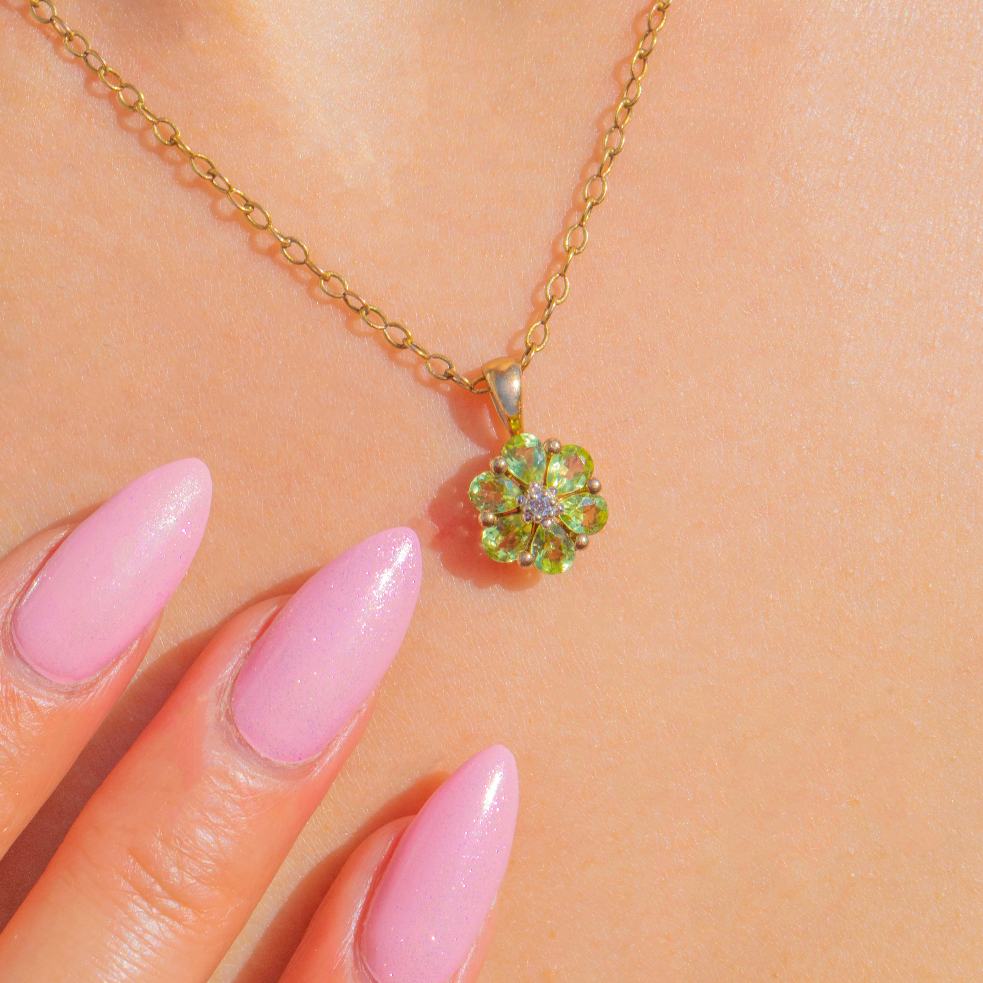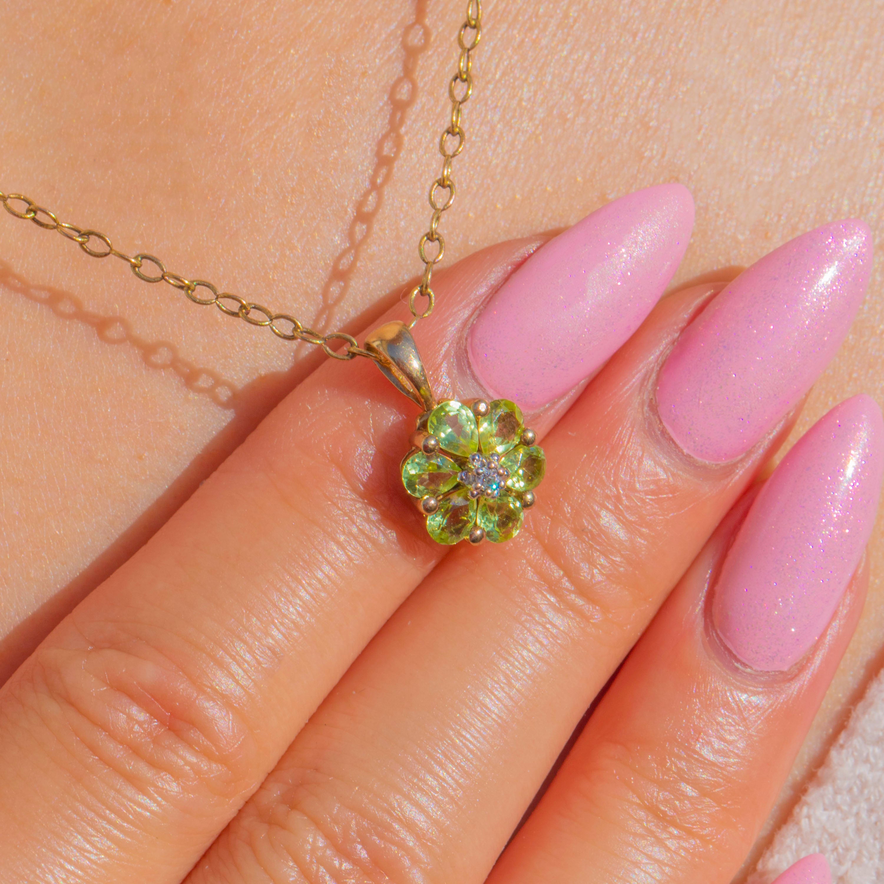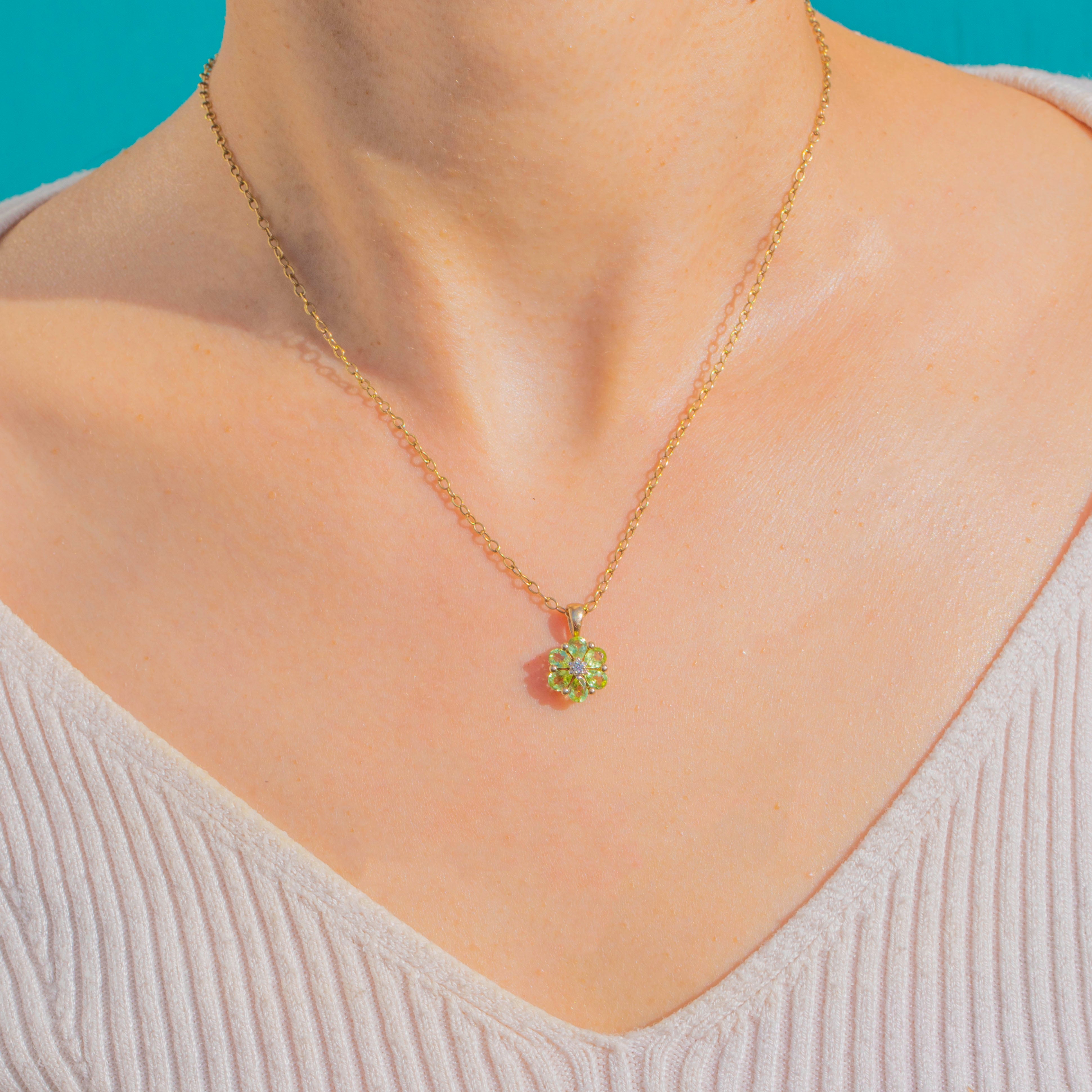 A petite bloom of fresh green and sparkling white, this 9ct Gold cluster pendant pairs six vivid Peridots with a bright Diamond centre. Each gemstone is secured in delicate claw settings, creating a floral silhouette that sits daintily at the throat and catches the light beautifully.