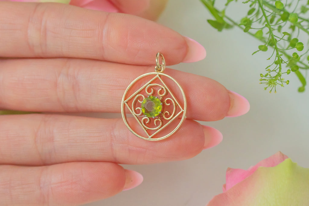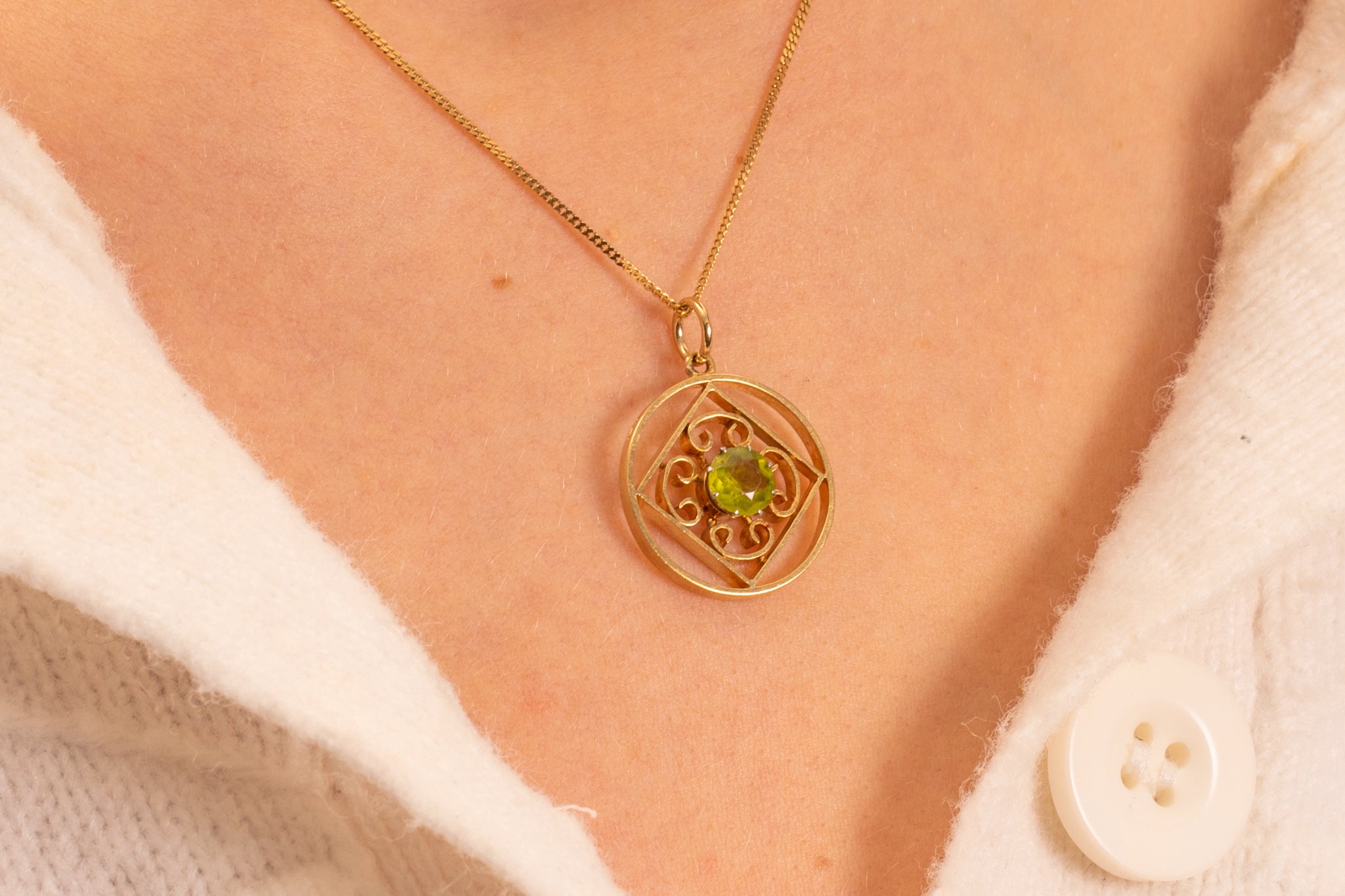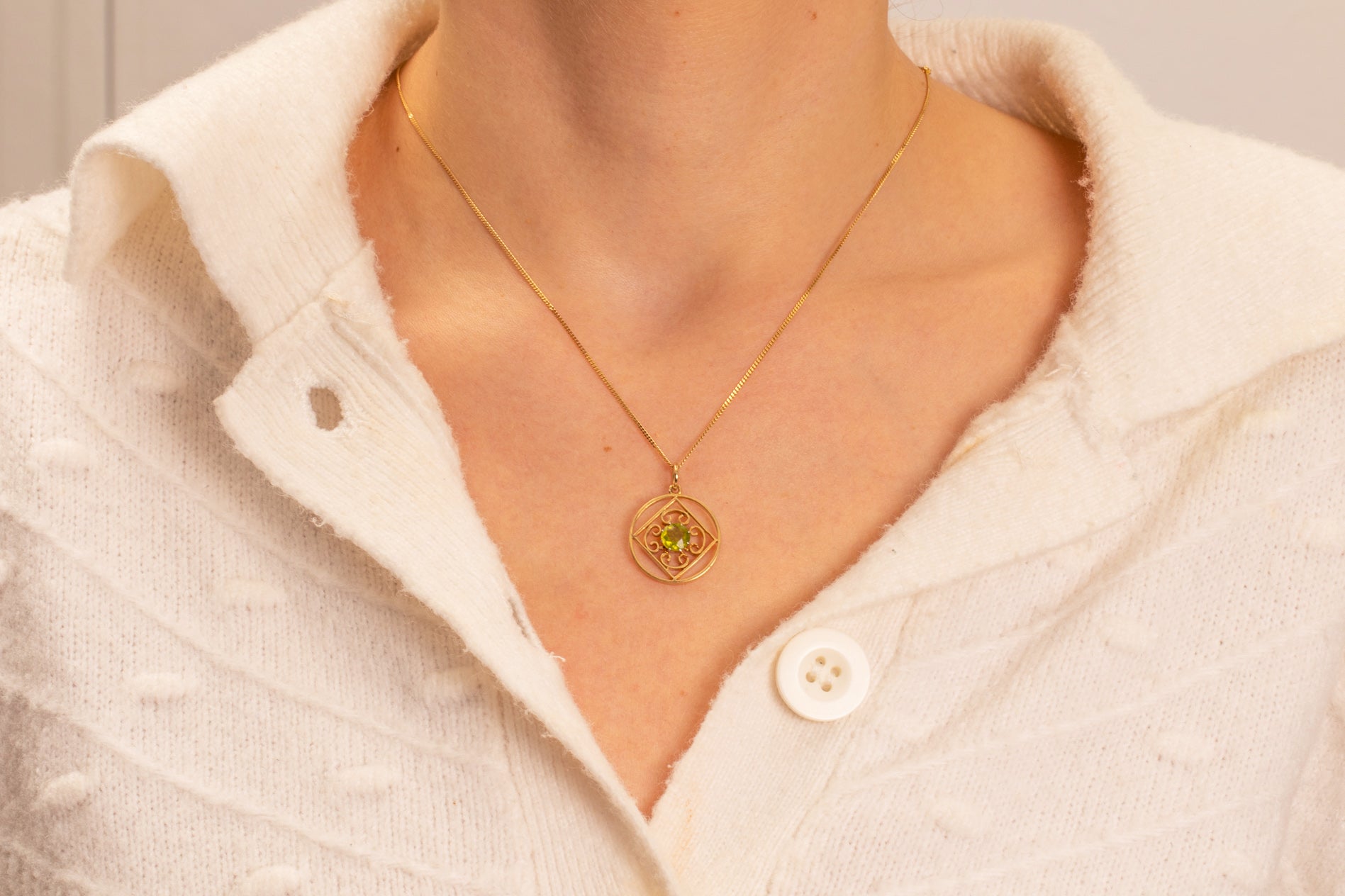 We adore this 9ct Gold Peridot pendant! This sweet piece is crafted from solid Gold and is inlaid with a zesty Peridot that twinkles beautifully as this vintage pendant catches the light.