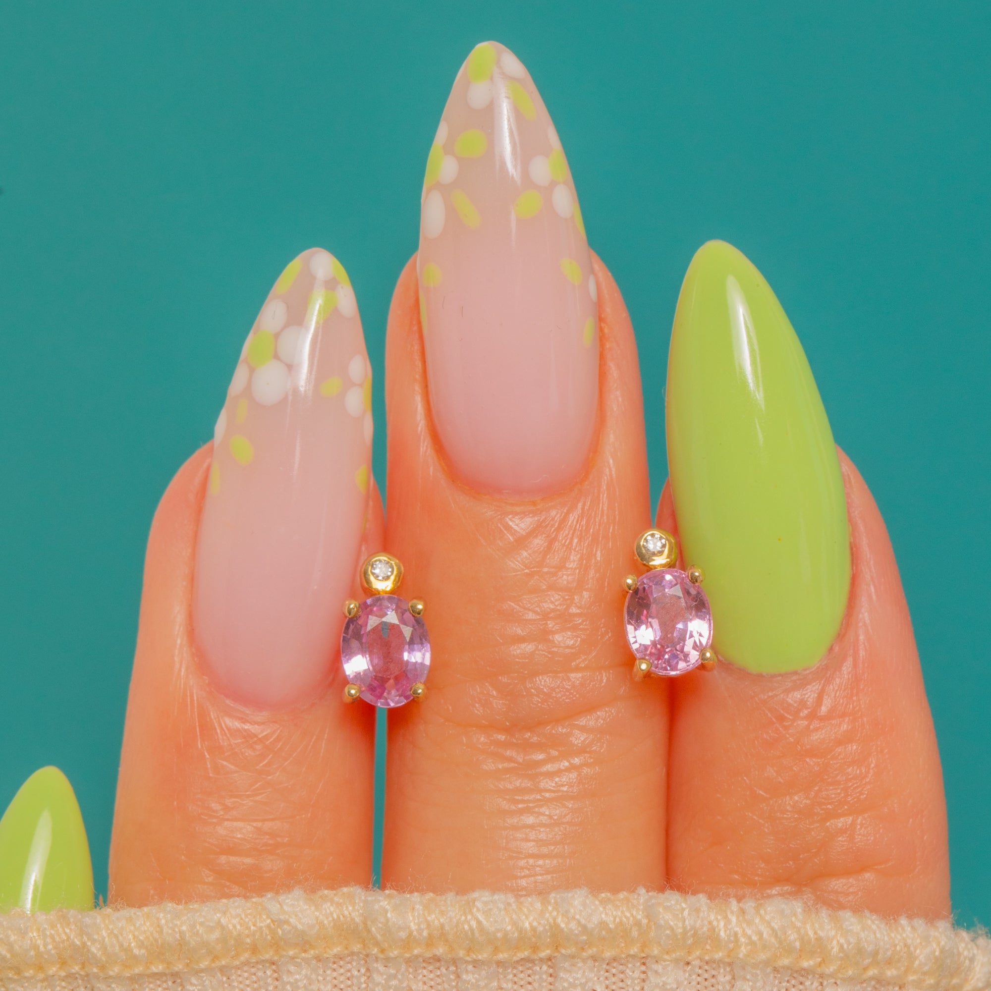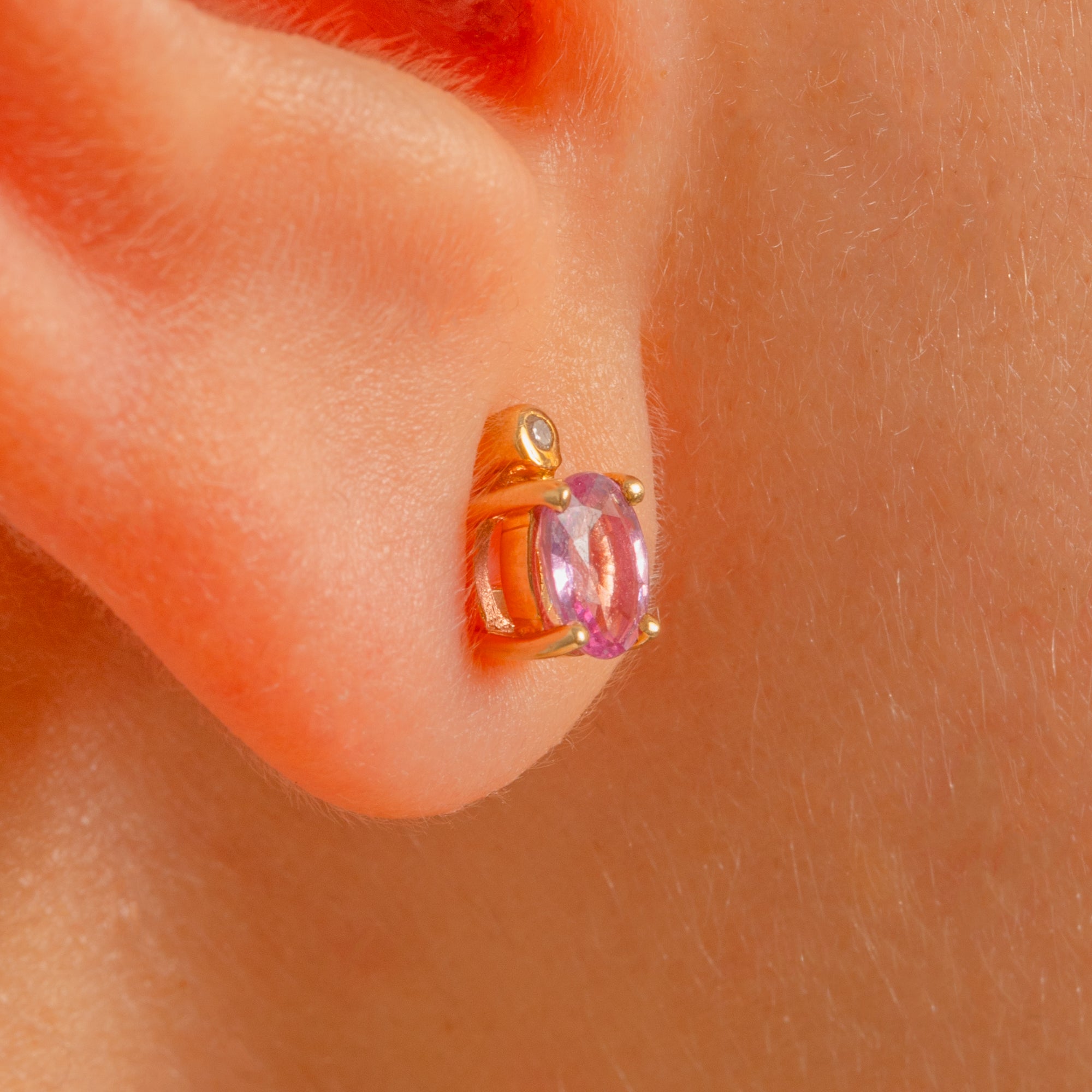 Pretty as a petal and effortlessly refined, these Vintage 9ct Gold stud earrings showcase oval Pink Topaz crowned with a dainty Diamond. The blush-pink stones sparkle with lively facets, set in neat four-claw mounts, while the petite bezel-set Diamonds add a crisp glint above.