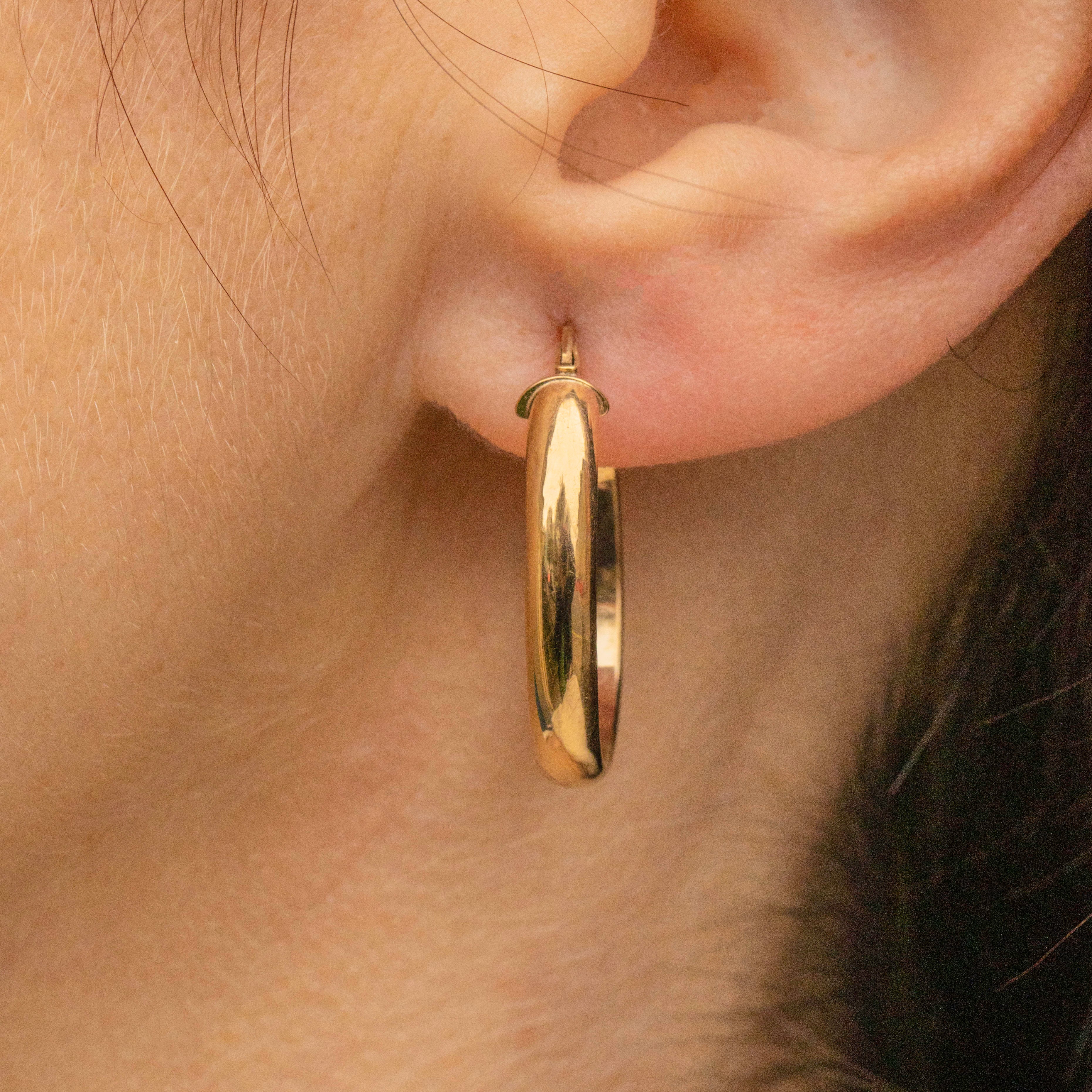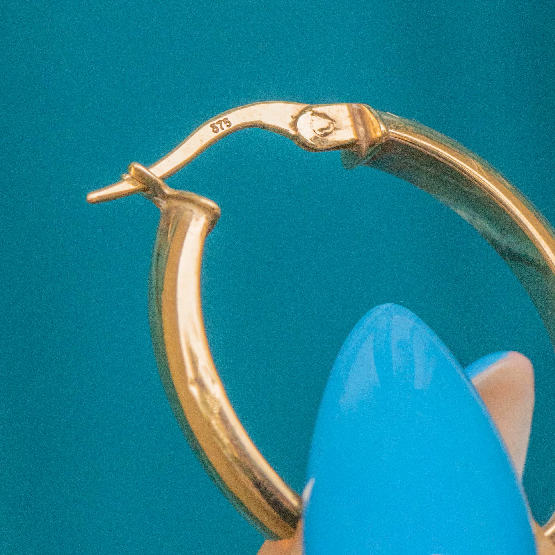 EXCELLENT: This cute pair of 9ct Gold plain oval hoop earrings are in excellent condition! Their design has kept incredibly well, and there are no dings or damage to the Gold. They're ready to be adored for years to come.