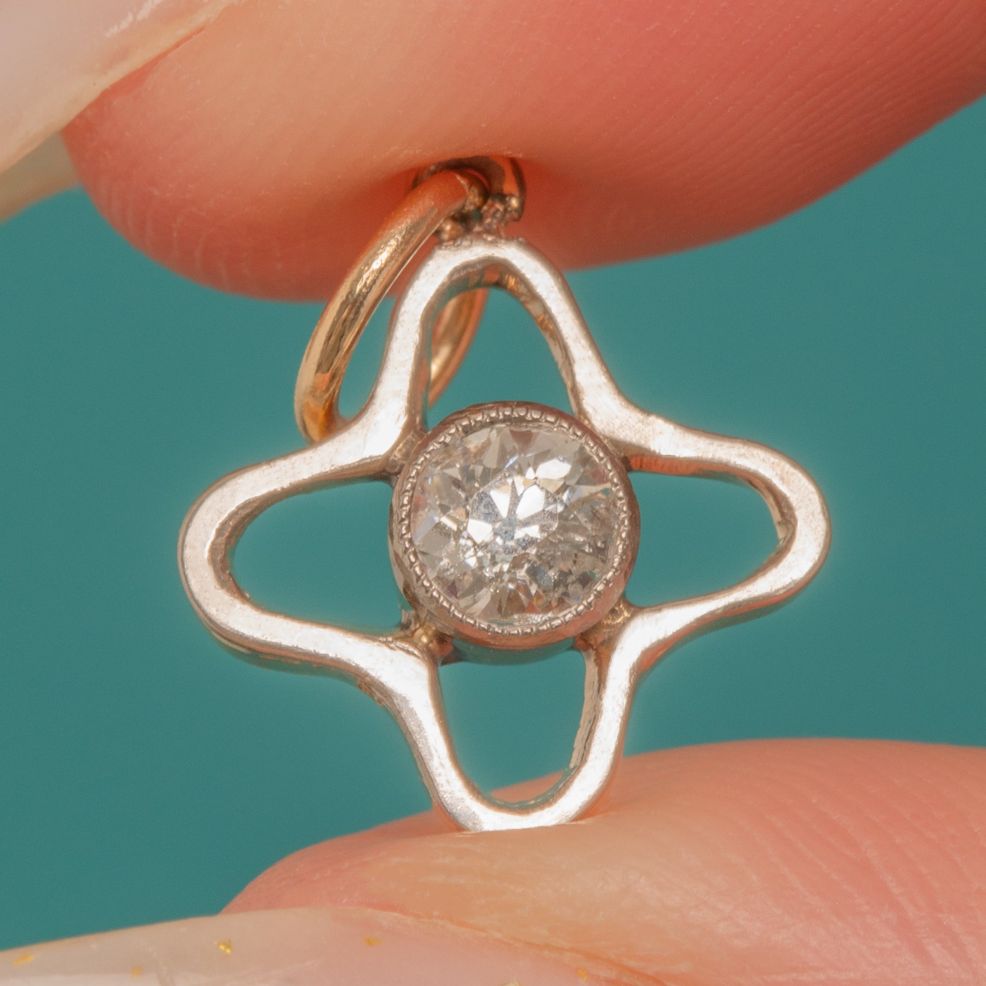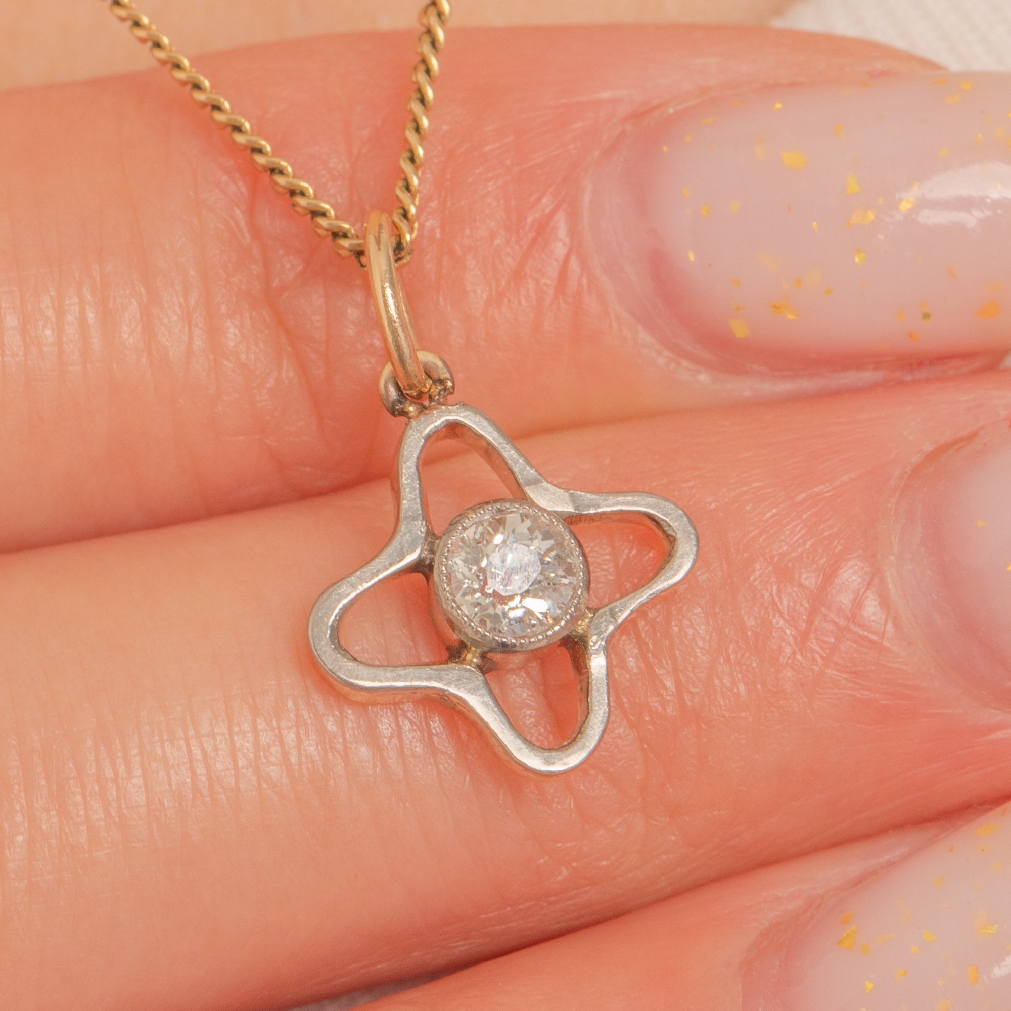 A petite celestial treasure from the Victorian era, this Star charm is crafted in 9ct Gold and Platinum and centred by a sparkling 0.25ct Old Mine Cut Diamond. The Diamond’s charming antique facet pattern dances with light, lending that signature old-world fire in a dainty, easy-to-wear silhouette.
