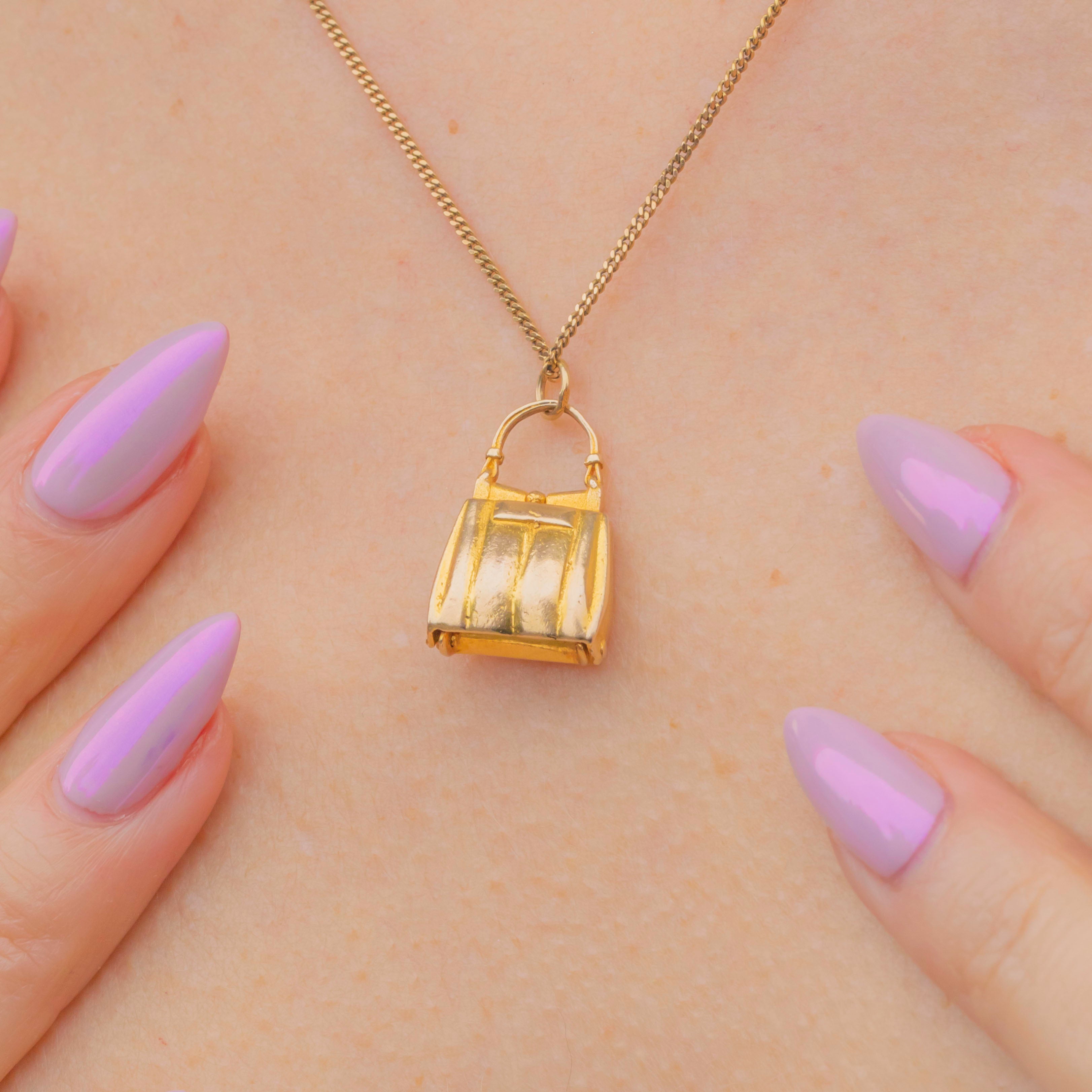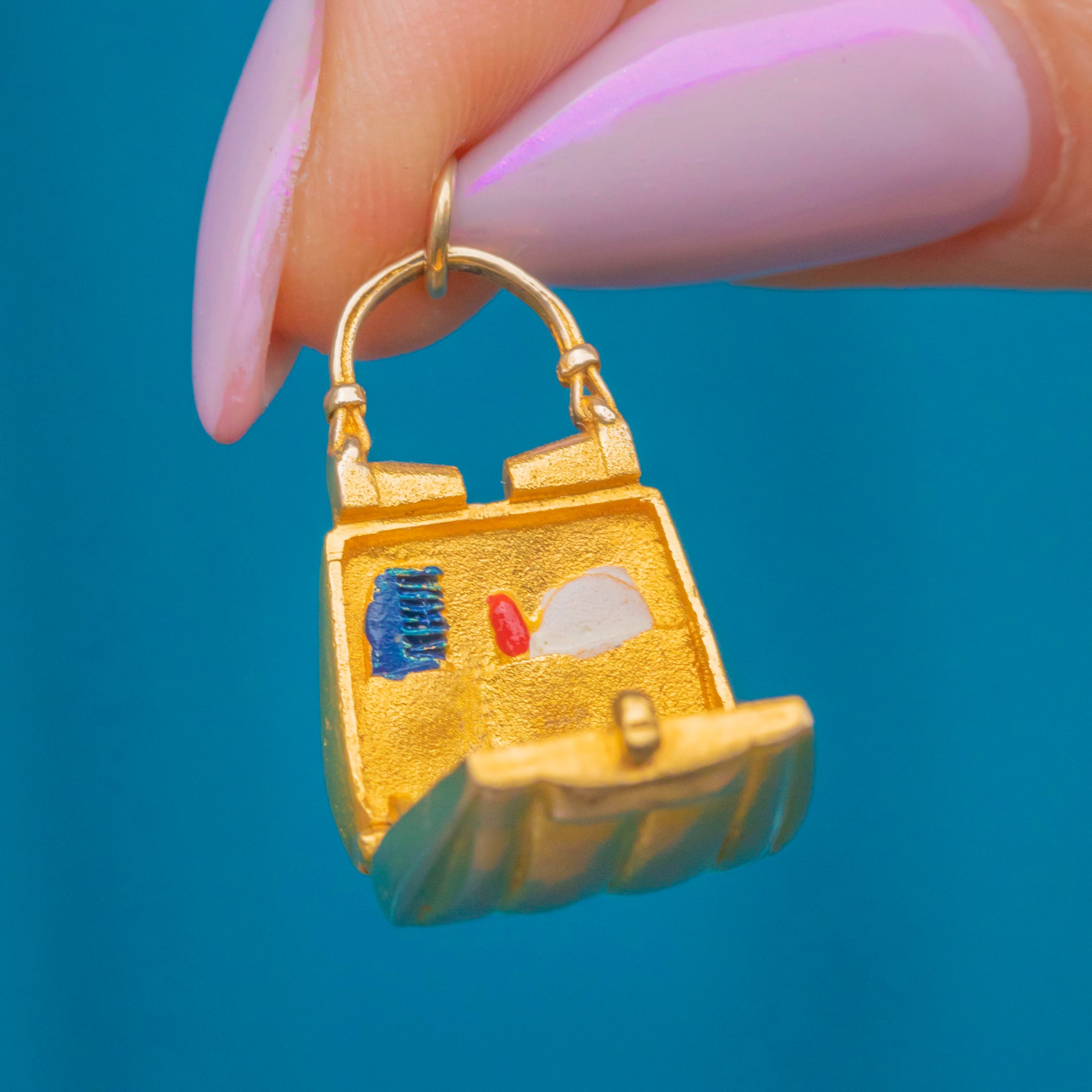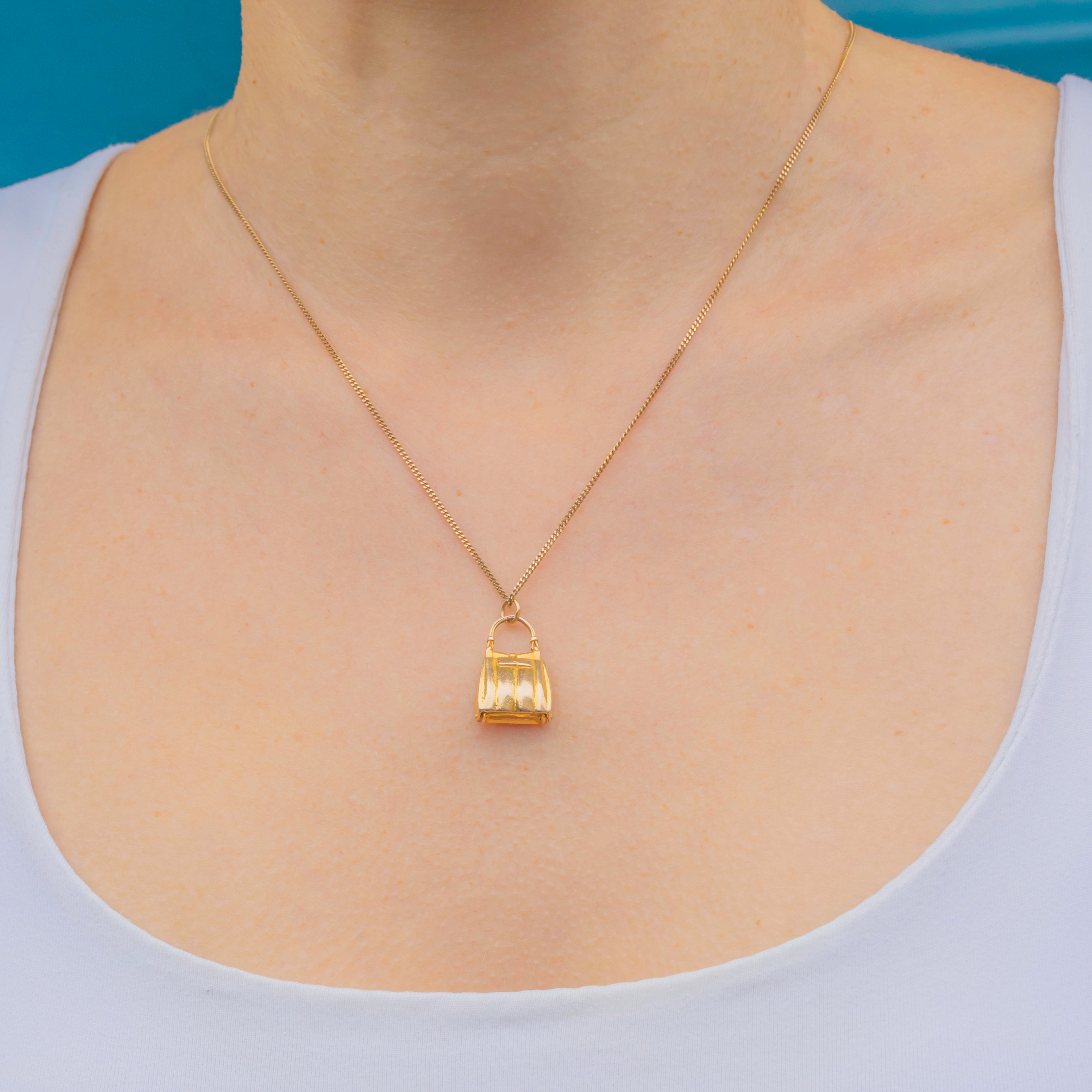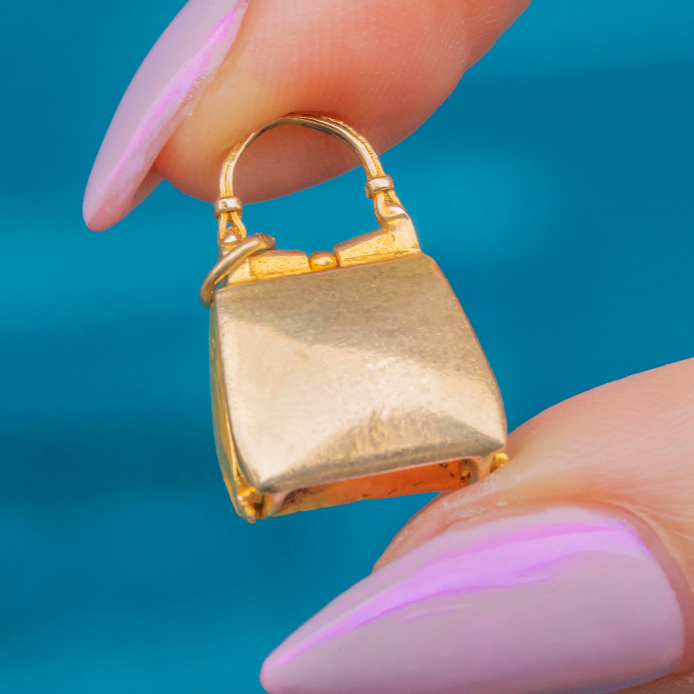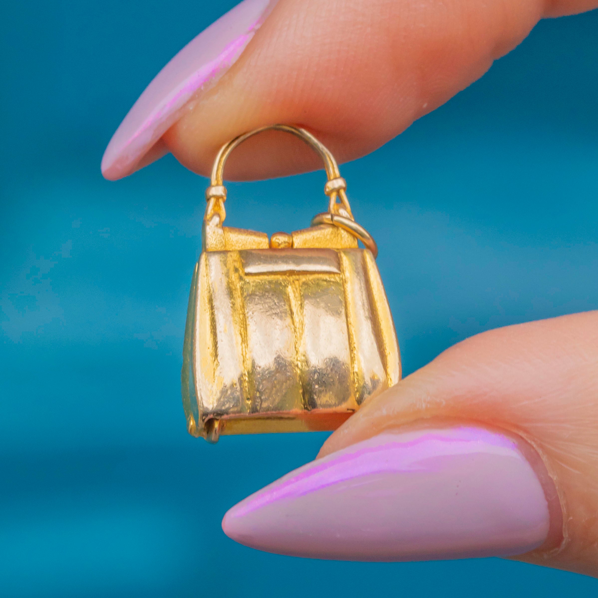 This delightful Mid-century charm is crafted in solid 9ct Gold in the shape of a miniature handbag or purse! How sweet! Beautifully detailed with a gently rounded form and engraved accents, it opens and closes with a tiny hinged clasp, a charming touch of craftsmanship and whimsy.