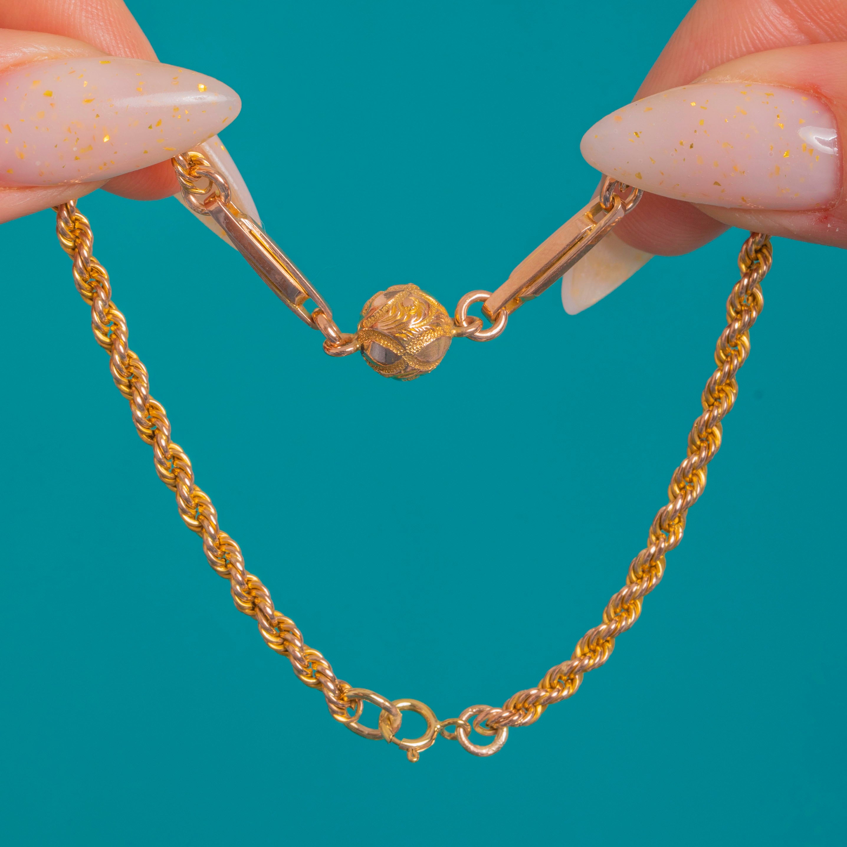 Elegant and refined, this Victorian 9ct Gold bracelet marries a fine rope chain with sleek fetter-style bar links, united by a petite openwork orb enriched with engraved foliate details. The asymmetric pairing of textures creates a beautiful play of light, while the central sphere lends a subtle Etruscan Revival flourish.