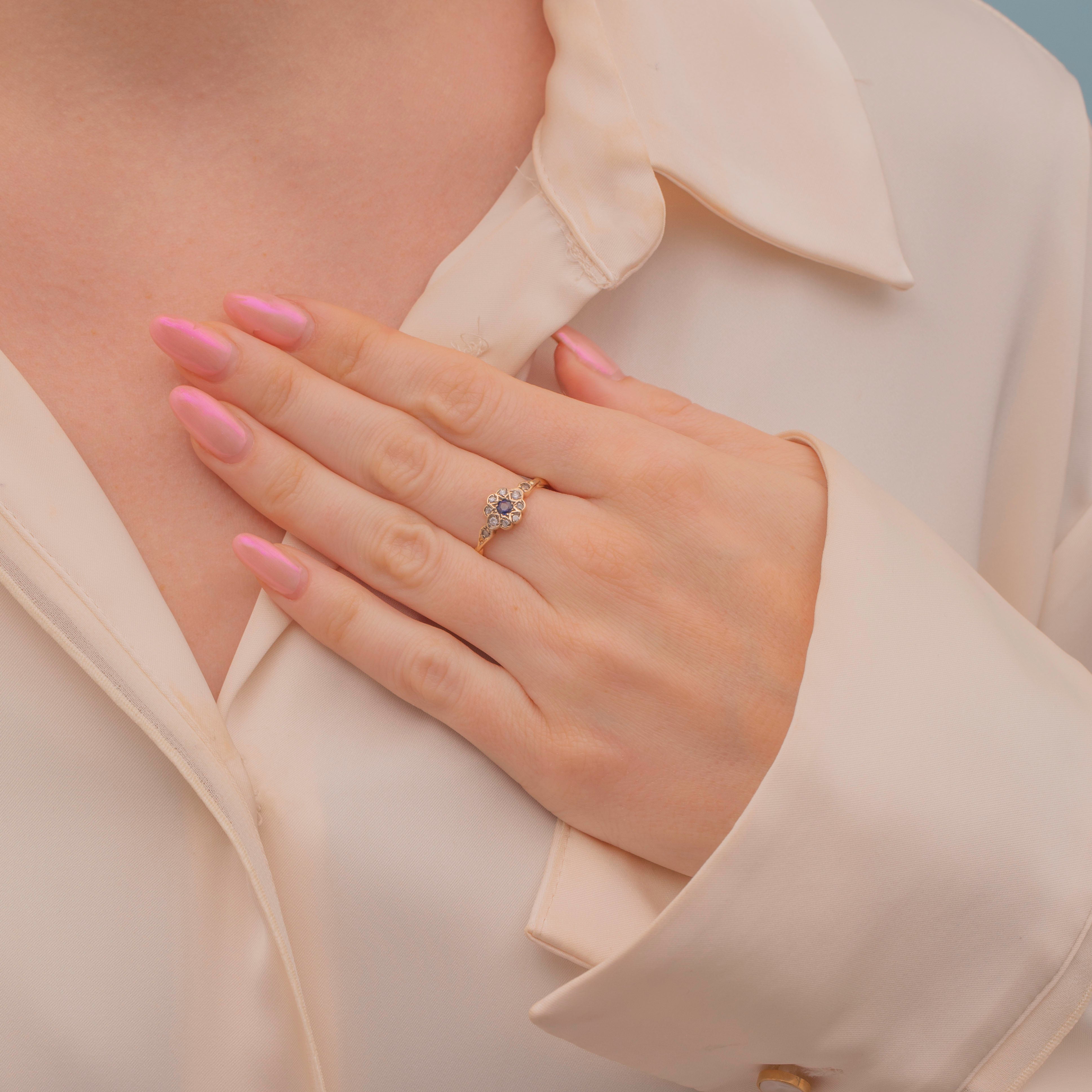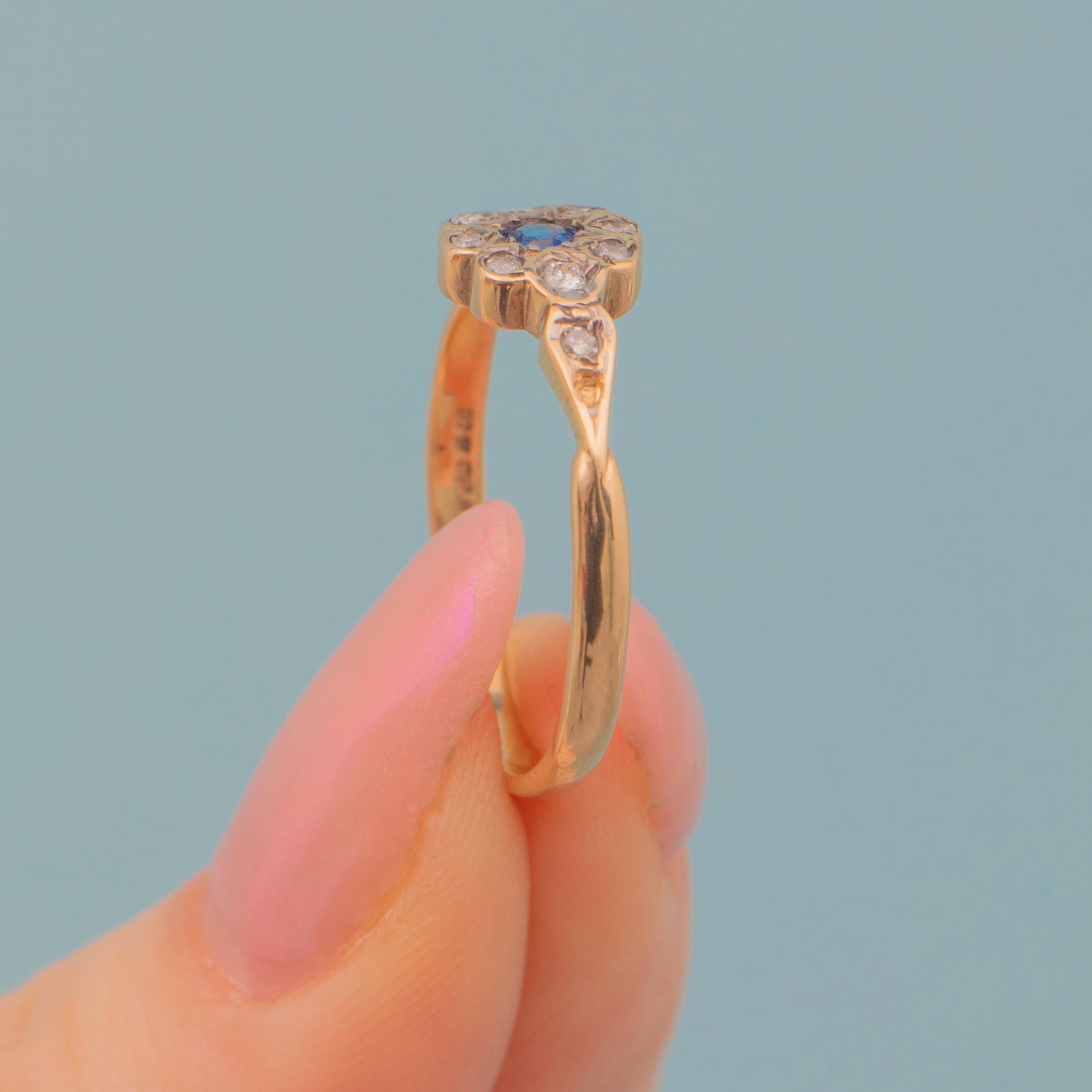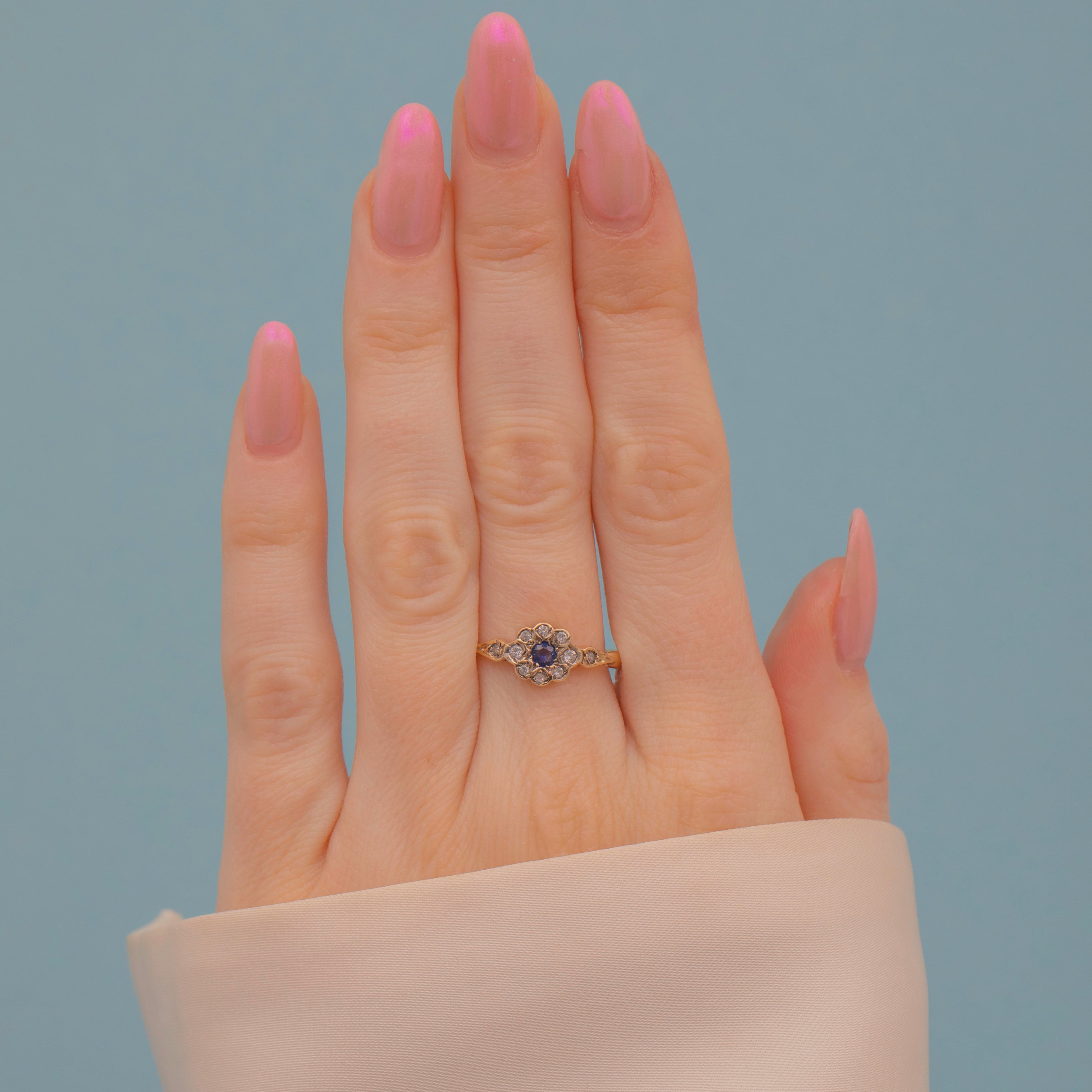 This 9ct Gold Sapphire Diamond daisy cluster ring is a dainty delight and steeped in romantic sentiment, with daisies symbolising love and new beginnings.