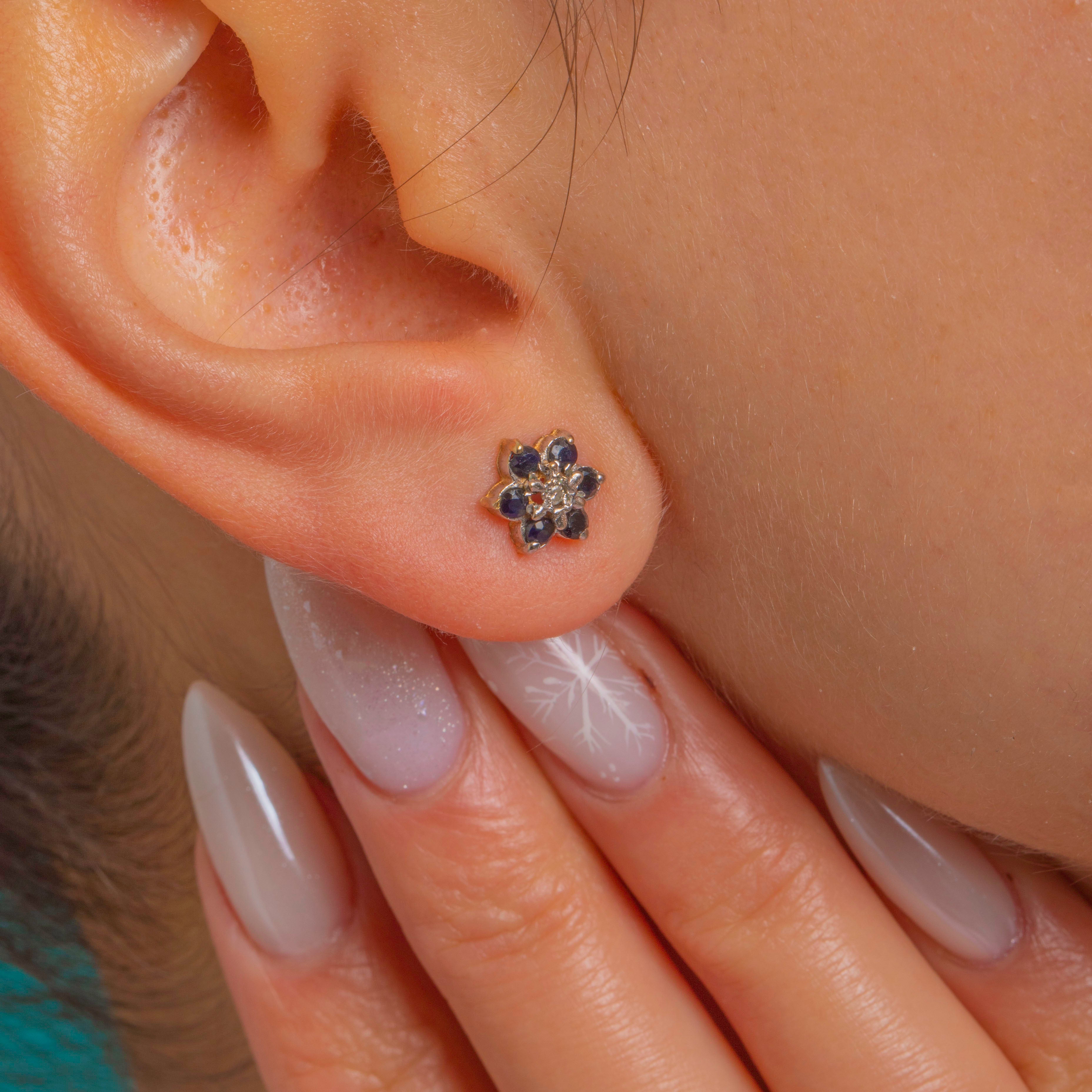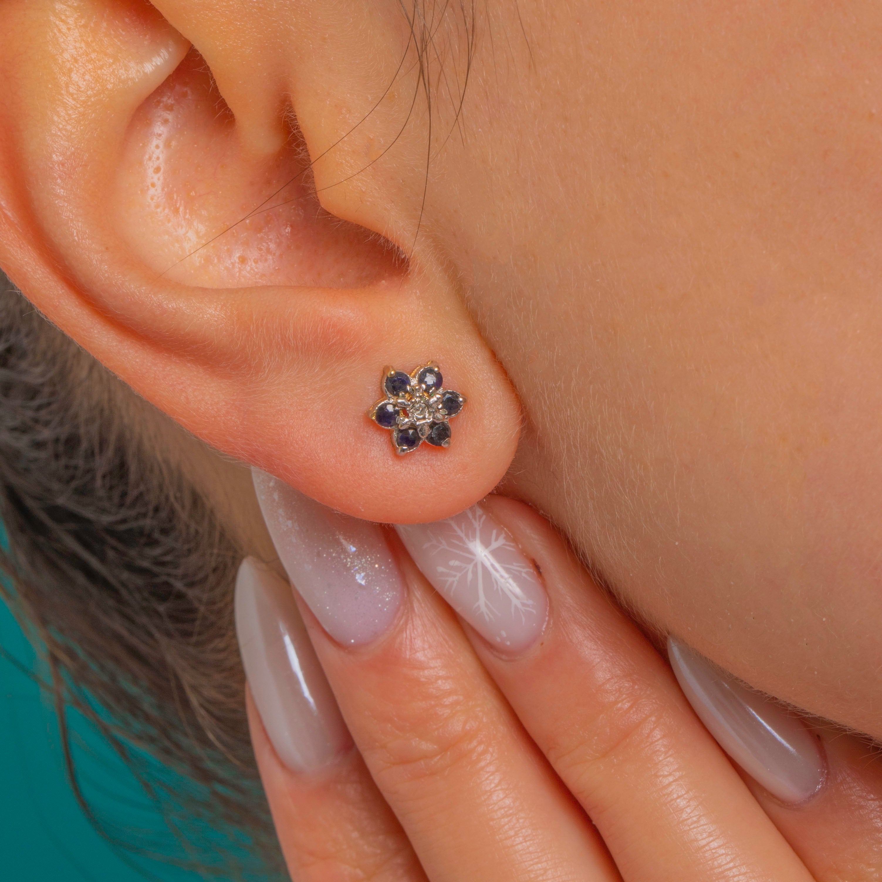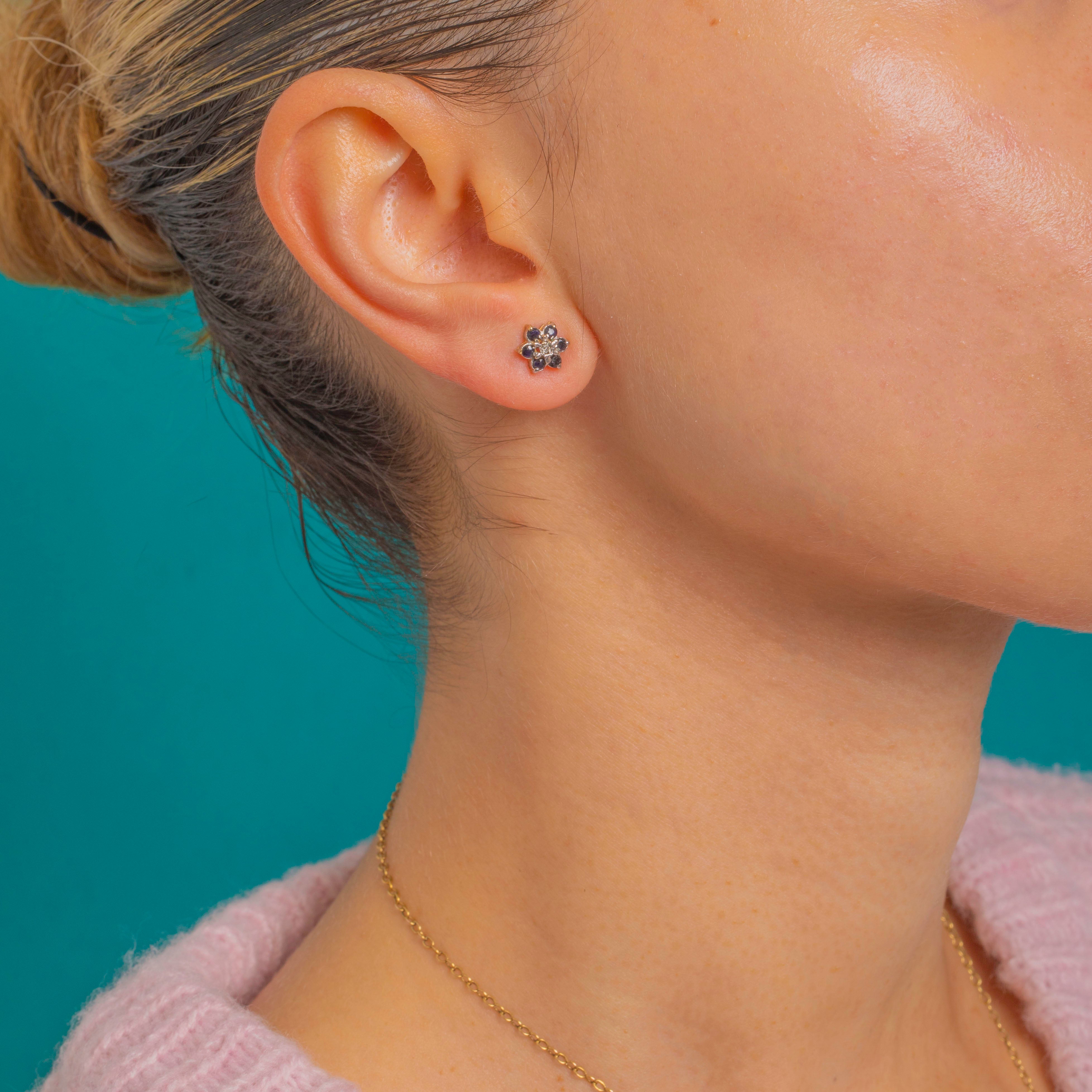 Dainty and deliciously chic, these Vintage floral cluster studs are set with deep blue Sapphires encircling a glinting Diamond at the heart. Their refined rosette silhouette and neat proportions make them an effortless everyday luxury—pretty, classic, and beautifully wearable.