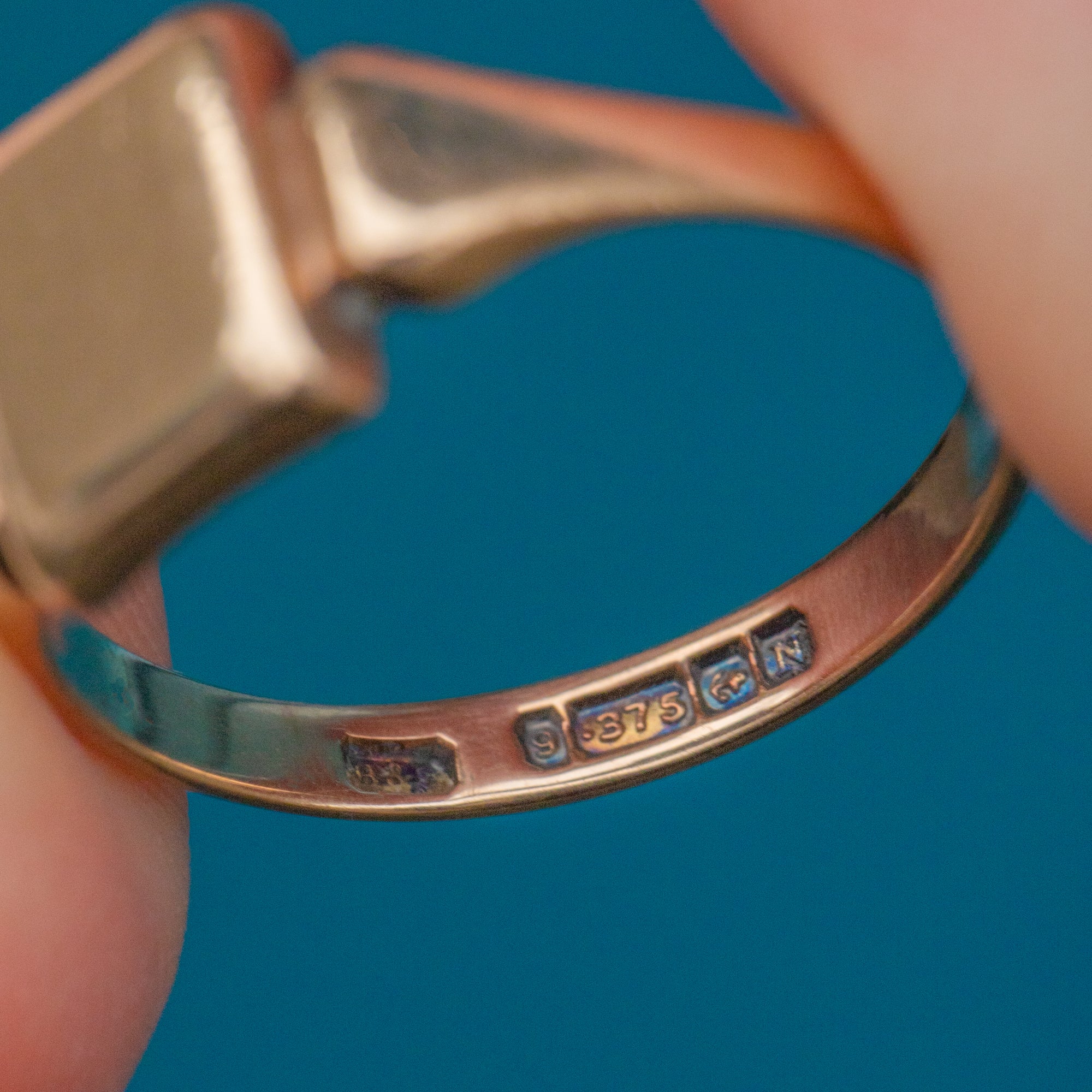 GOOD TO VERY GOOD. This Art Deco 9ct Gold square signet ring is in very good condition overall. The signet face is smooth and there is slight remnant of an engraving on the shoulder on one side. The ring has been resized at one point in time, but this is subtle and the ring wears comfortably on the finger.