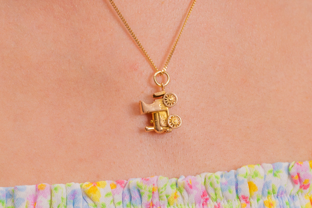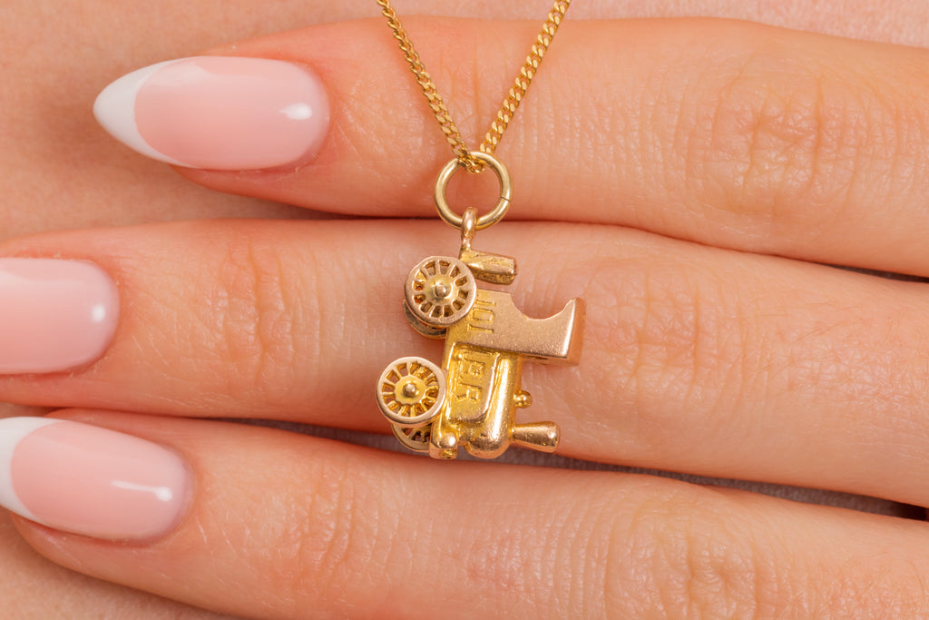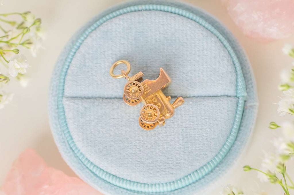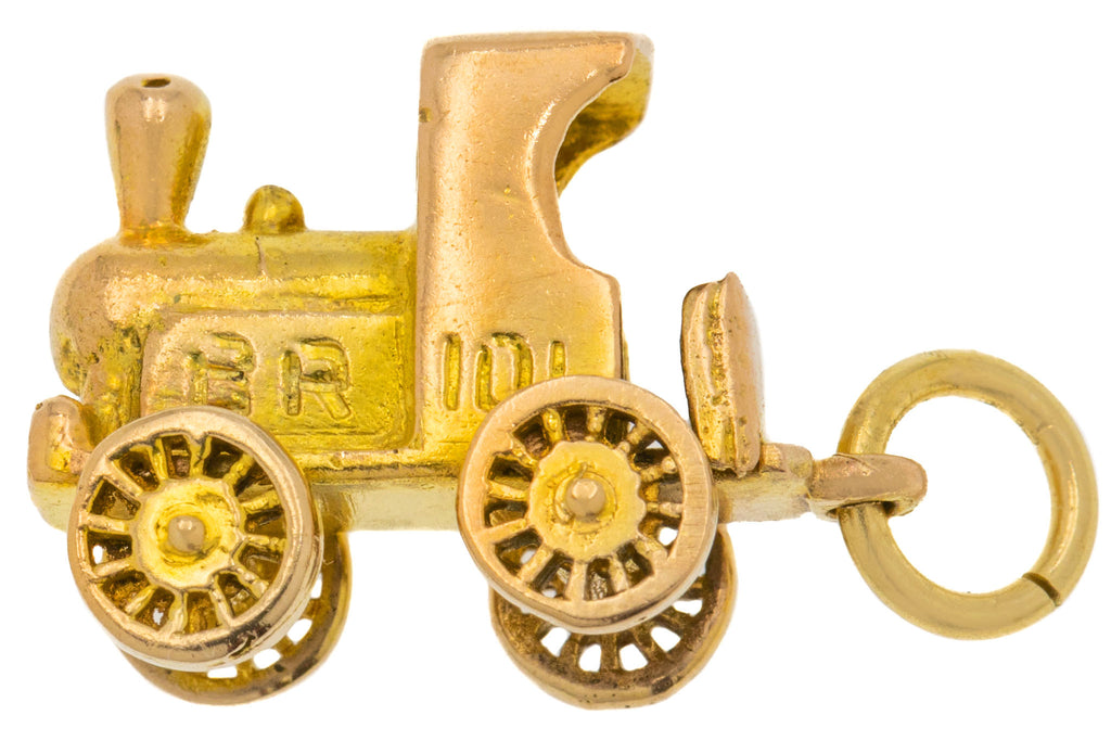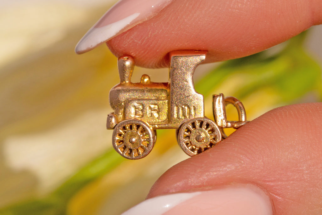 EXCELLENT: This 9ct Gold steam train charm is in superb vintage condition. The 9ct Gold is bright, the engravings and hallmarks remain crisp. The train has great height, and although dainty will still make an impact when suspend from a chain. An articulated charm, the wheels do move, but may need some gentle encouragement as they don't freely spin! Every jewellery box yearns for vintage charms, and this pendant is a fine example.