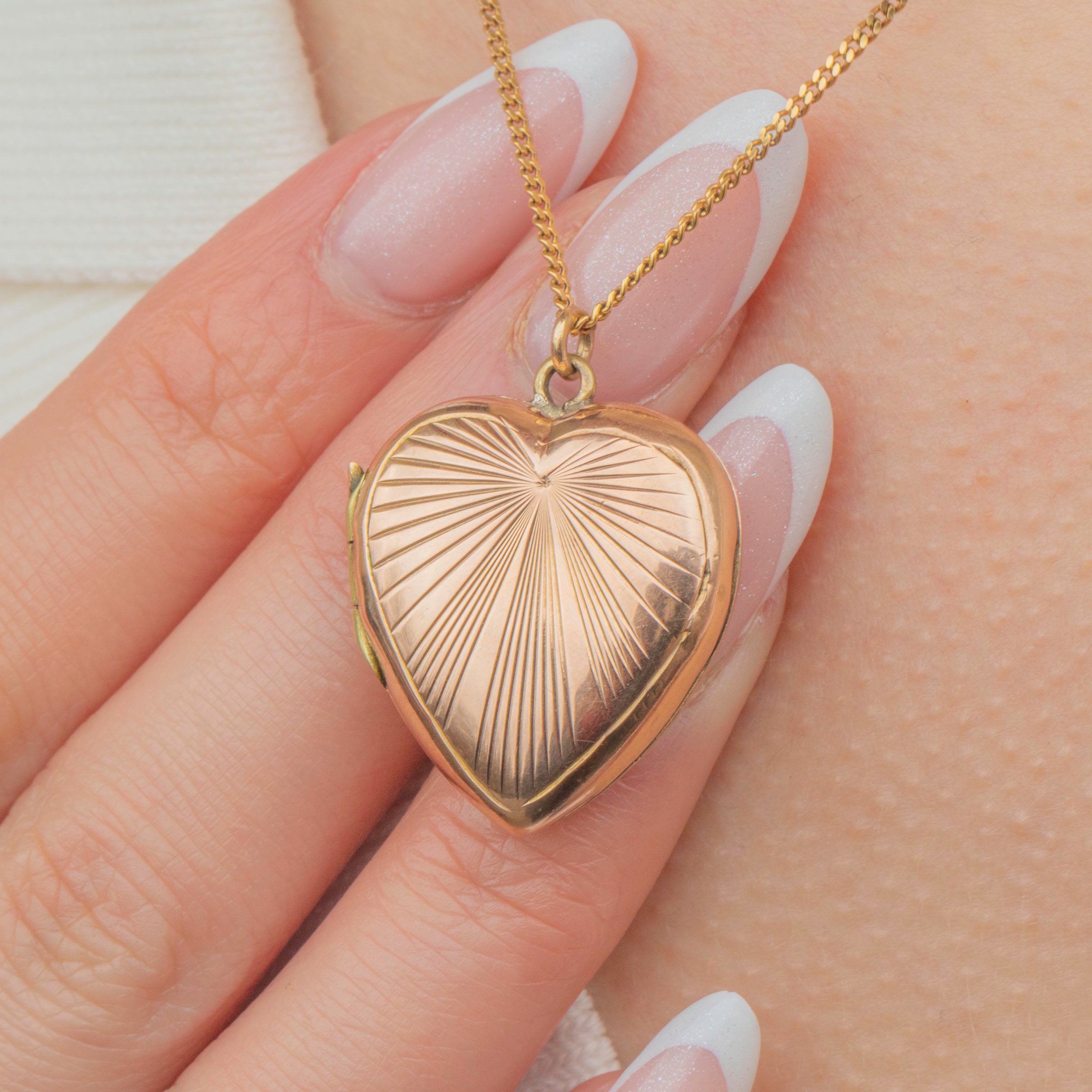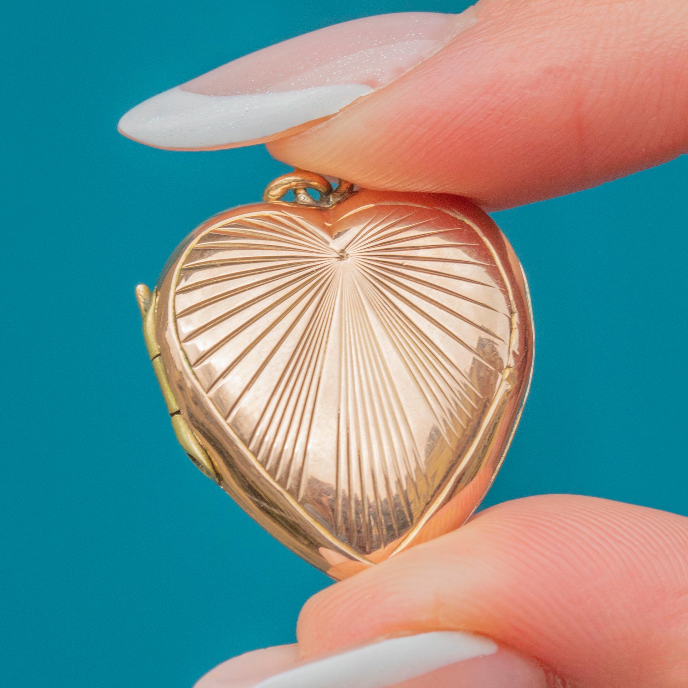 VERY GOOD: This 9ct Gold sunburst heart locket is in very good condition! The locket has both frames present so your photos will remain safe. The sunburst design is in fabulous condition, crisp and vibrant, and the Gold hue is simply divine. The locket opens from the bottom and closes tightly, guaranteed to provide you with decades of happiness!