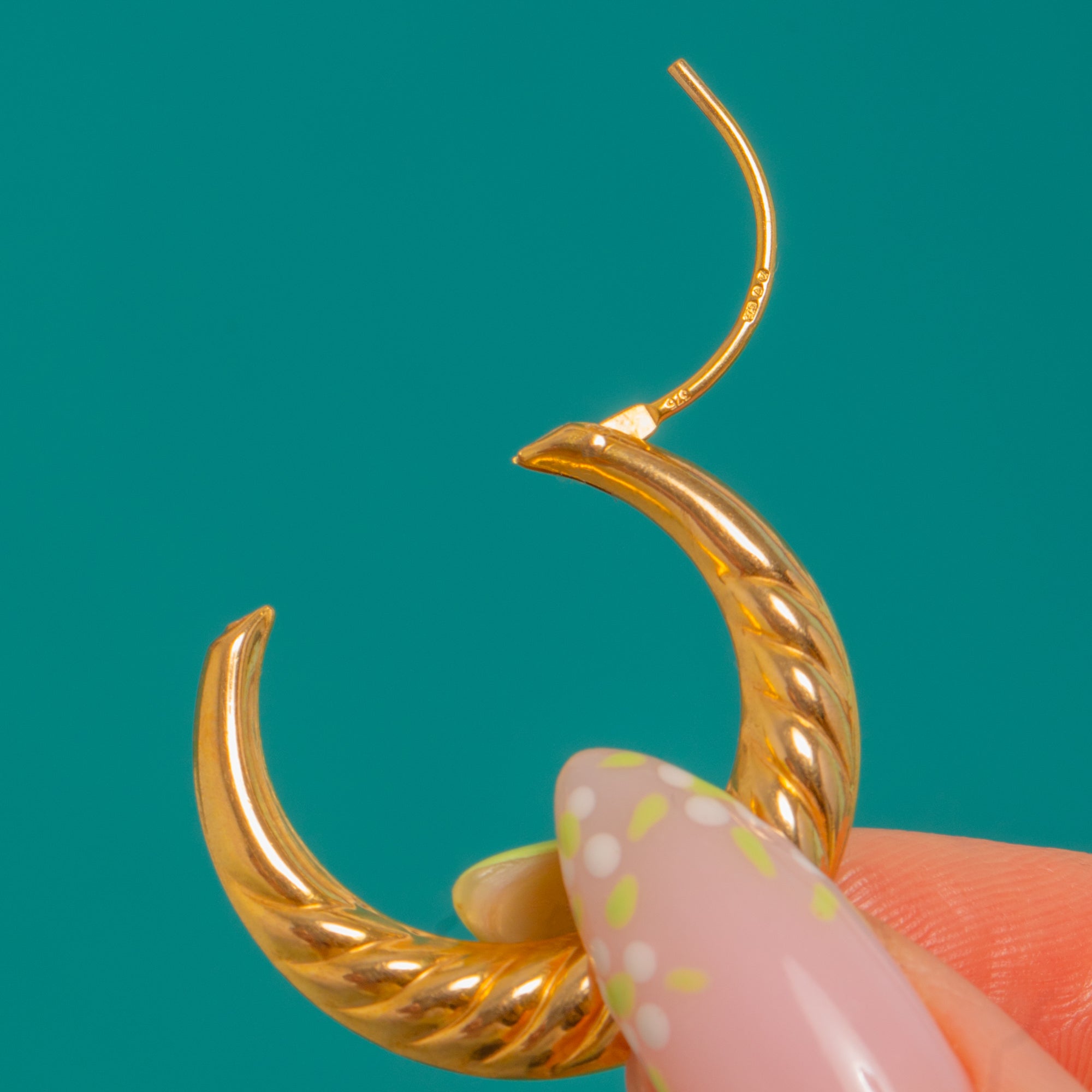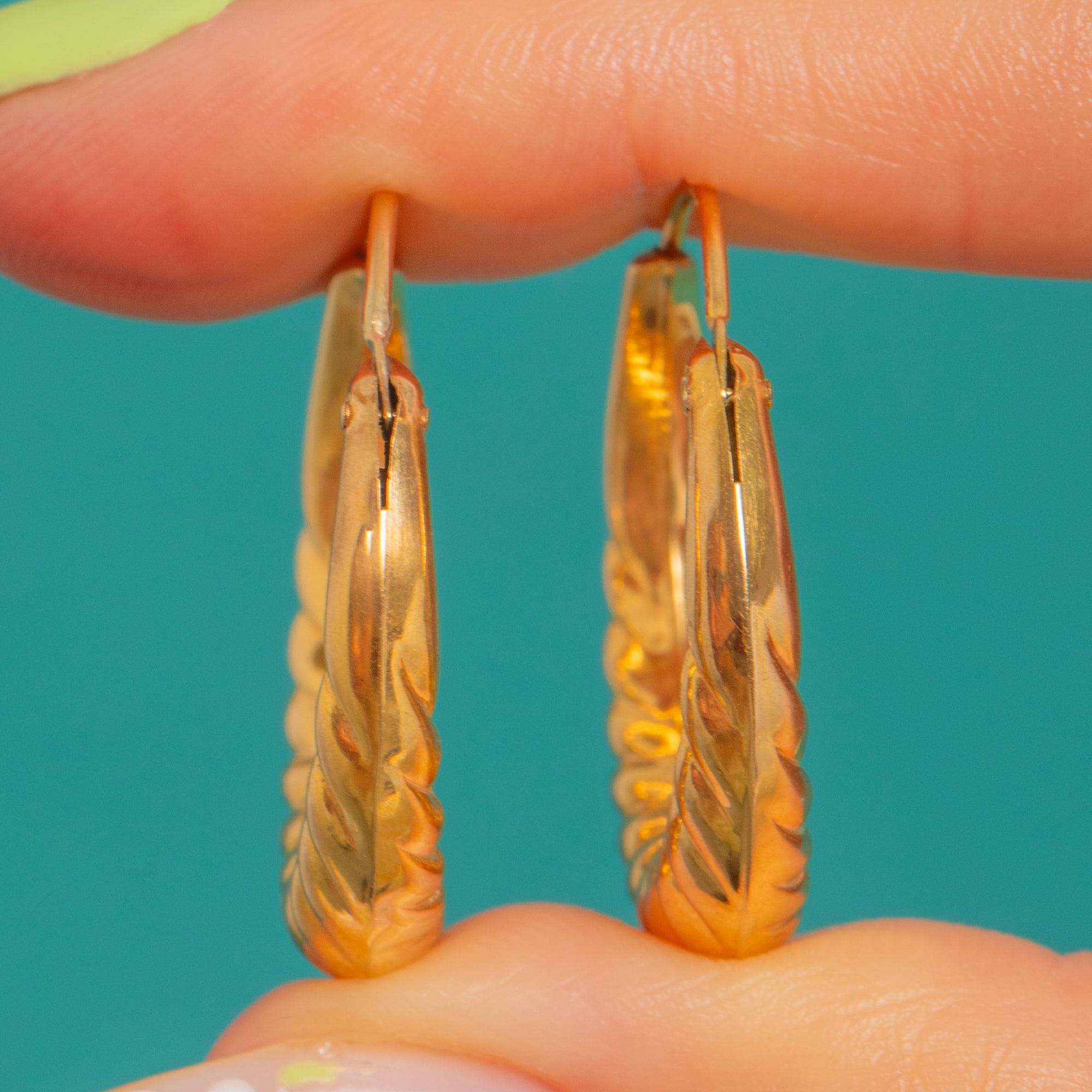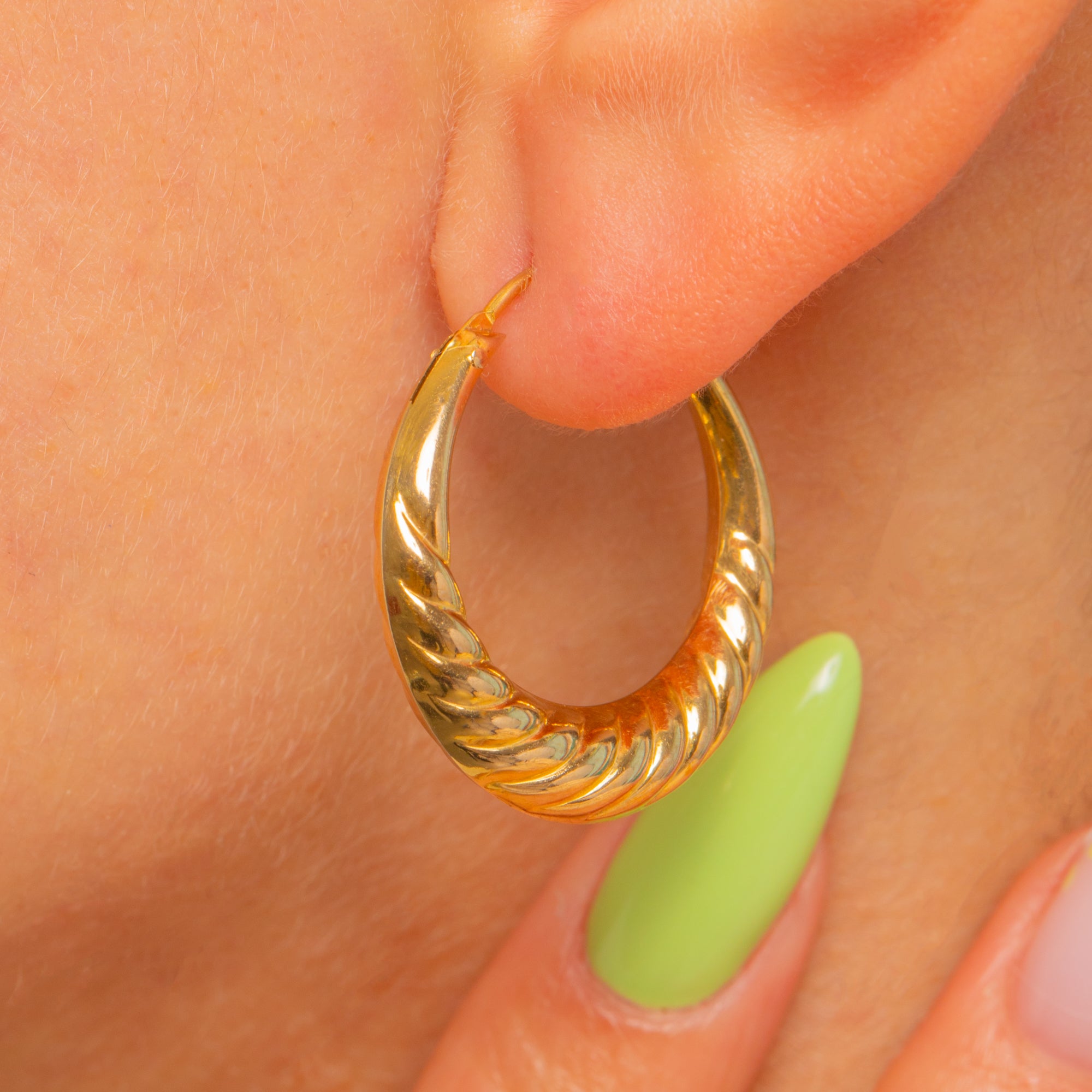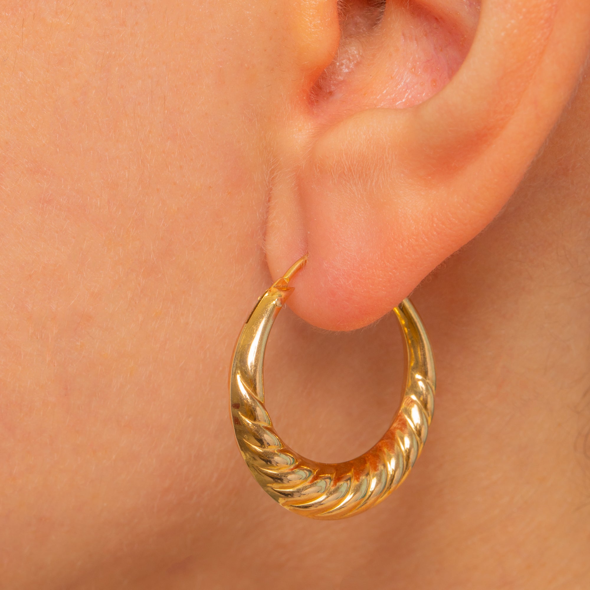 Classic and beautifully tactile, these Vintage 9ct Gold hoop earrings are adorned with richly detailed textures that catch the light from every angle. Diagonal fluting ripples across the high-polish surface, giving these sculptural hoops a luxurious, vintage feel.