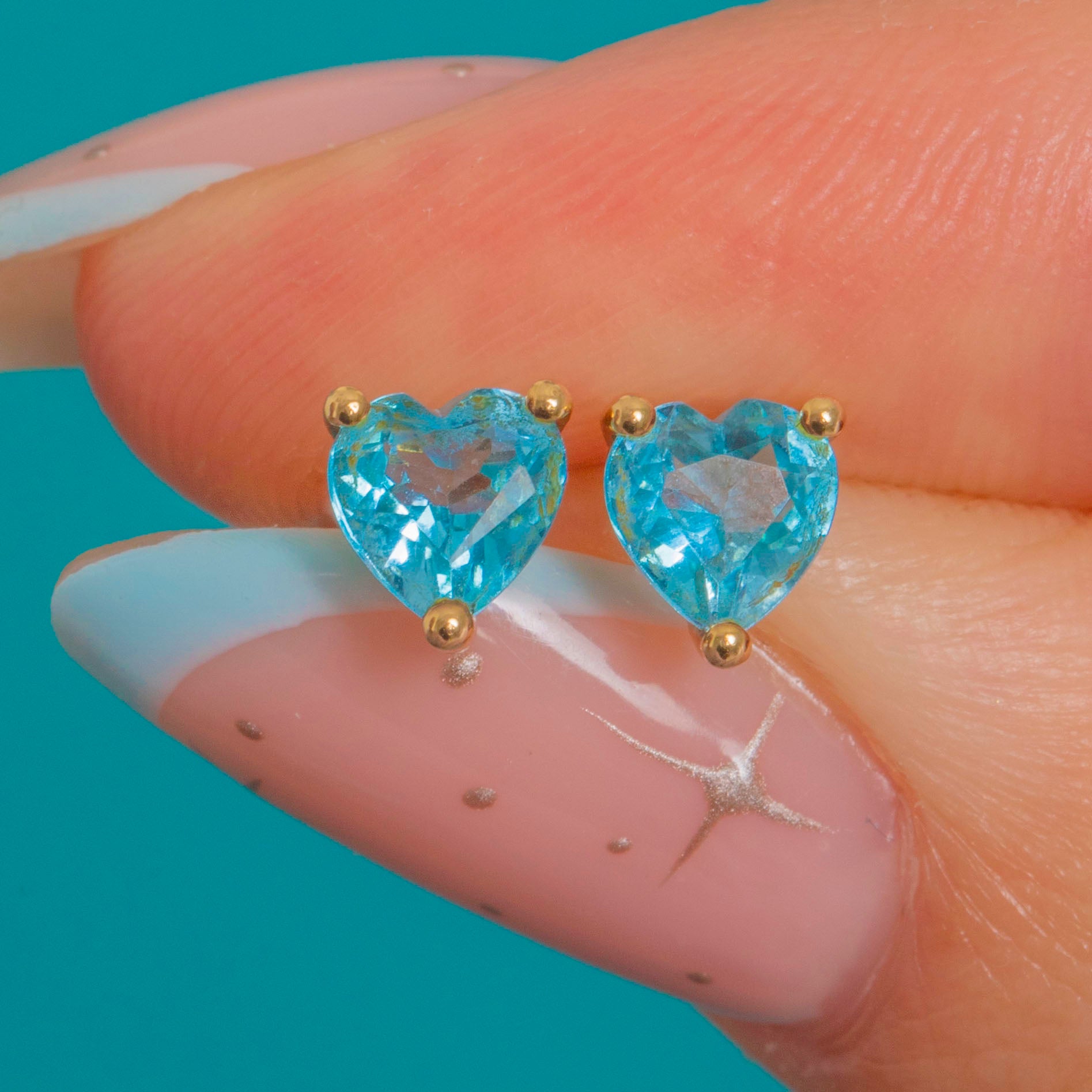 Sweet, simple and sparkling, these 9ct Gold heart stud earrings showcase luminous sky-blue Blue Topaz in a clean three-claw setting. The heart cuts catch the light beautifully, delivering that fresh, watery glow Blue Topaz is loved for while keeping the silhouette refined and romantic.