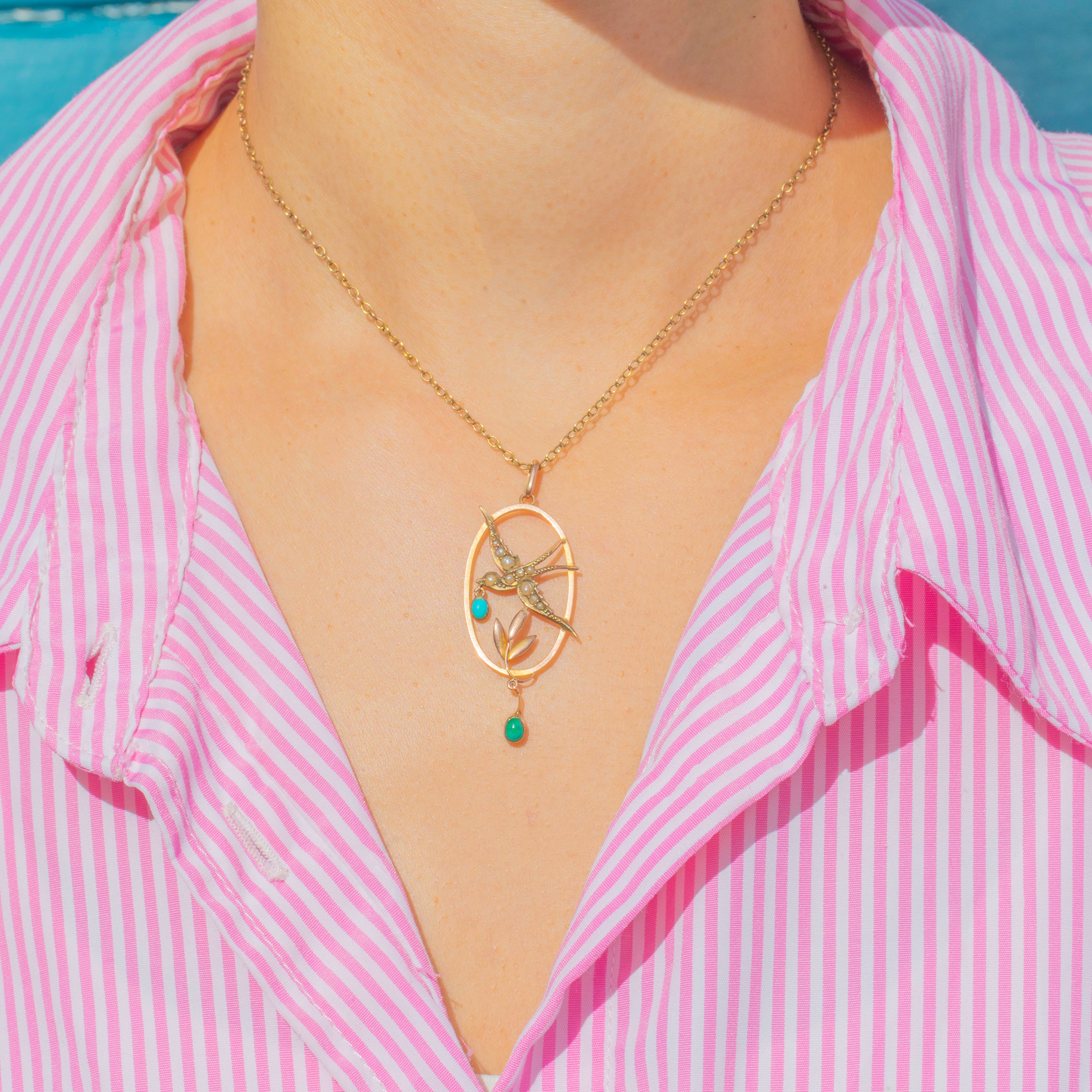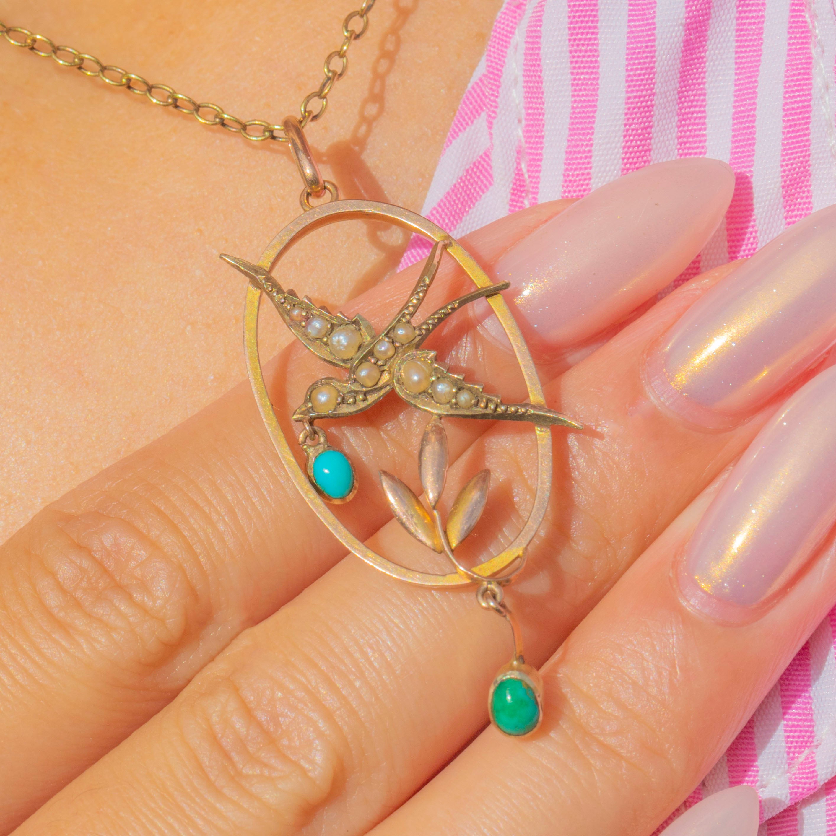 An enchanting Edwardian pendant, c.1900, crafted in 9ct Gold in the form of a charming Swallow bird. The design features delicate Pearls and a symbolic "Olive Branch" in Turquoise, one suspended from the bird's beak and another as a drop below.