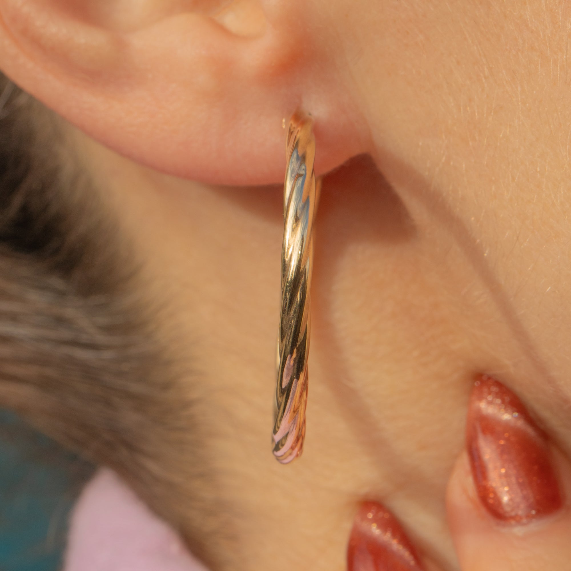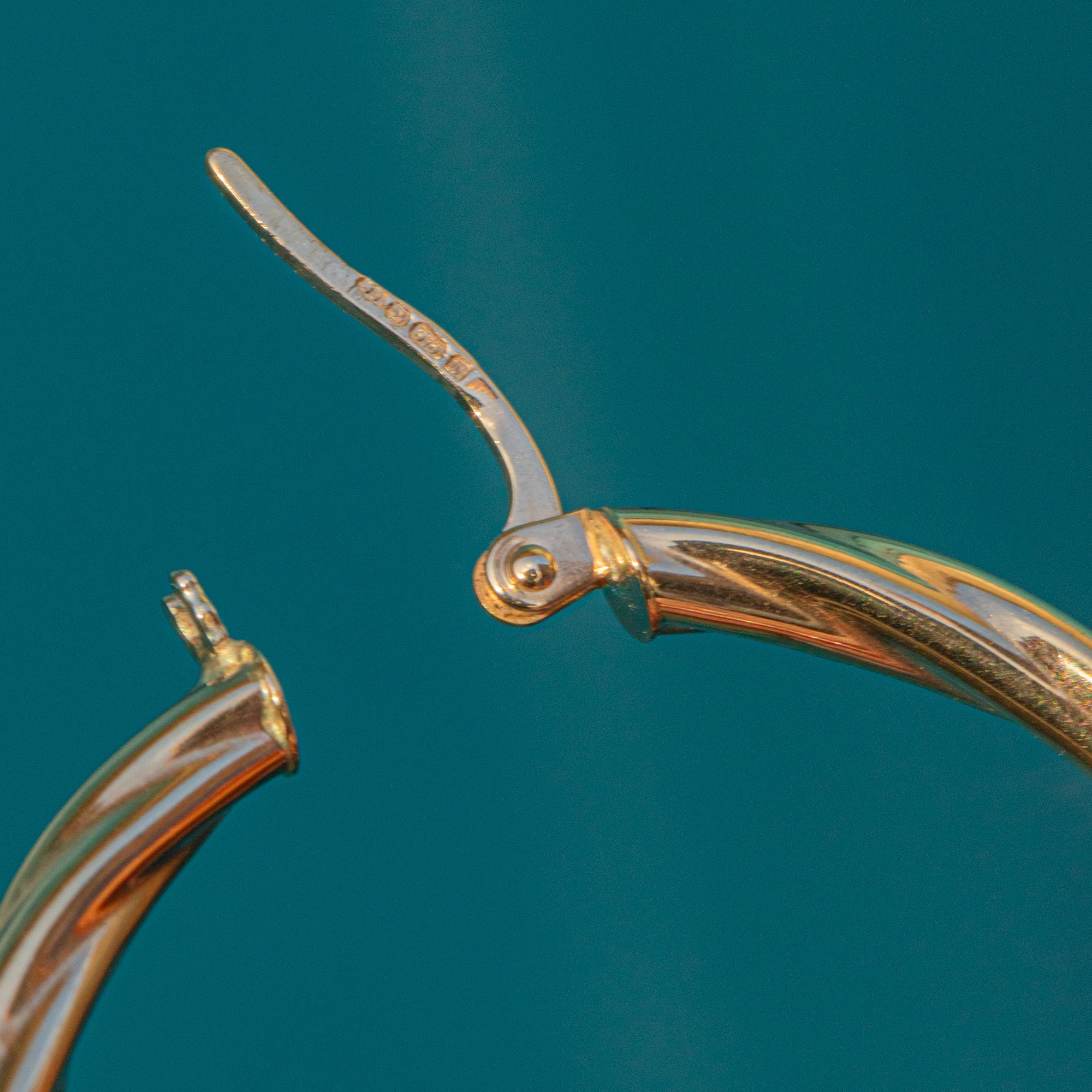 EXCELLENT. These 9ct Gold twisted hoop earrings are in excellent condition. The Gold is buttery and is free from any notable scuffs or scratches. Her hooks are secure and with little else to note, they are a must-have pair!
