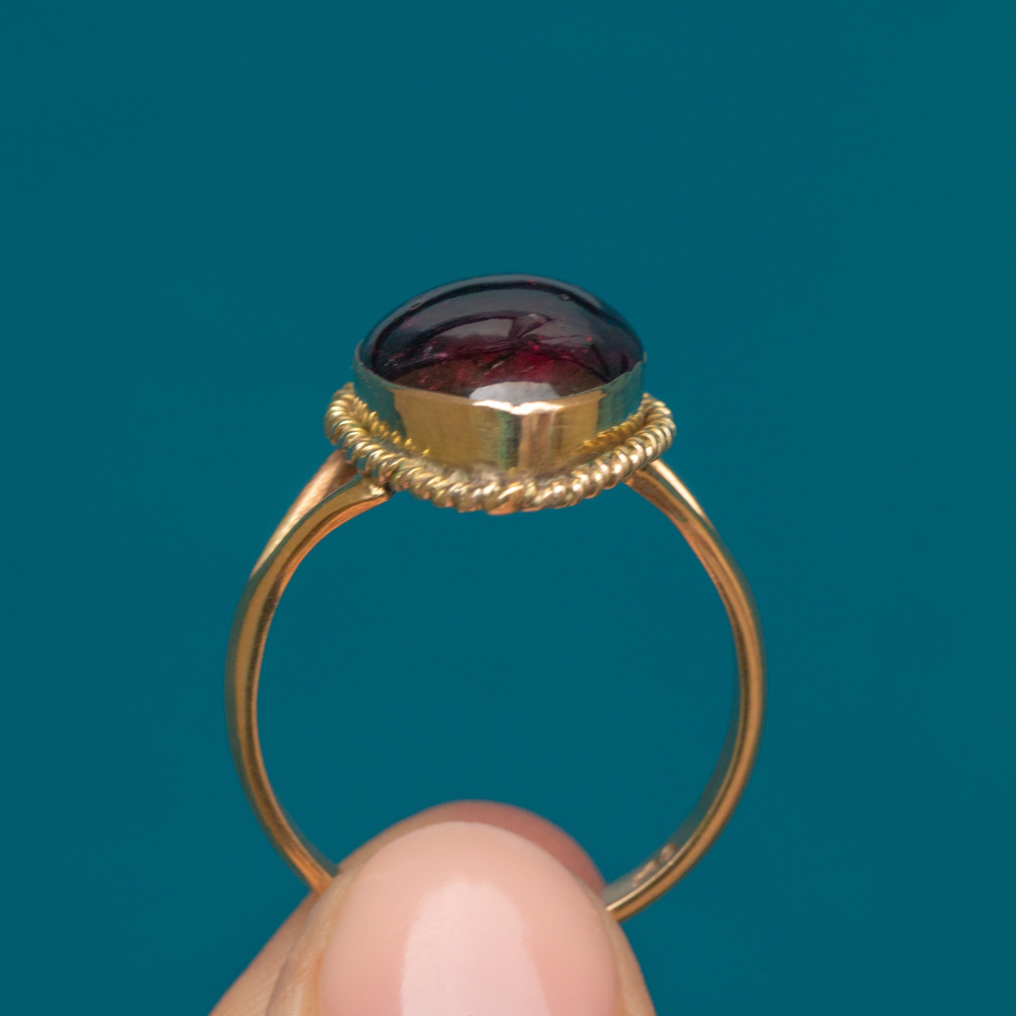 Wrapped up in buttery 9ct Gold, the smoothly cut Garnet cabochon is displayed proudly within a decorative rope border. With elegant tapered split shoulders and excellent finger coverage, this outstanding piece of history will bring Victorian gothic glamour to your repertoire!